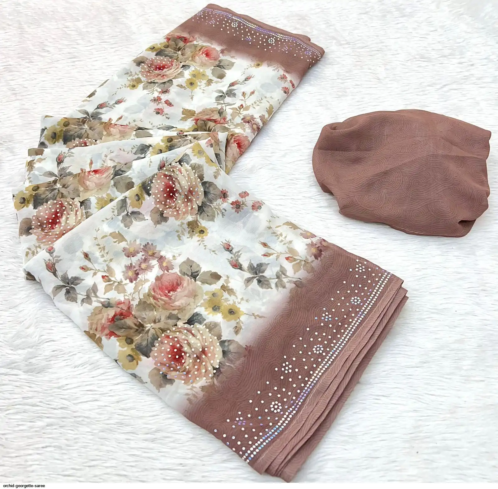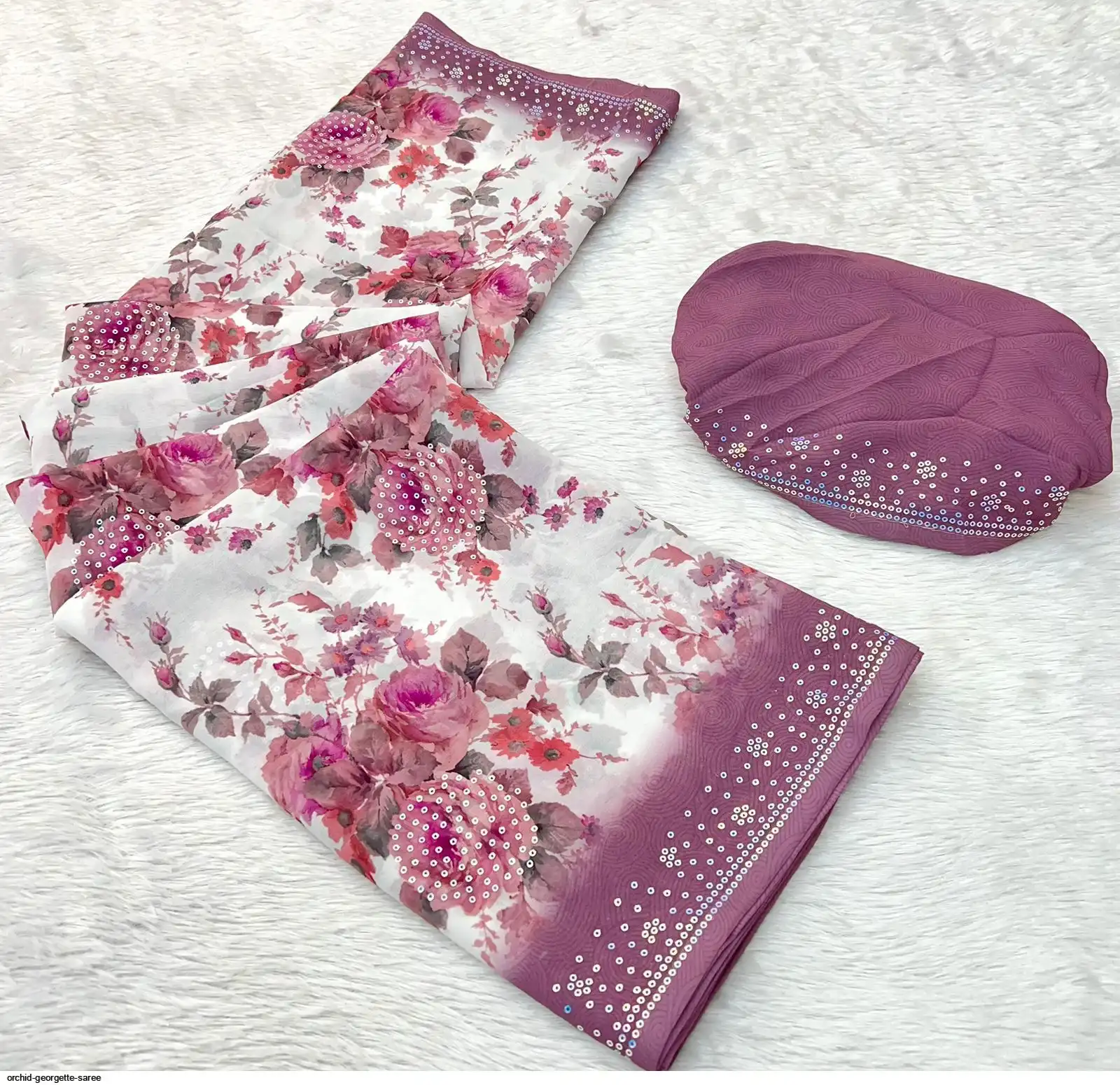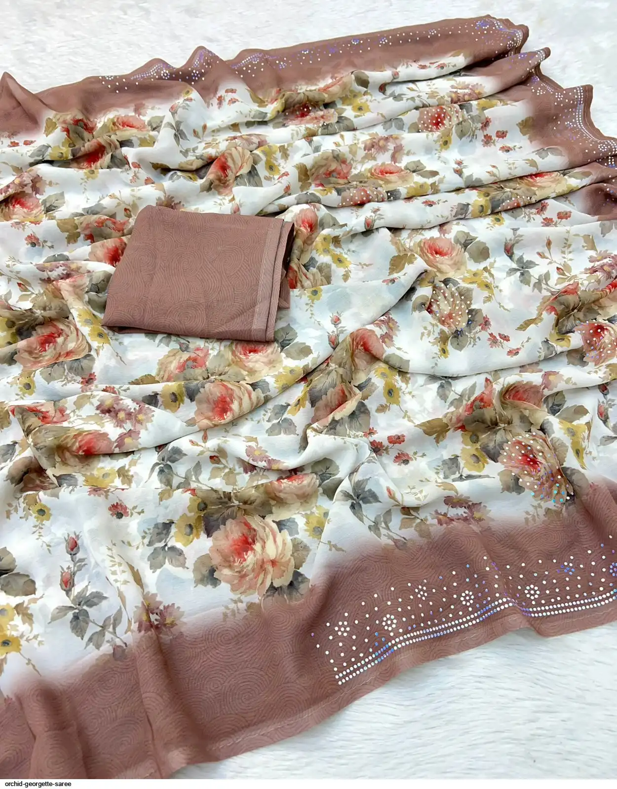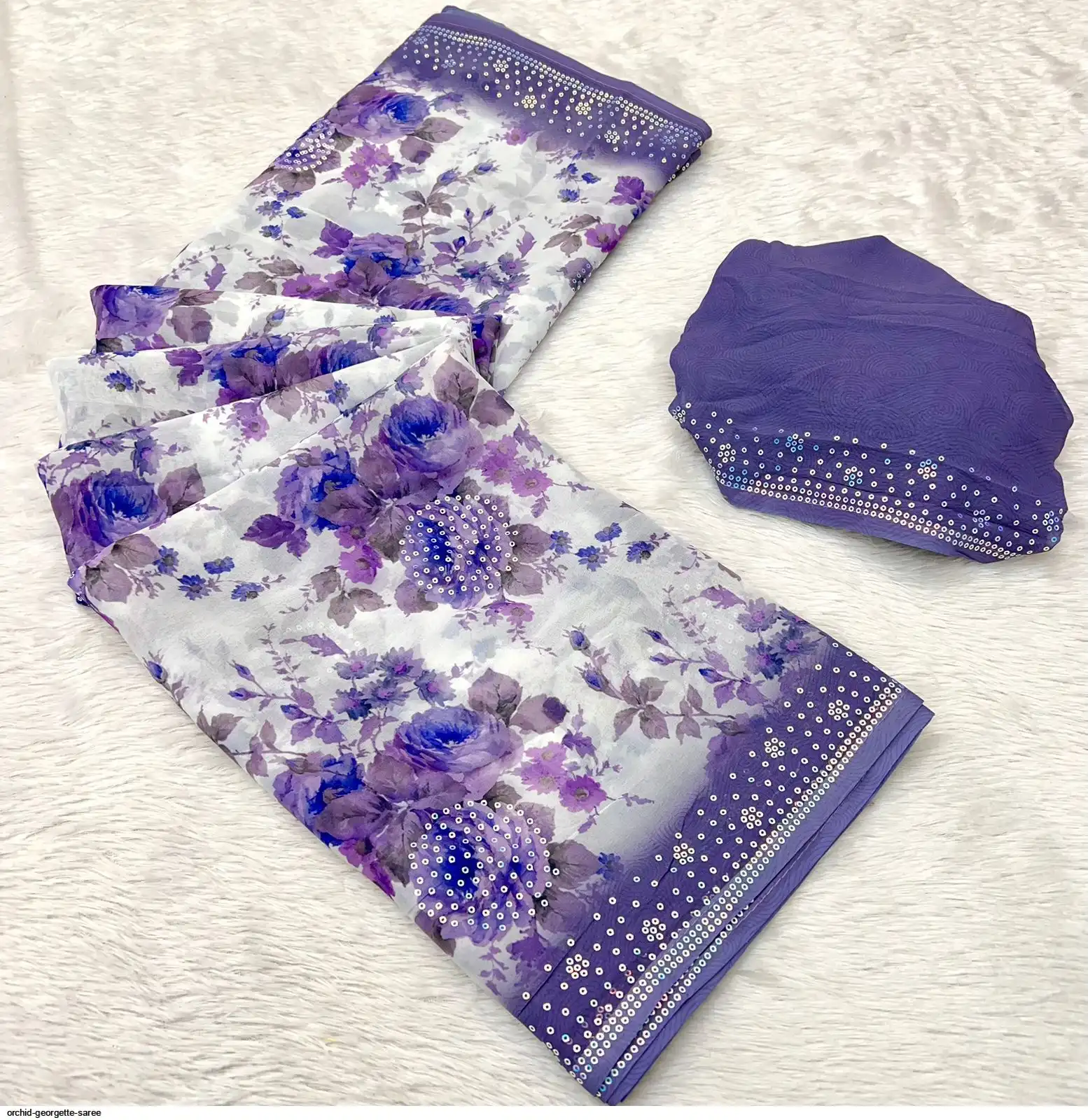 Fabric - Soft Georgette Fabric Beautiful Floral 3D Digital Print And Fancy Sequence In Body & Border With Runing Blouse