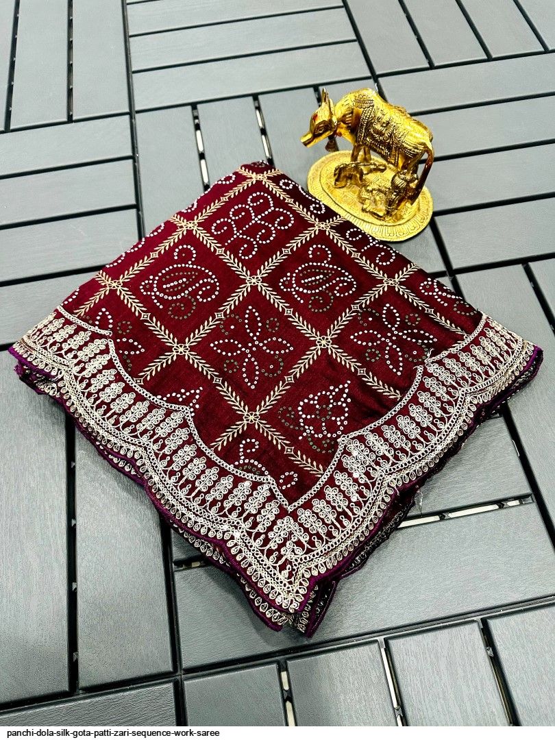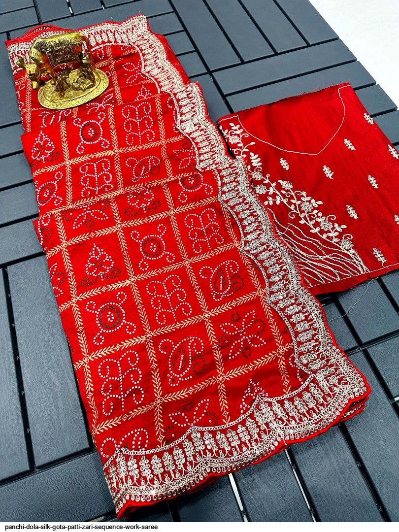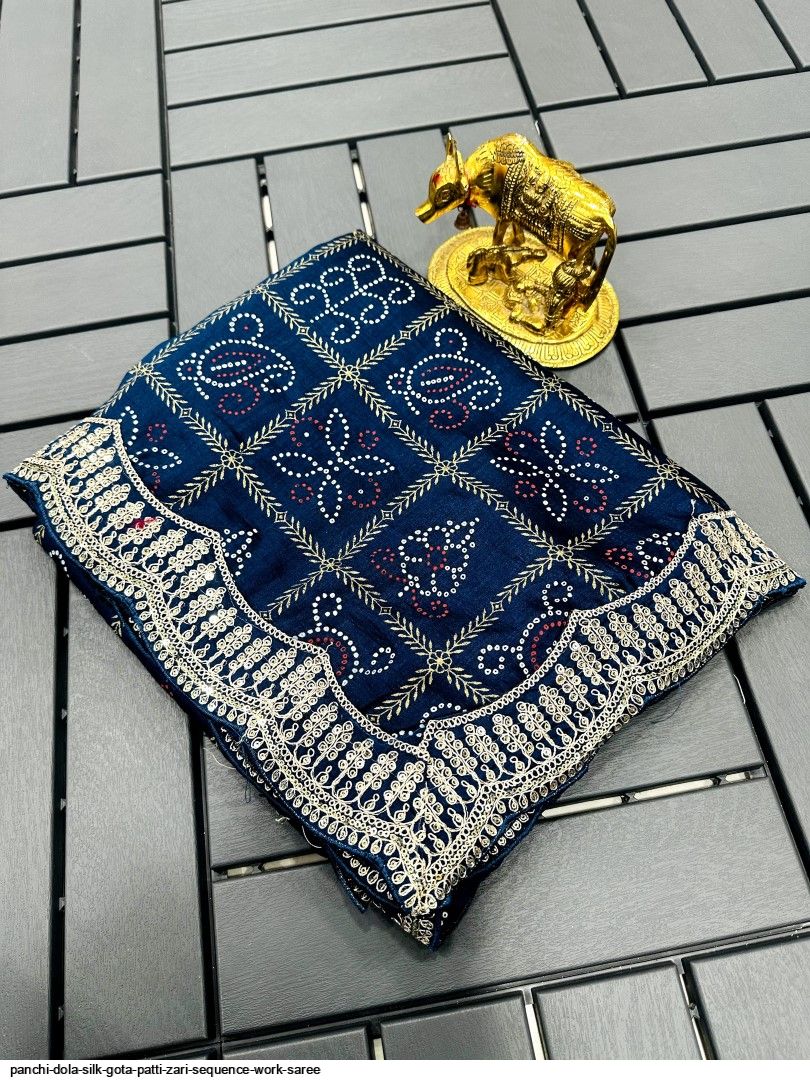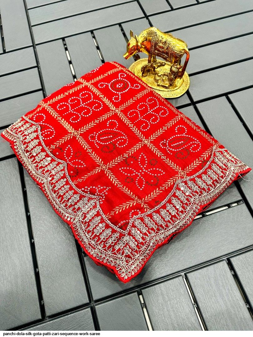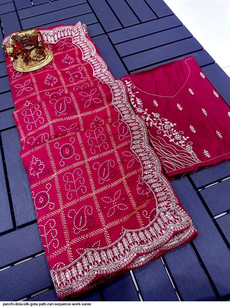 Fabric :~ Pure Dola Silk on Gota Patti Zari & Sequence Work Beautiful Design which in Border & All over Foil Print in Saree concept also giving unique