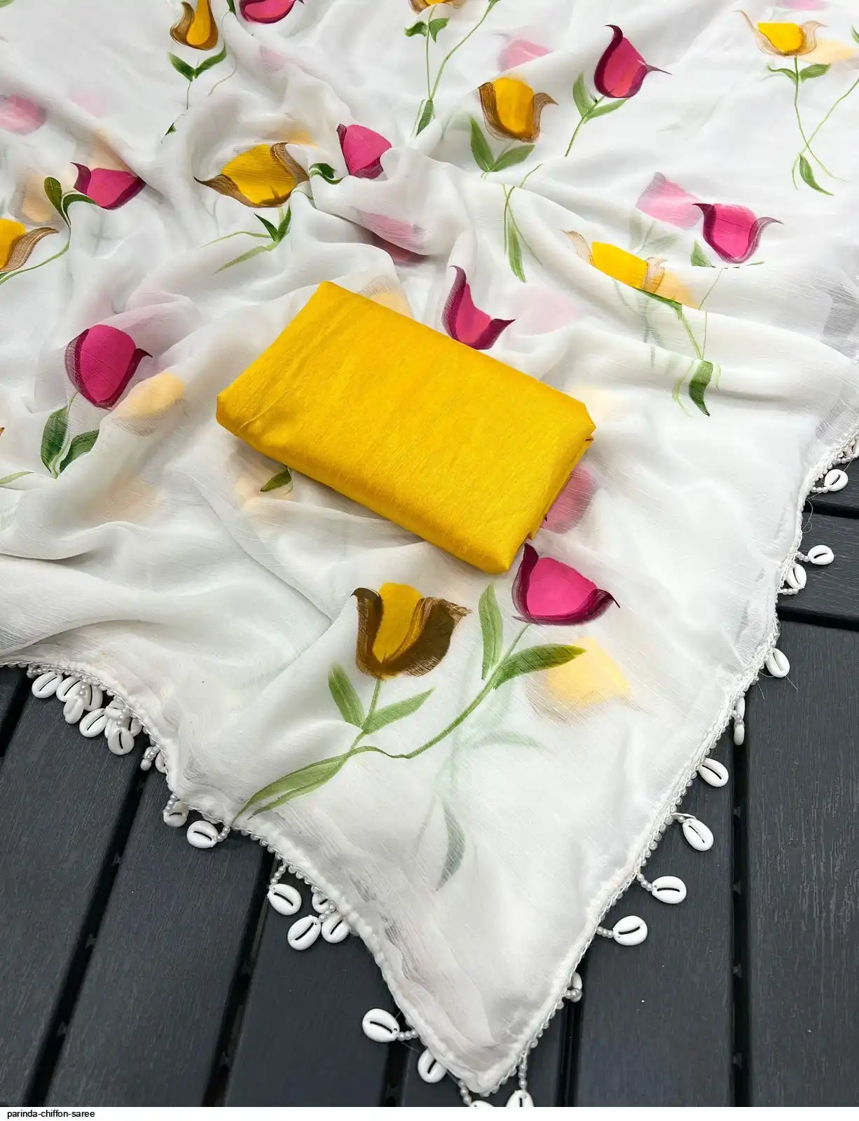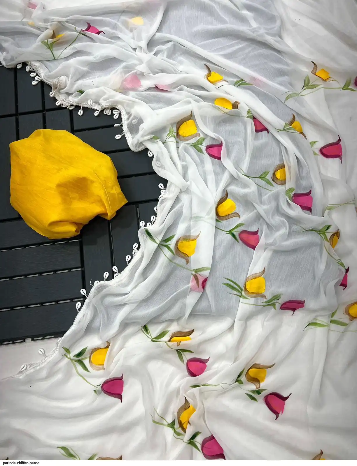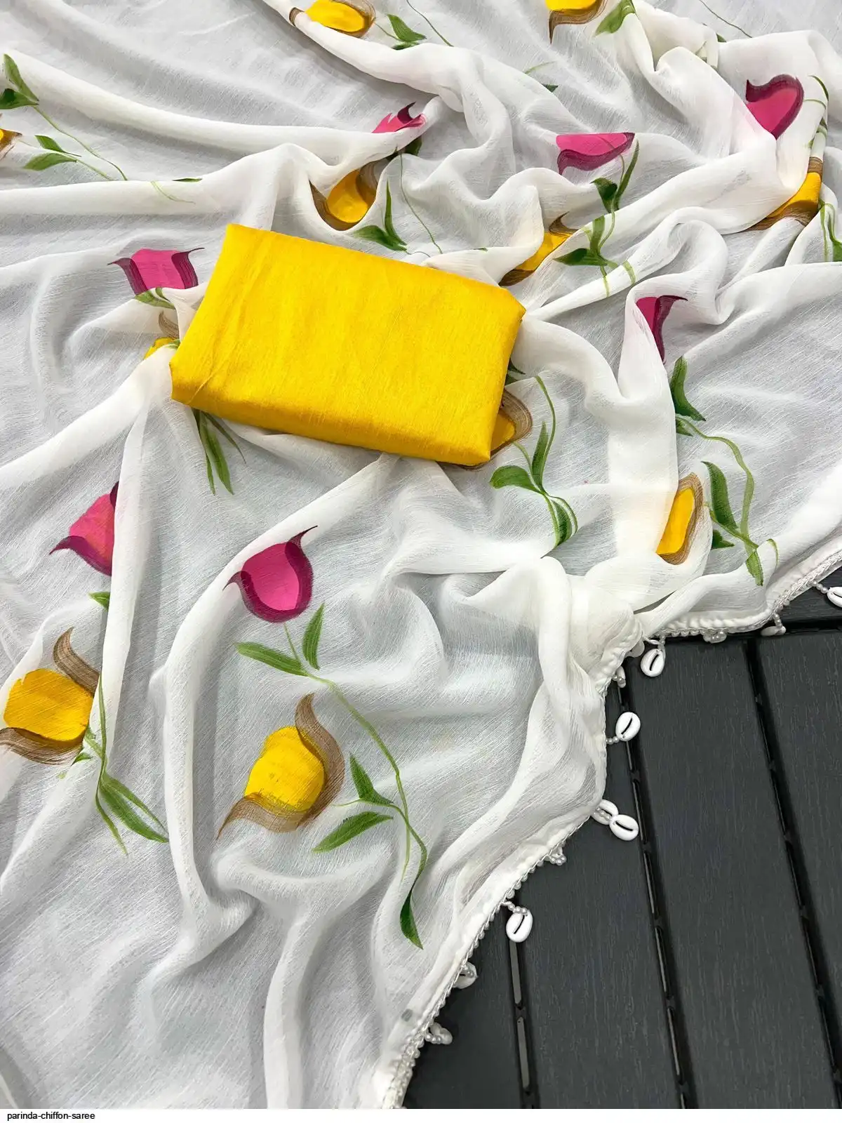 Fabric - Chiffon Fabric With Beautiful Floral Handbrush Print And Fancy (Kabadi ) Lace Bordar With Contrast Art Silk Blouse