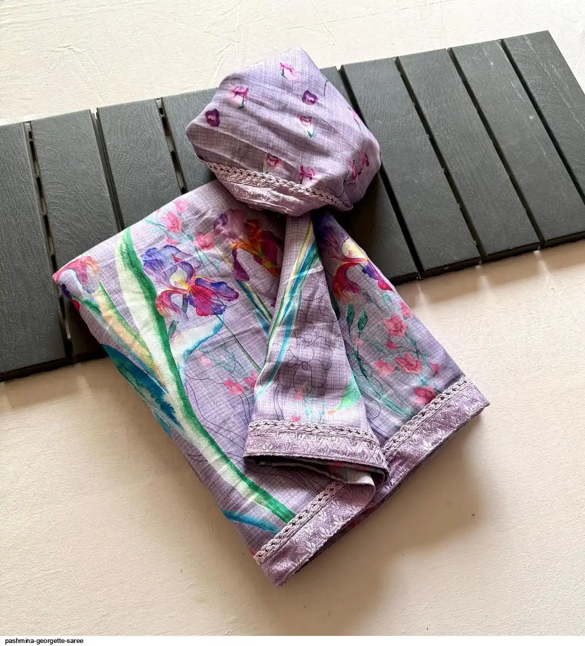 Fabric - Pashmina Georgette Fabric Beautiful Digital Print And Atached Embroidery Weaving Border With Flower Digital Printed Blouse