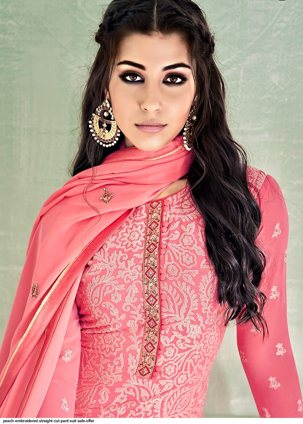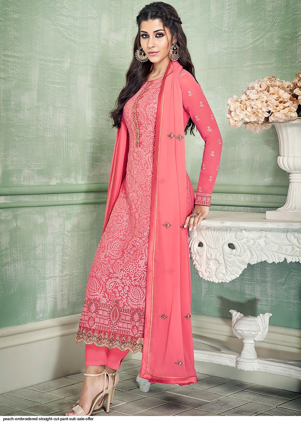 Featuring a peach colored straight cut kameez in georgette crafted with intricate thread embroidery, lace and stone work. Accompanied by a matching color shantoon pant and a peach chiffon embellished dupatta with lace details.