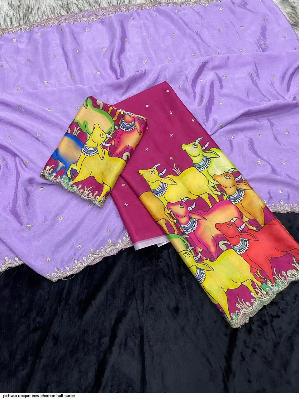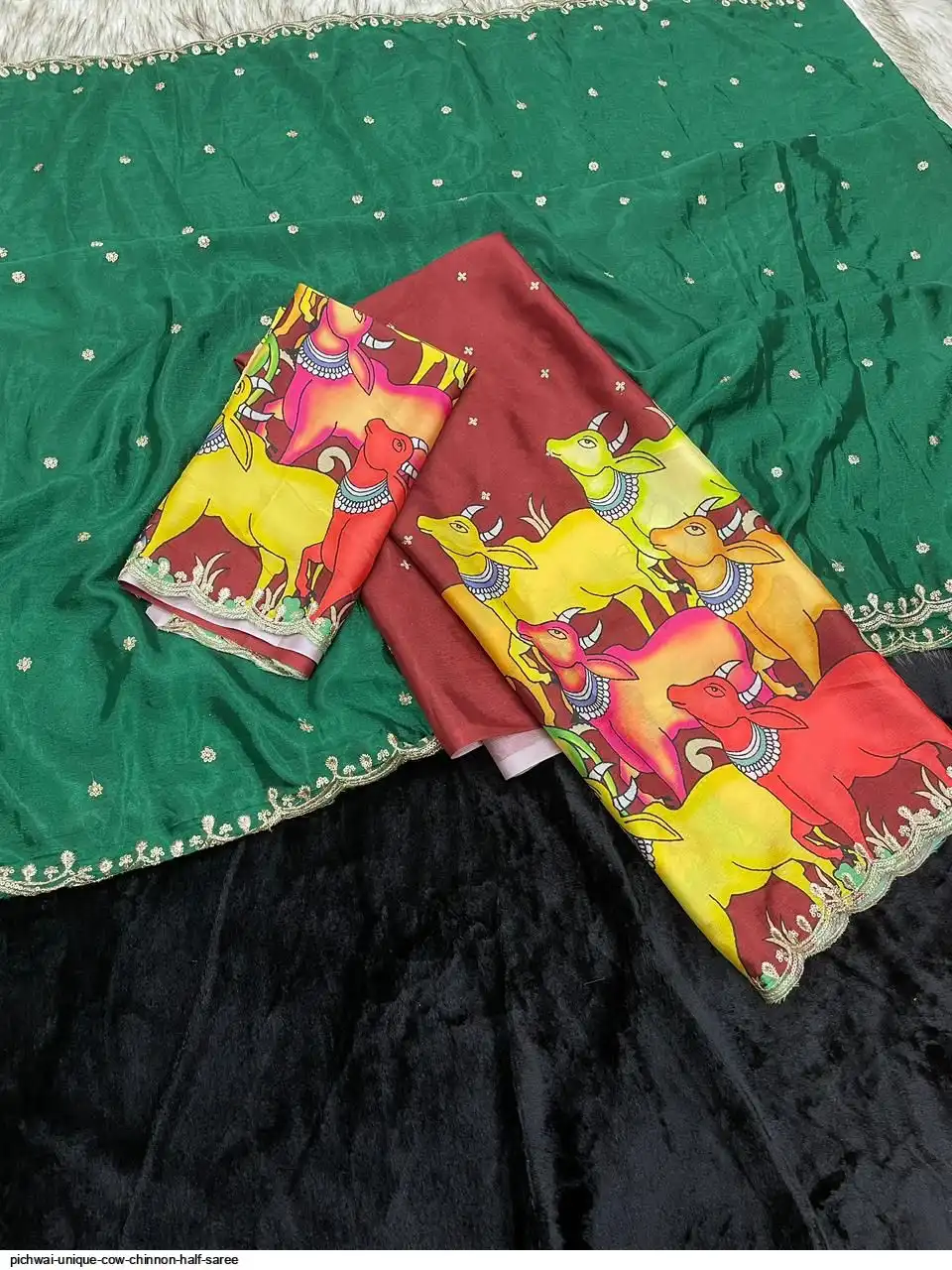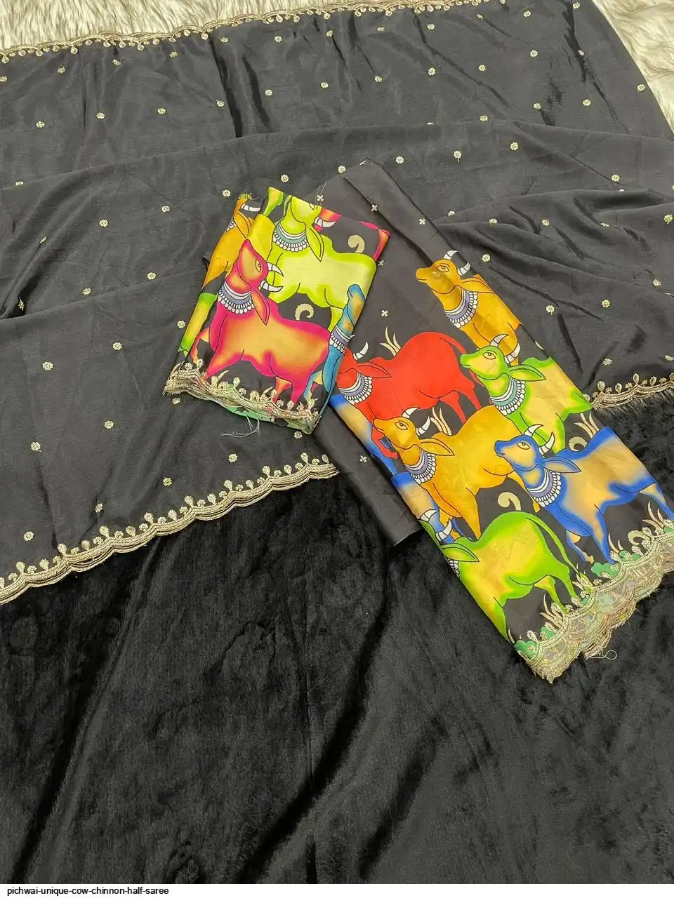 Pichwai Cow Chinnon half saree with beautiful print with embroidered golden worked butti with cutwork border