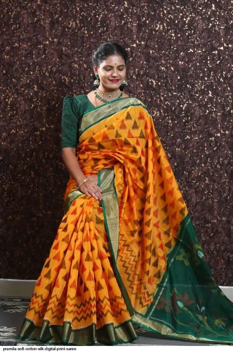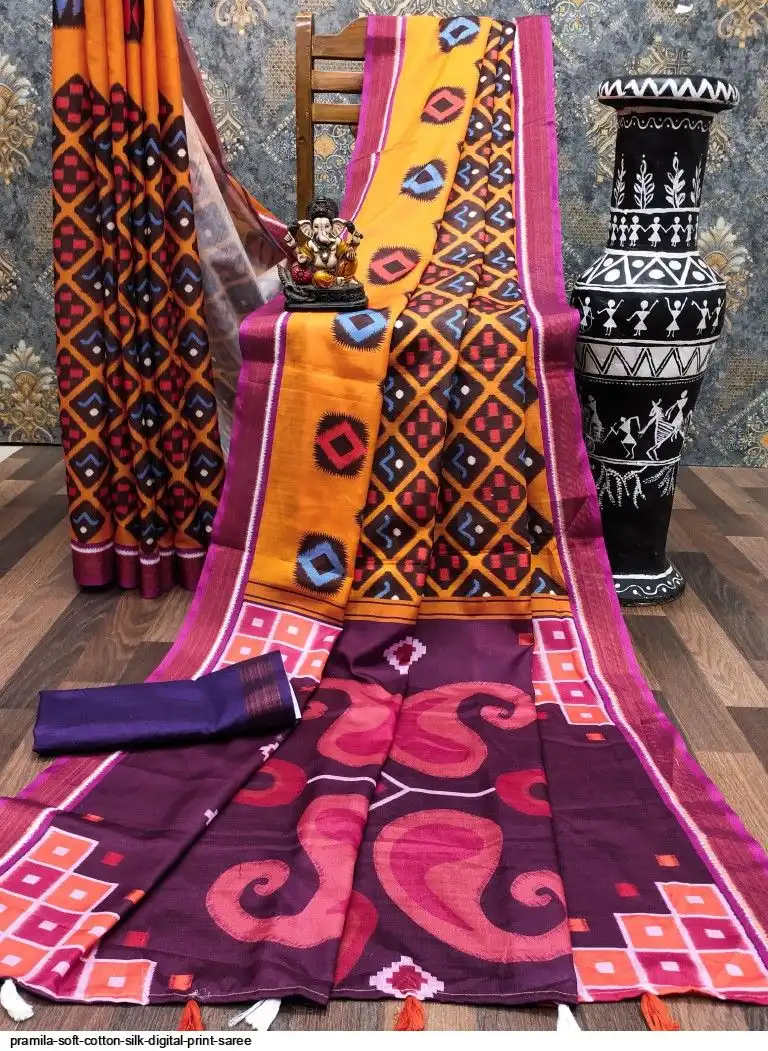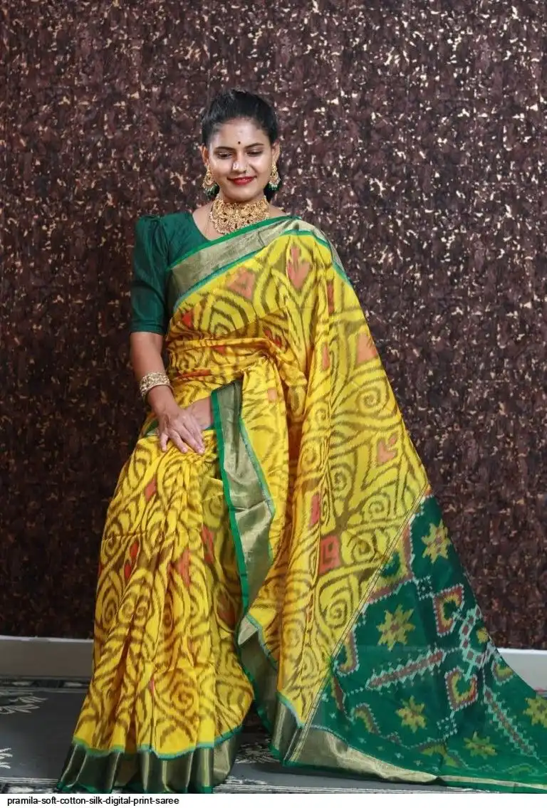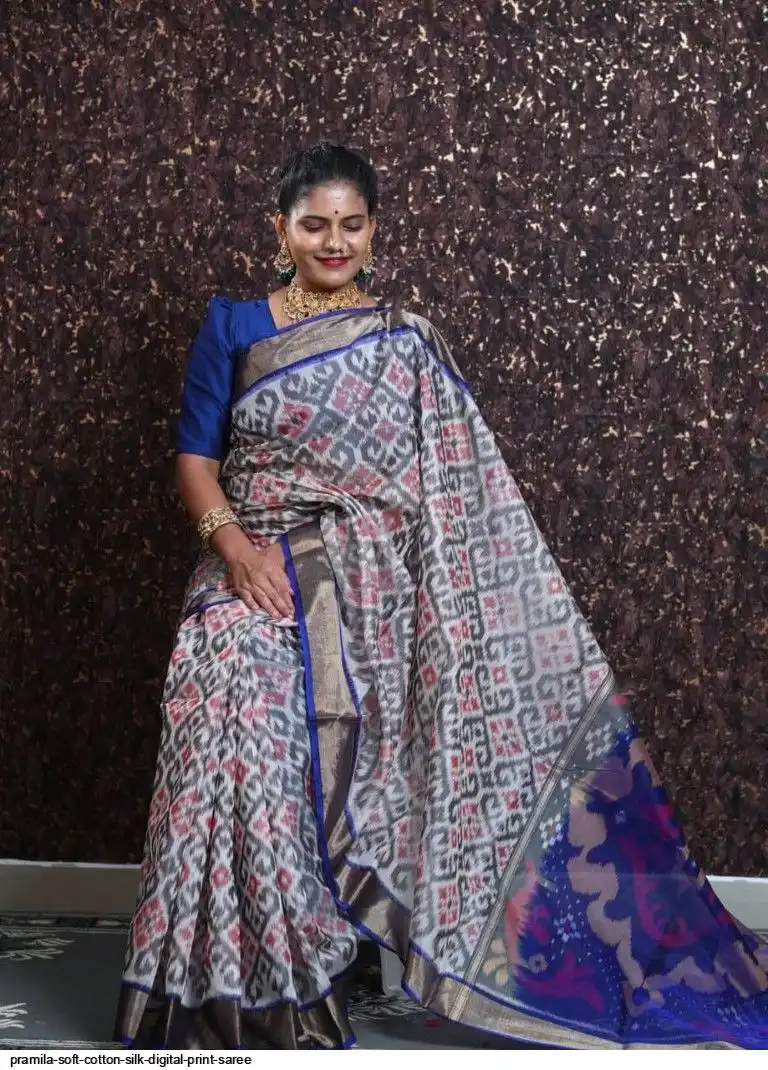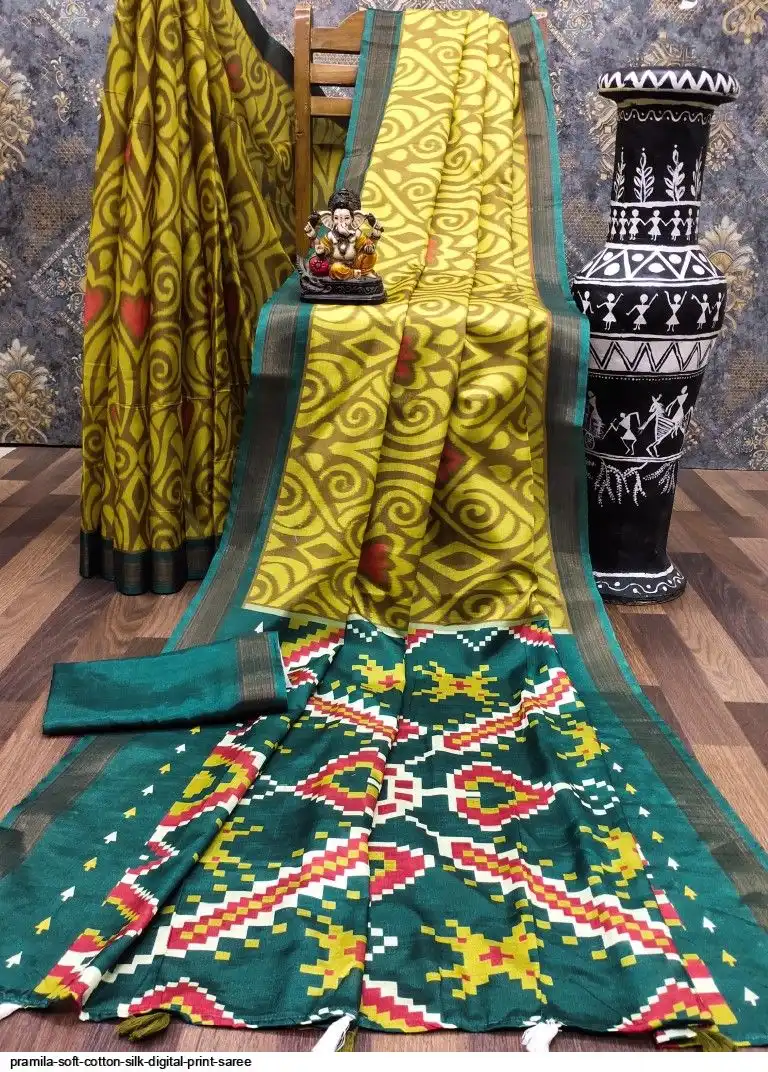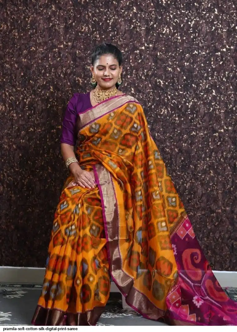 It Has Ikkat Patola Digital Print All Over The Body With Golden Weaving Border And Contrast Digital Printed Ikkat Design Pallu