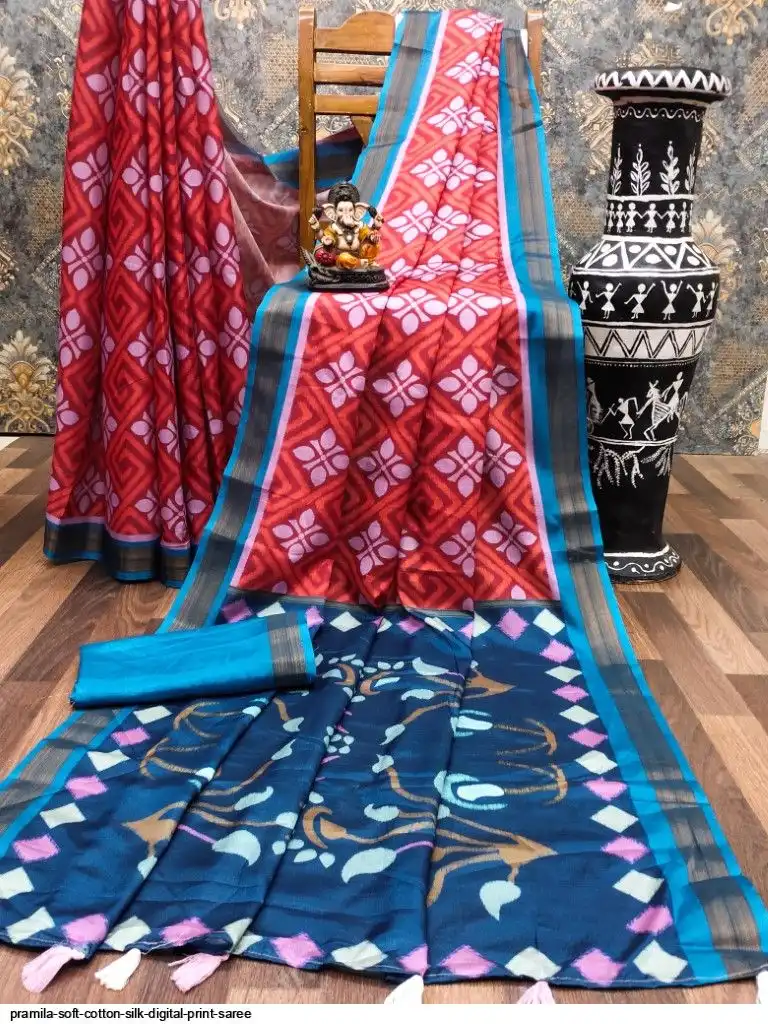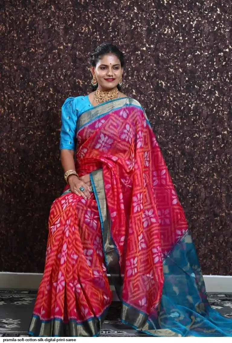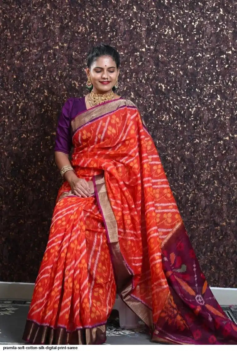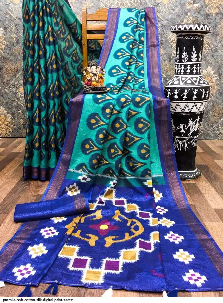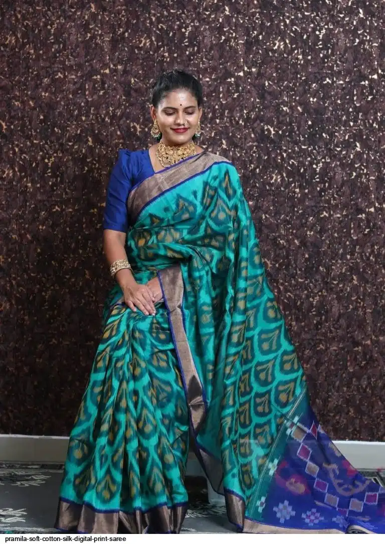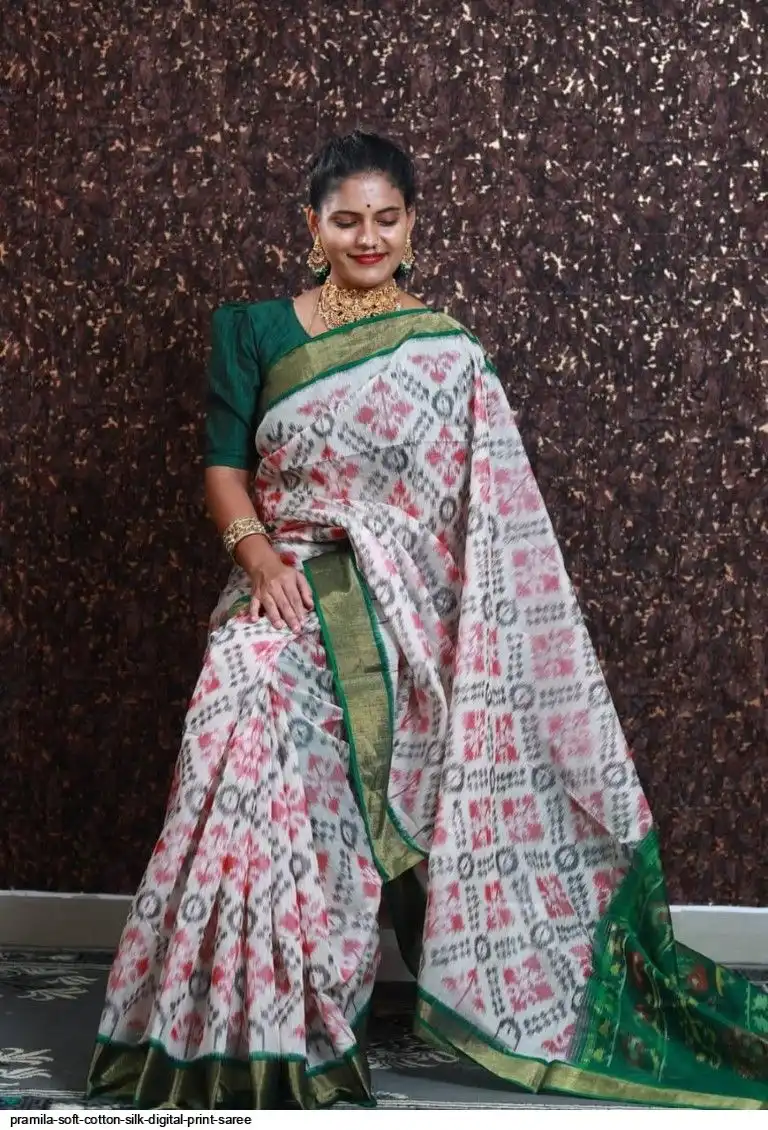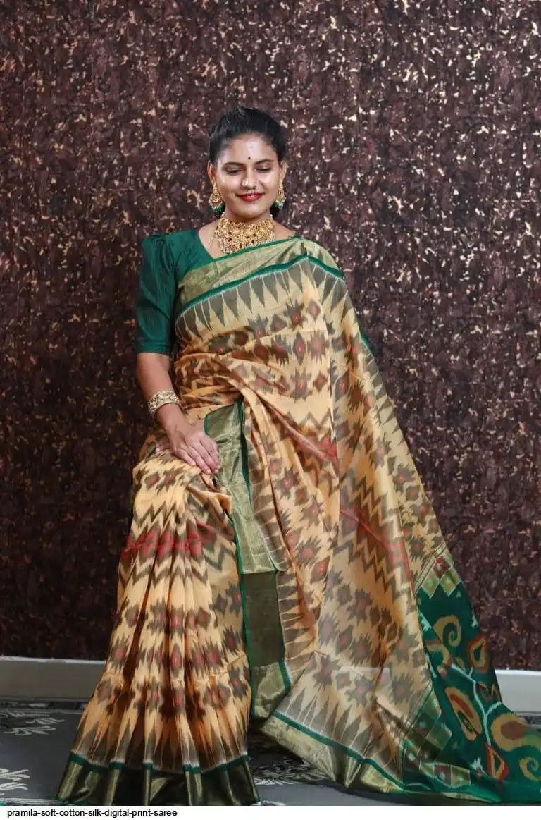 It Has Ikkat Patola Digital Print All Over The Body With Golden Weaving Border And Contrast Digital Printed Ikkat Design Pallu