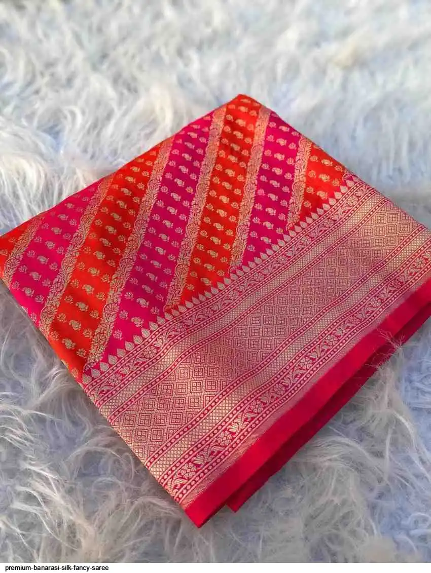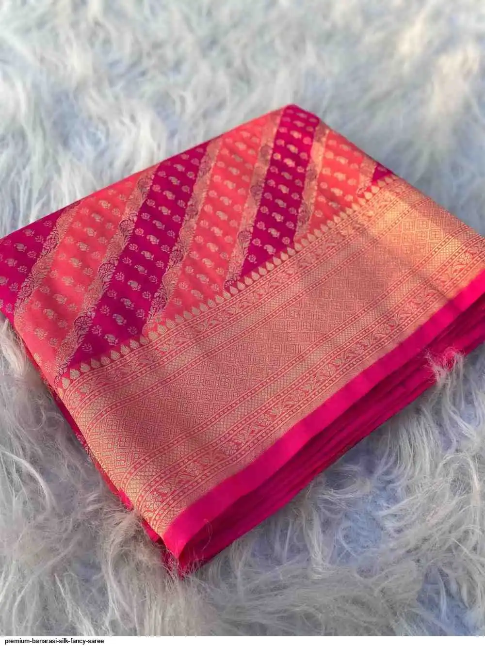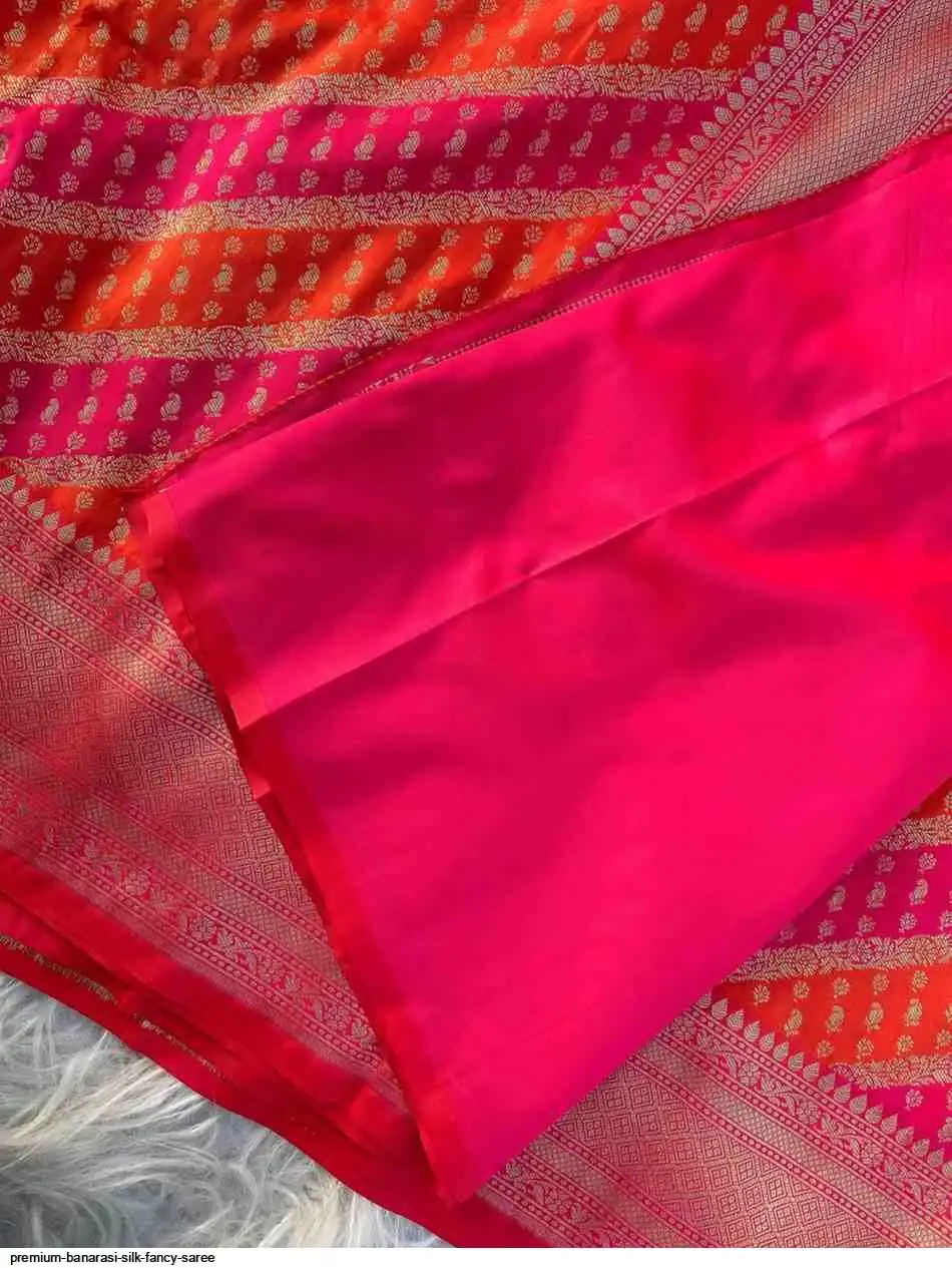 Description - Premium banarasi silk sarees with all over Rangkat leheriya weaves, Contrast pallu.