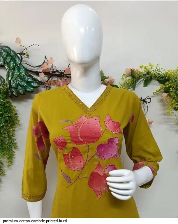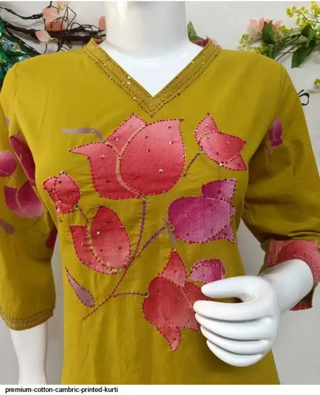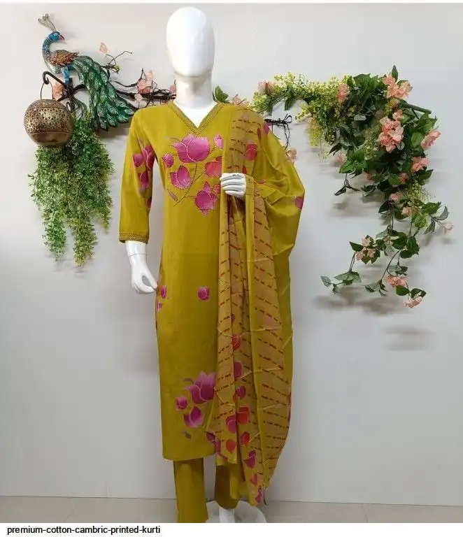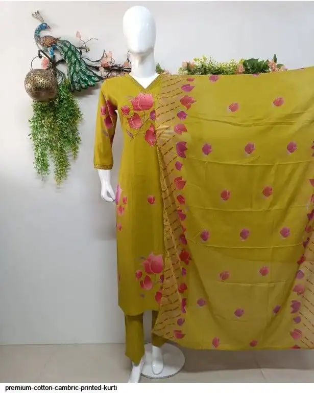 Premium Quality Cotton Cambric printed straight kurti with Thread and Hand work....with cotton Dyed pant and full size Cotton printed dupatta...
