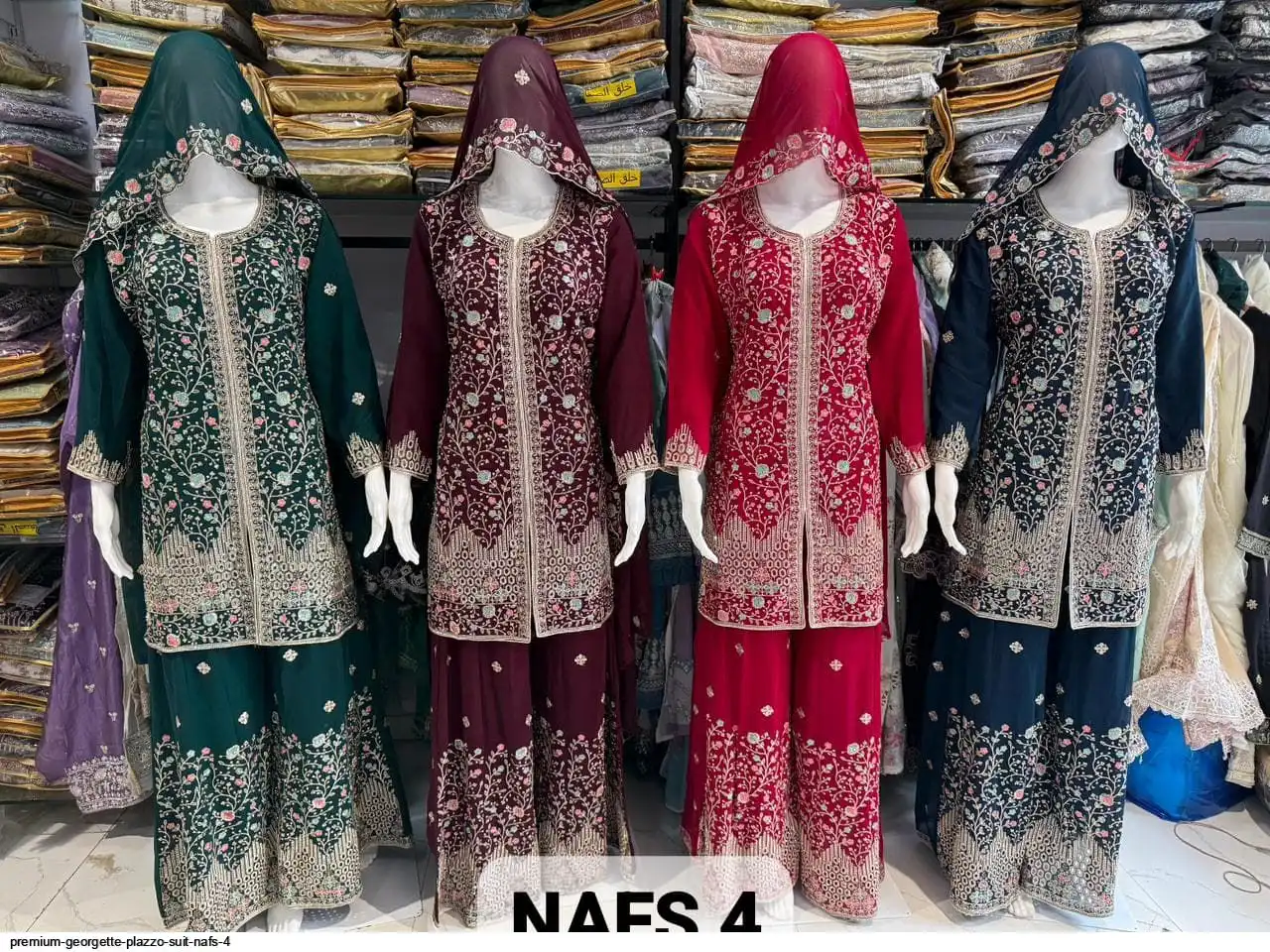 Top :- PREMIUM GEORGETTE WITH SHERWANI STYLE, FULL EMBROIDERY AND FULL ZARKHAN DIAMOND Attached inner