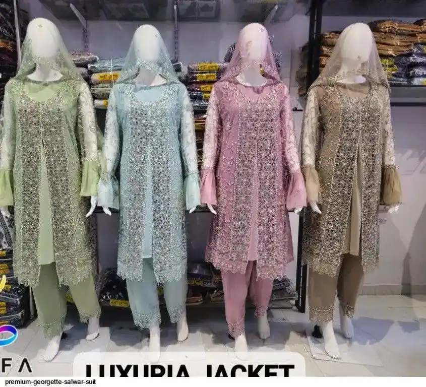JACKET :- PREMIUM NET WITH FULL ZARKHAN DESIGNER FRONT AND BACK EMBROIDERY AND DESIGNER PETALS WITH GLASS Diamonds