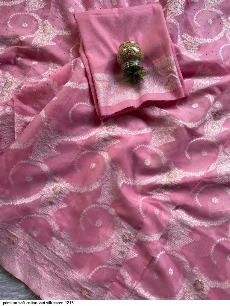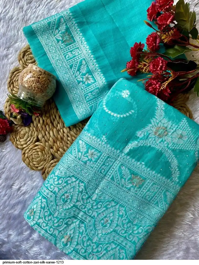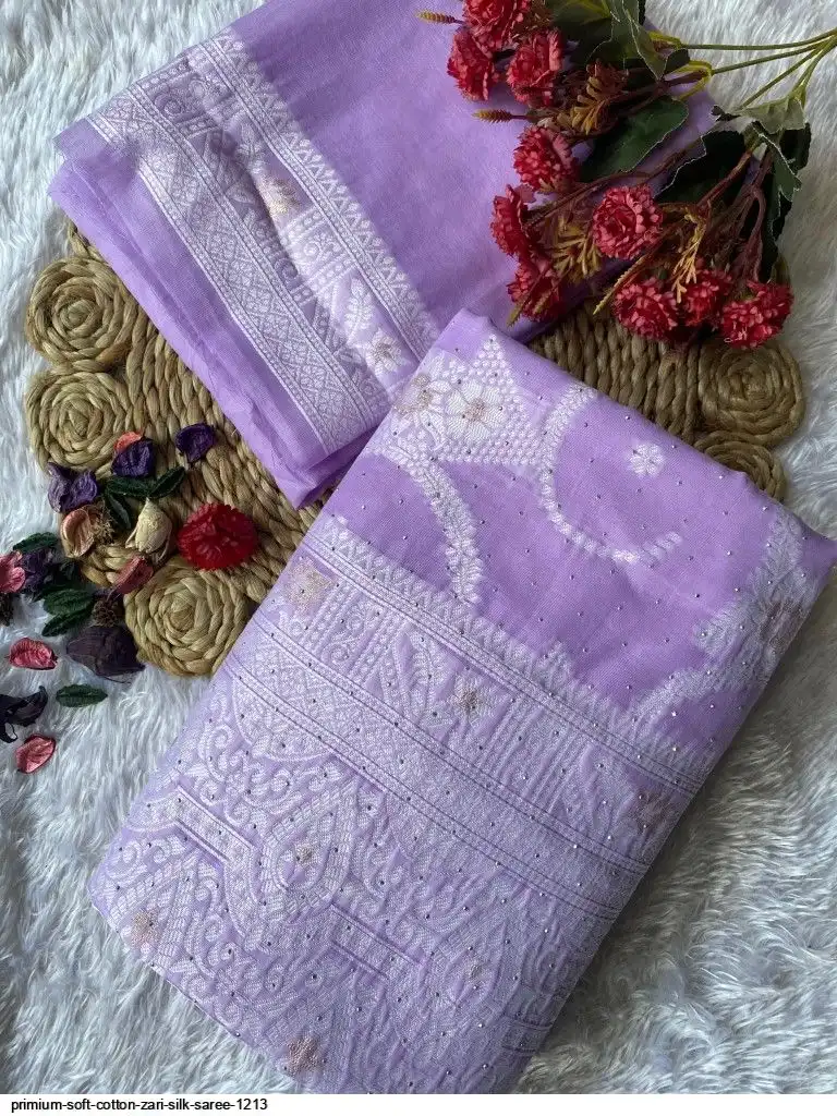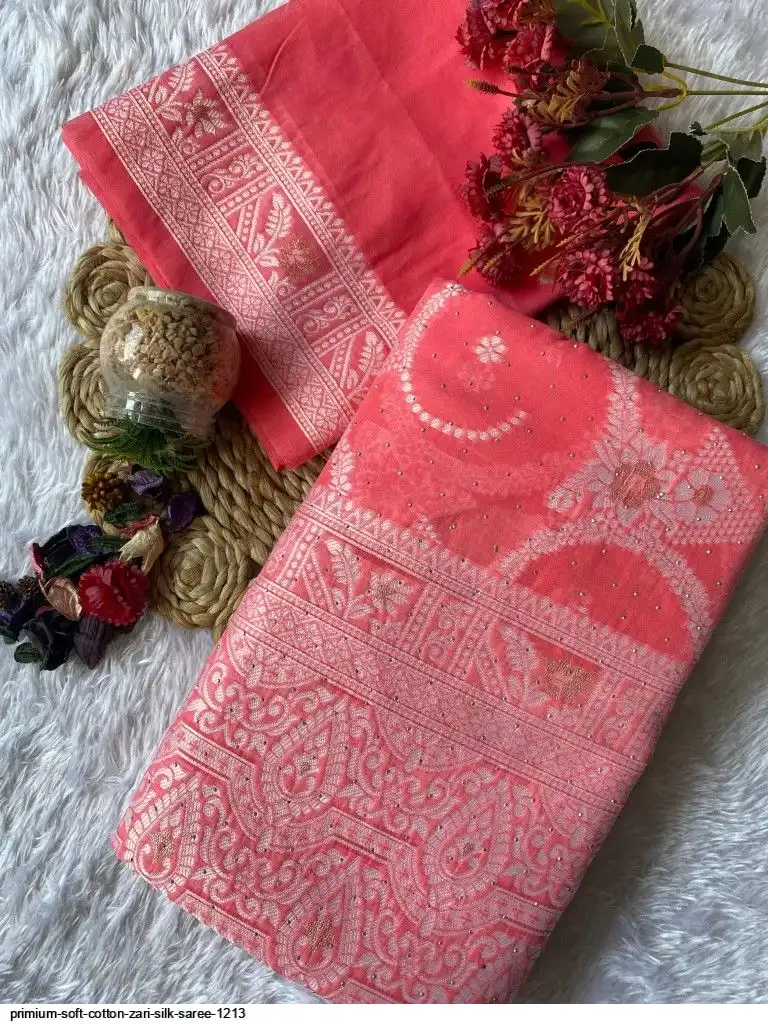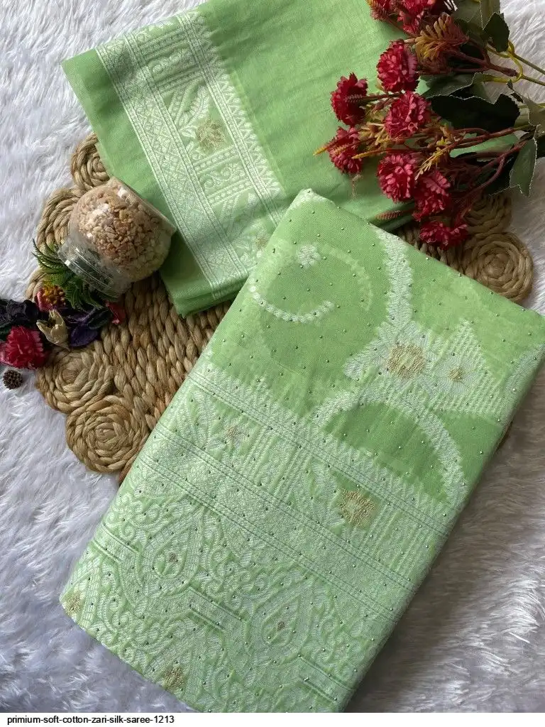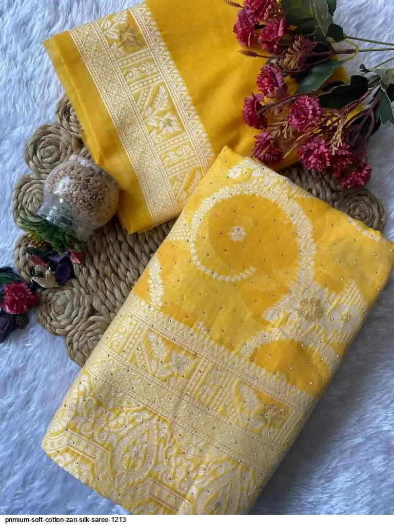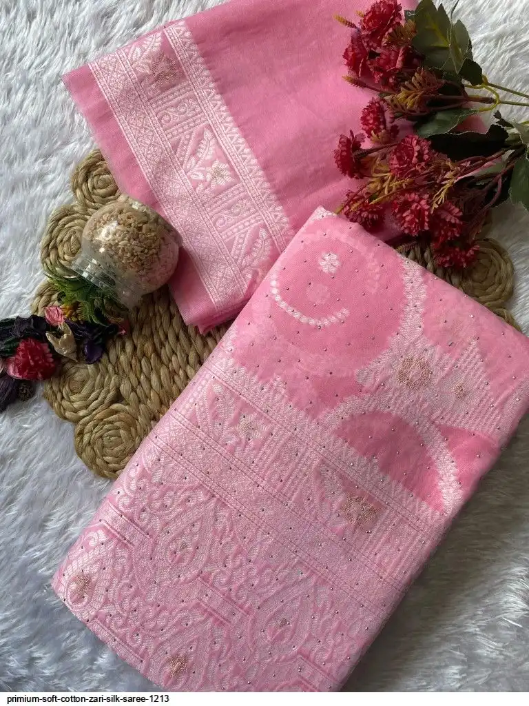 Primium Soft Cotton Spun Zari Silk Saree With Sirvoski Work And Heavy Tussles