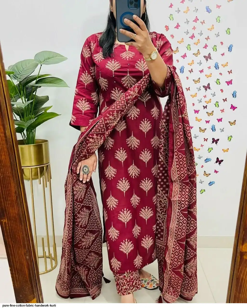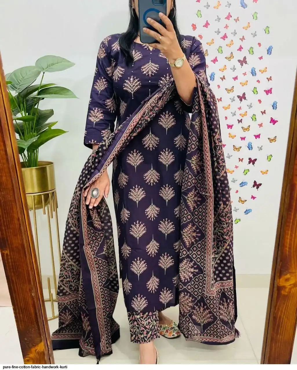 Pure fine Cotton 60-60 fabric Handwork Kurti Paired Cotton Pant with Cotton Dupatta