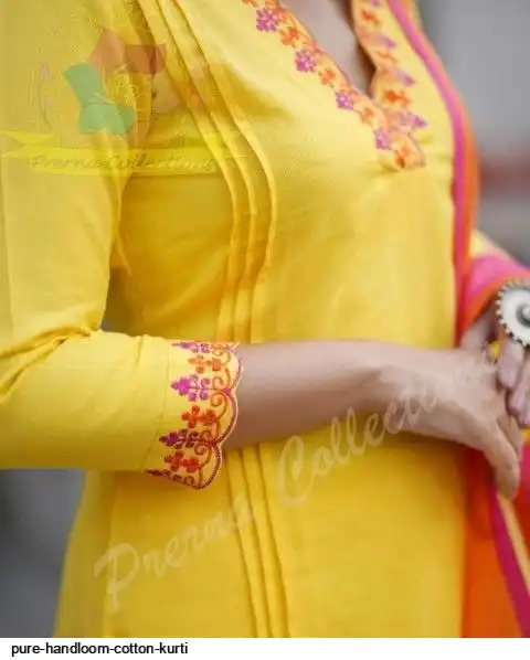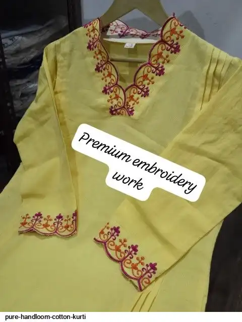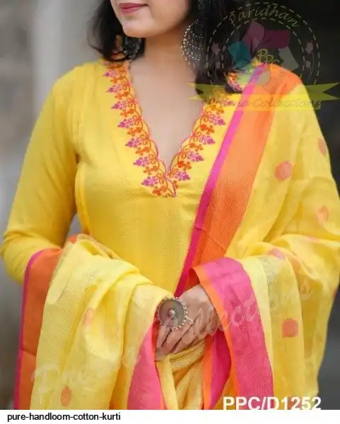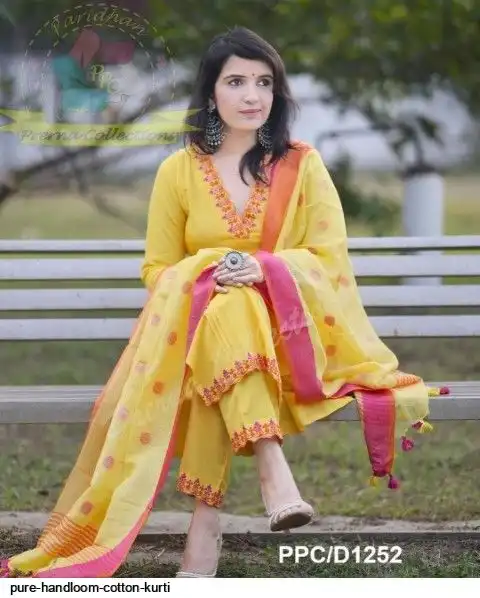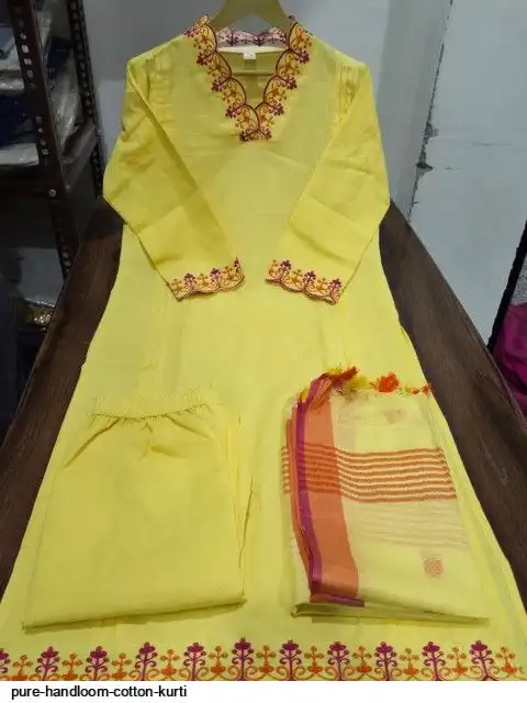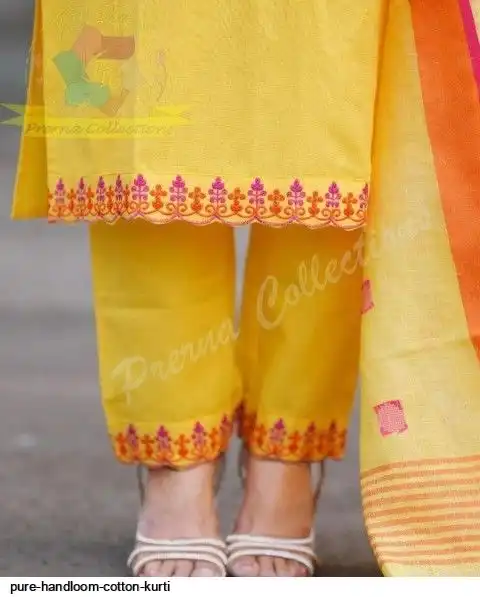 Pure handloom cotton kurti with embroidery work on hem, cut work and pintex details paired with embroidered cotton pant and pure handweaved linen dupatta to complete the look