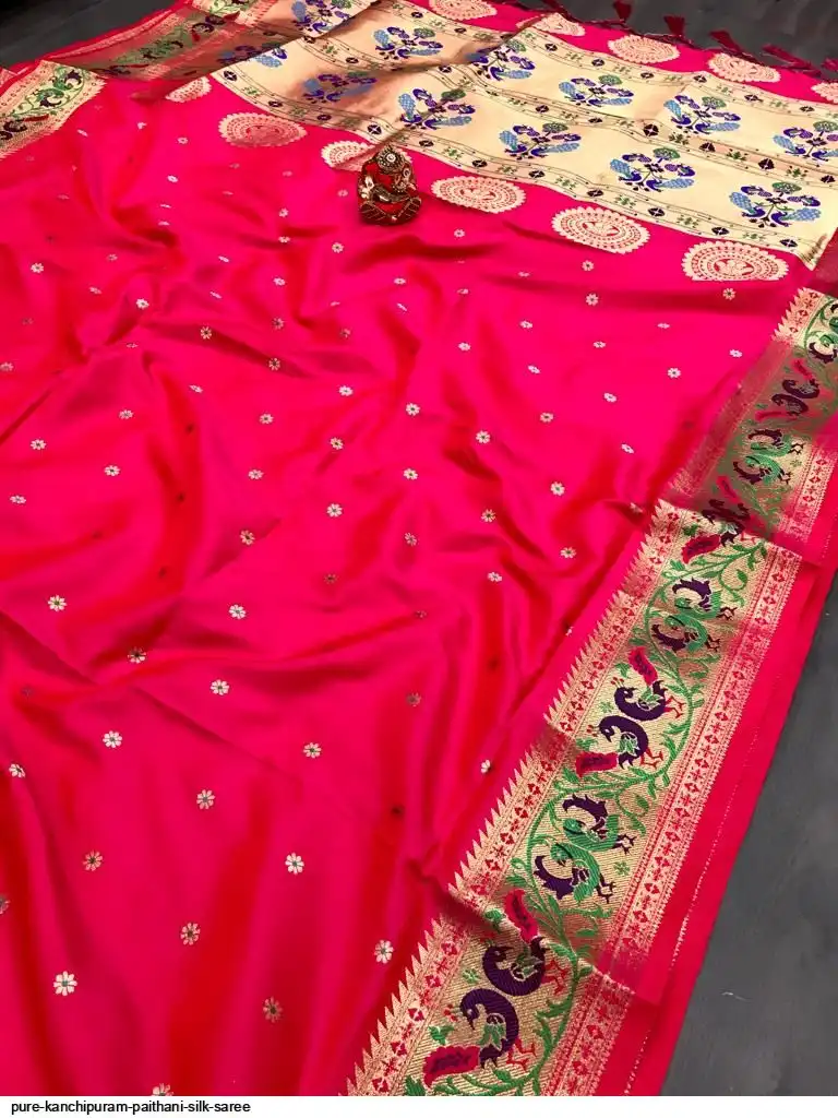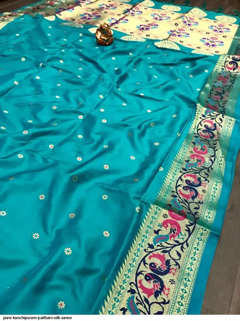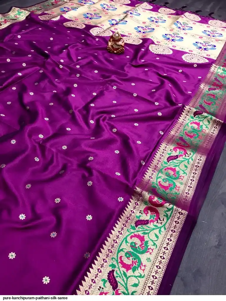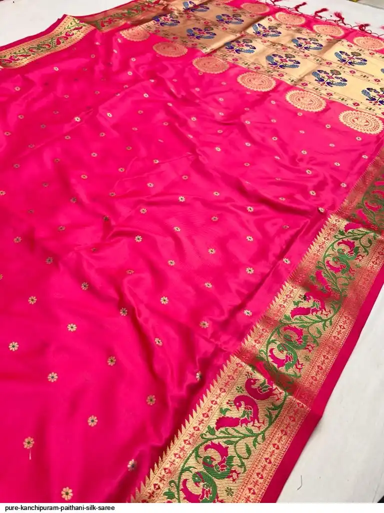 Fabric :- Pure Kanchipuram Banarasi Lichi silk jequard saree with attractive Kanchipuram colorful peacock & Perrot design border and nice Pallu with tussal.