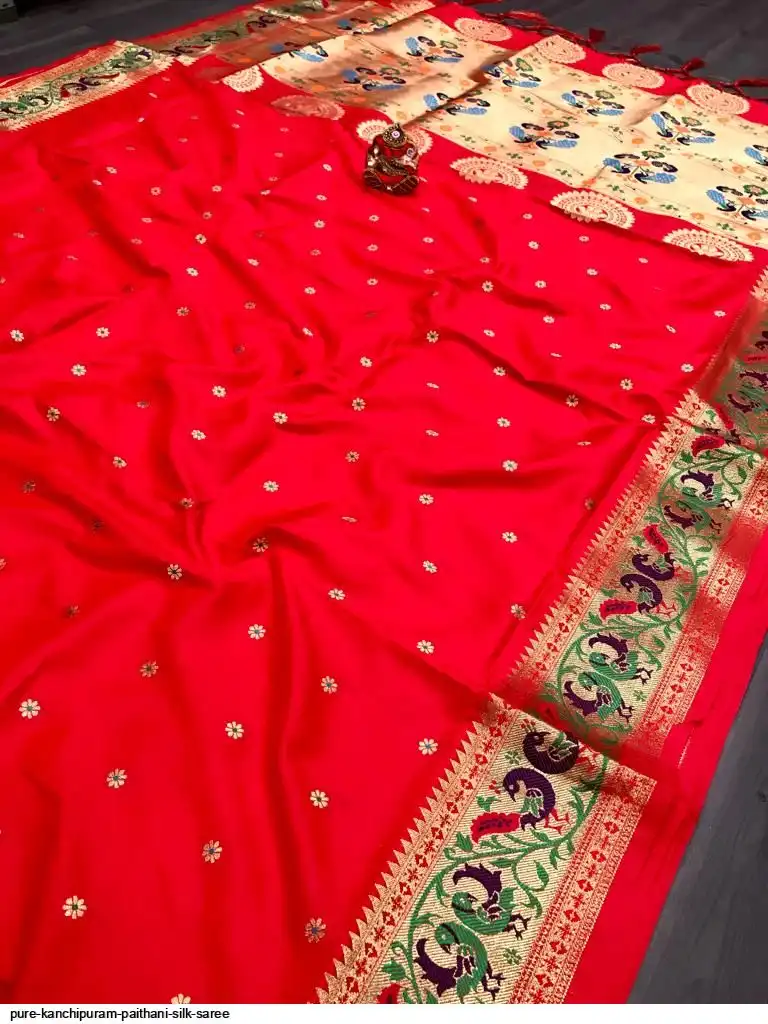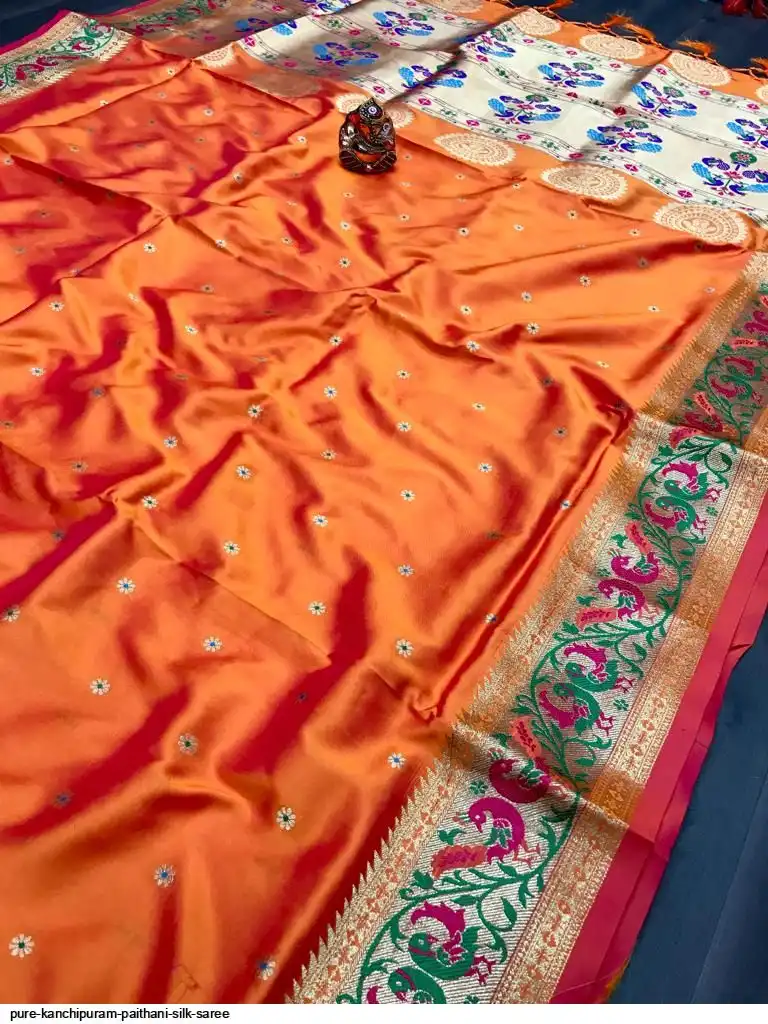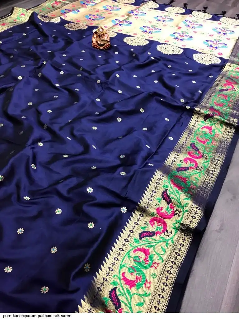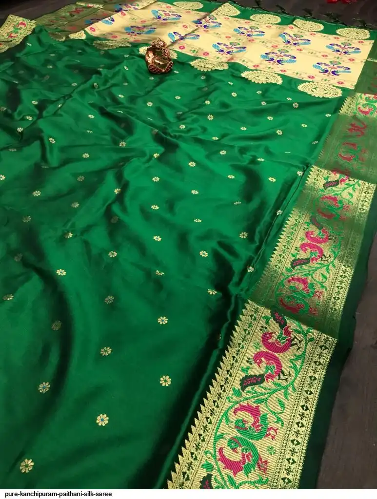 Fabric :- Pure Kanchipuram Banarasi Lichi silk jequard saree with attractive Kanchipuram colorful peacock & Perrot design border and nice Pallu with tussal.