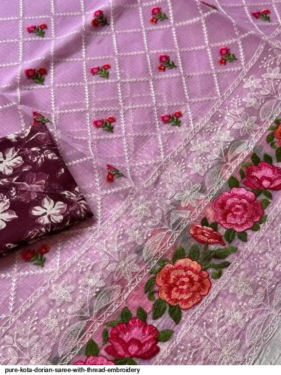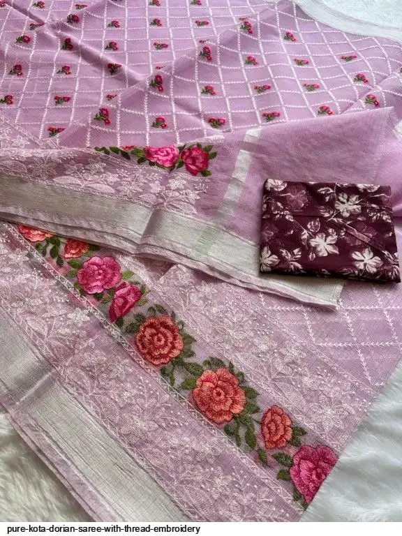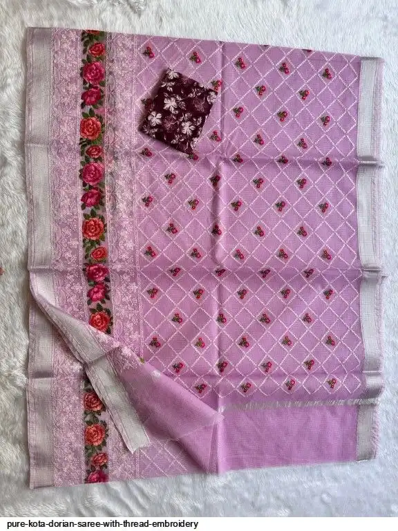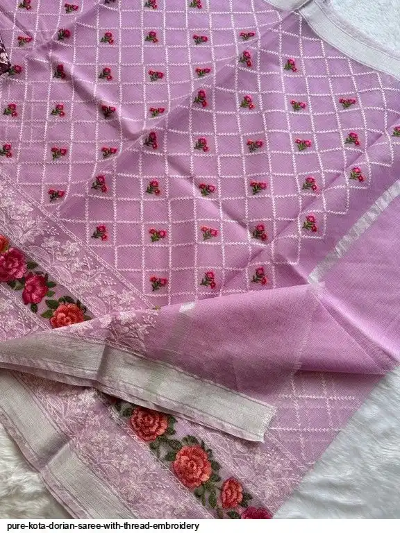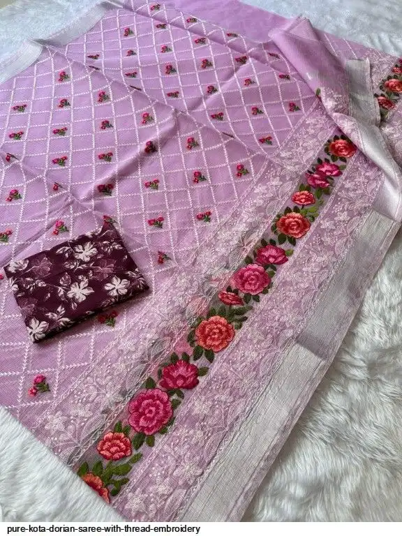 Pure Kota Dorian Saree With Thread Embroidery All Over Saree and Running Blouse