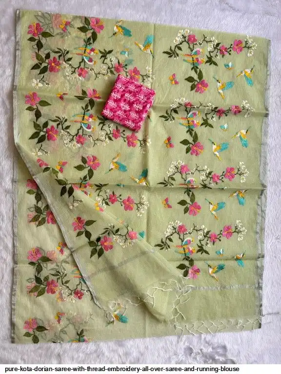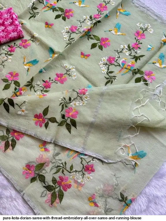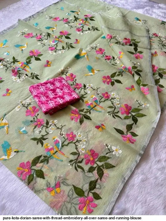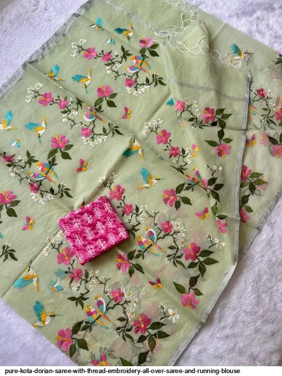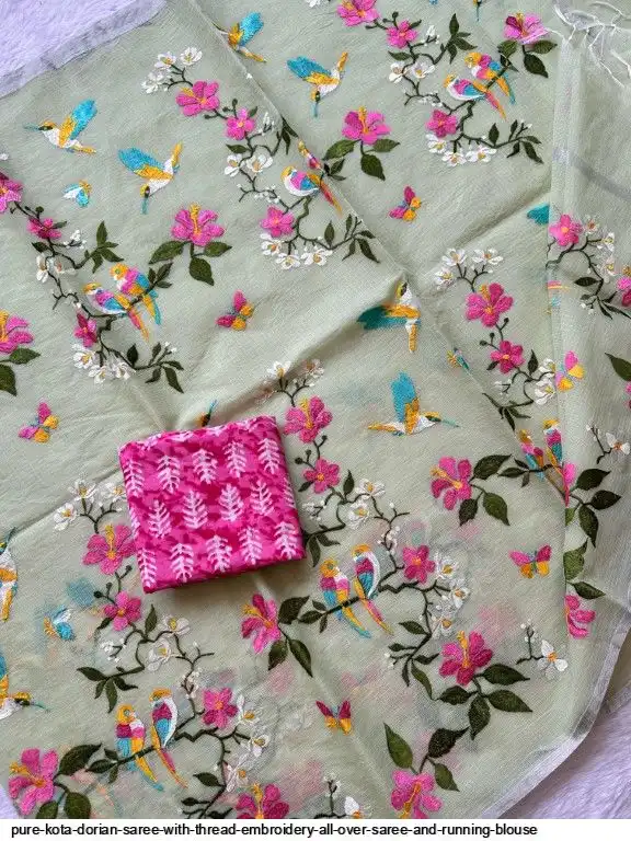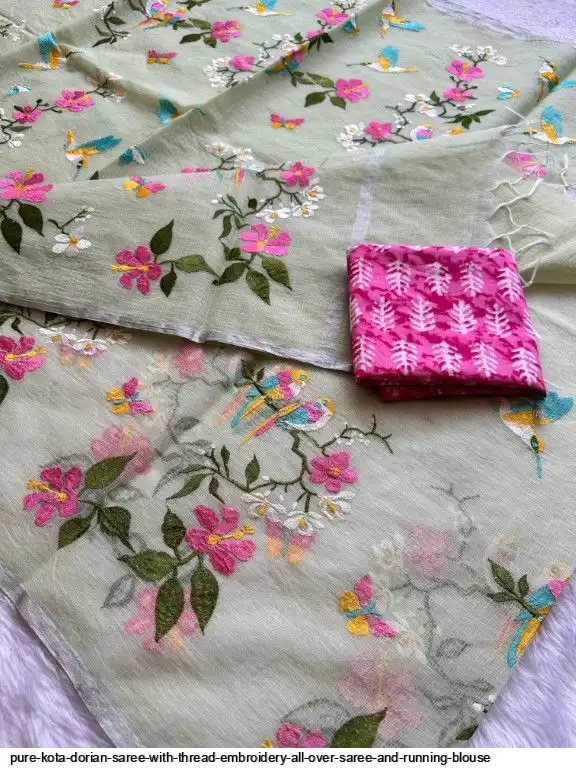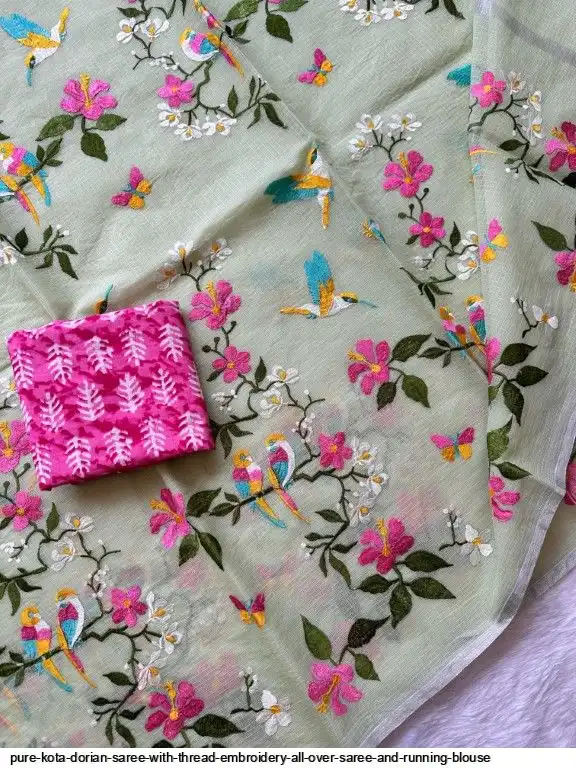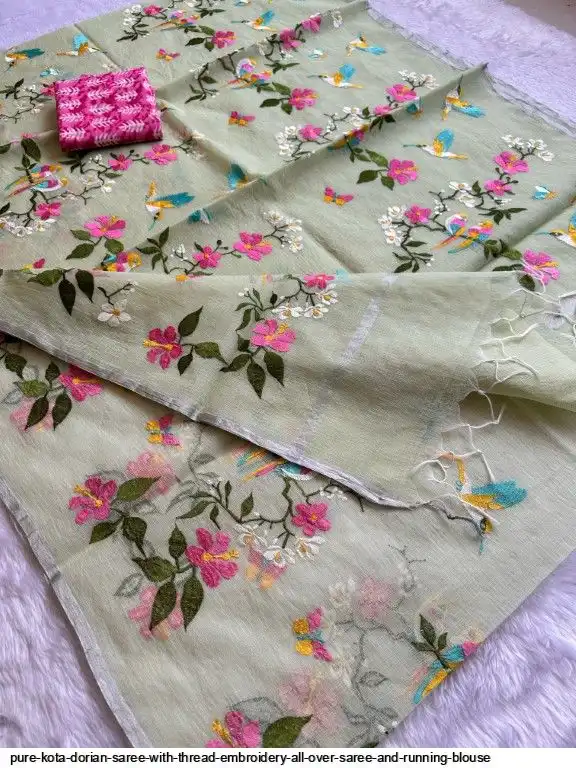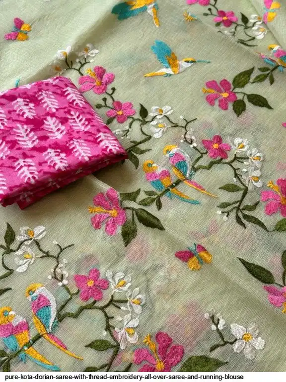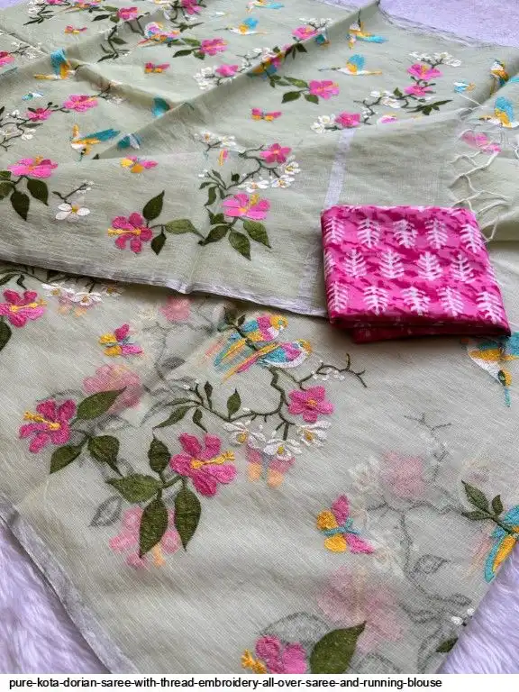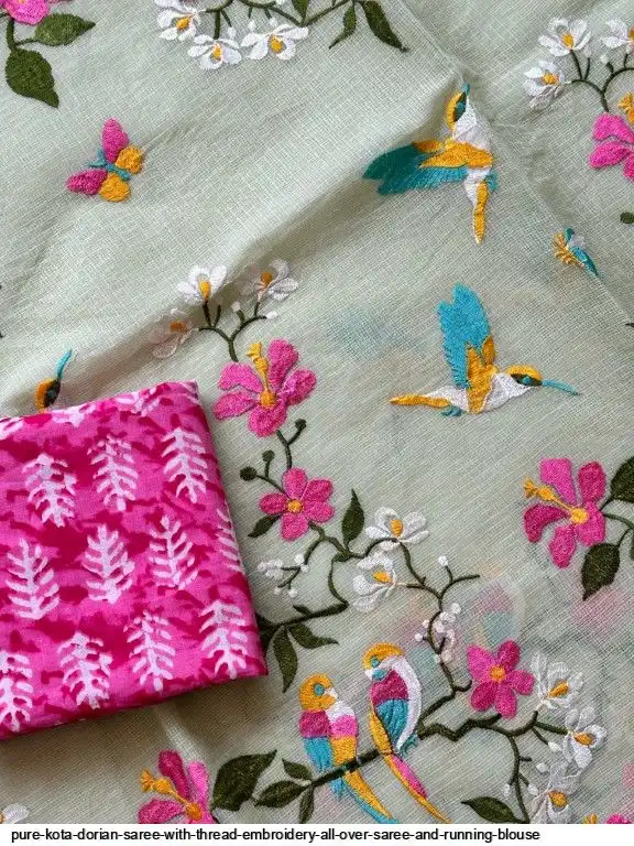 Pure Kota Dorian Saree With Thread Embroidery All Over Saree and Running Blouse