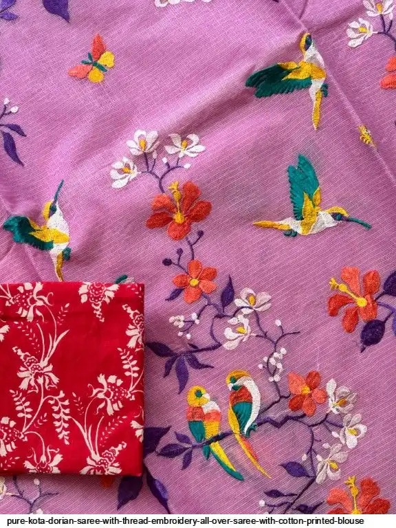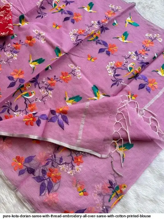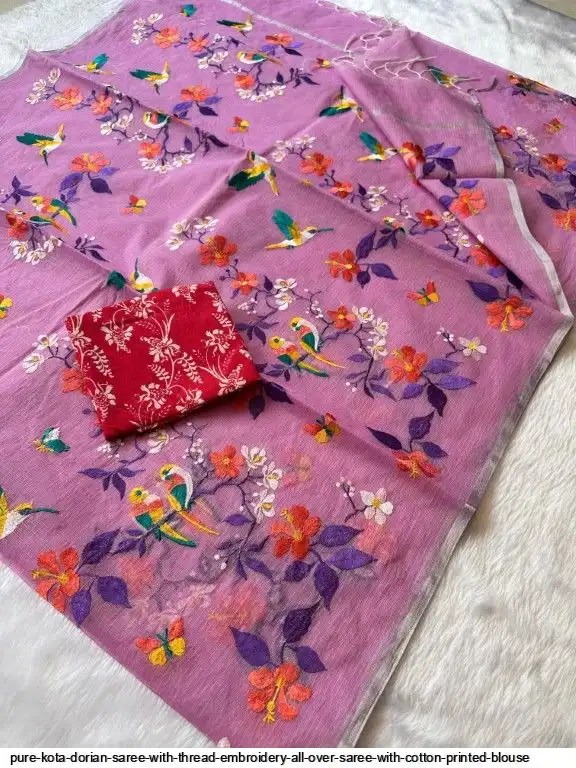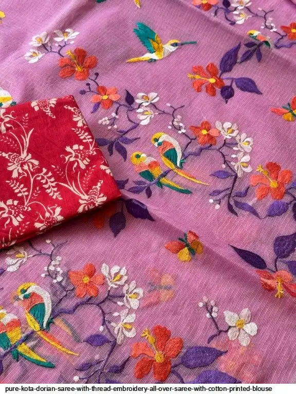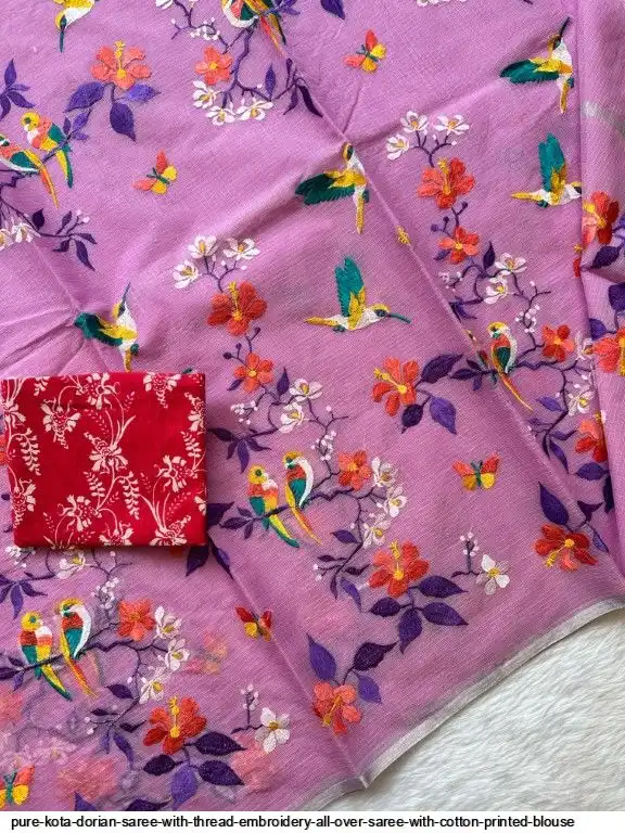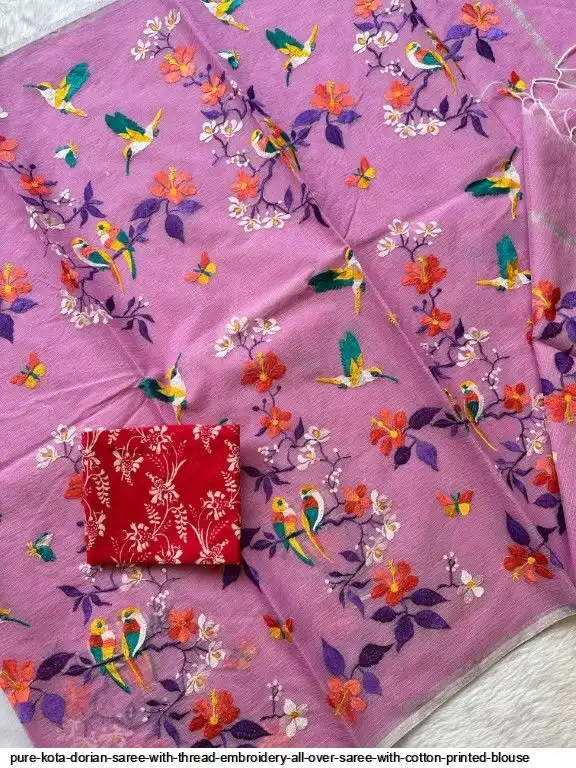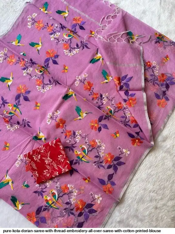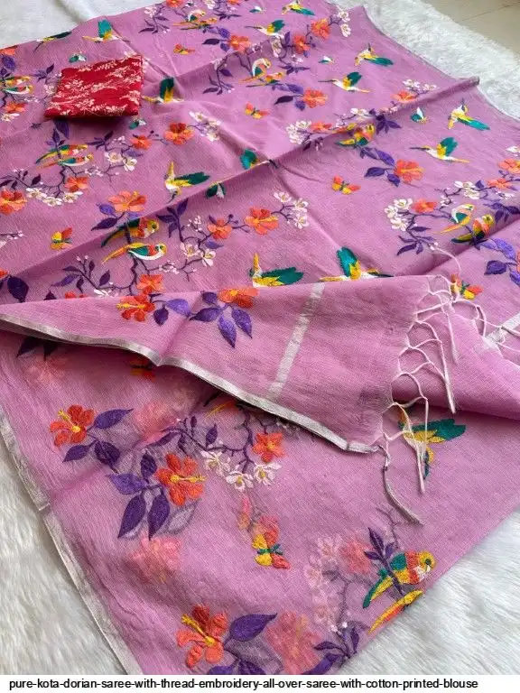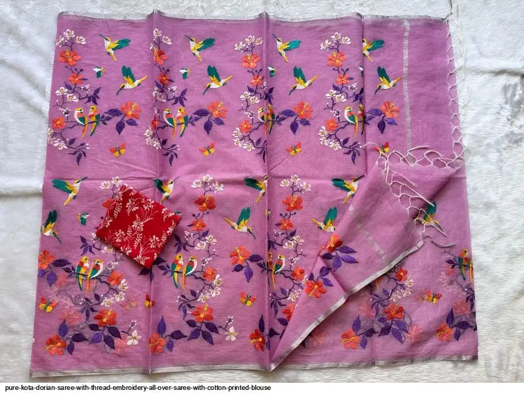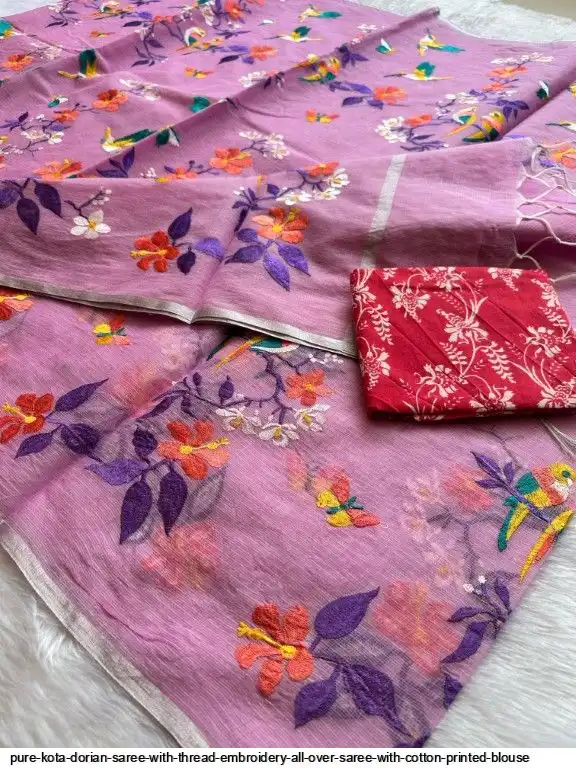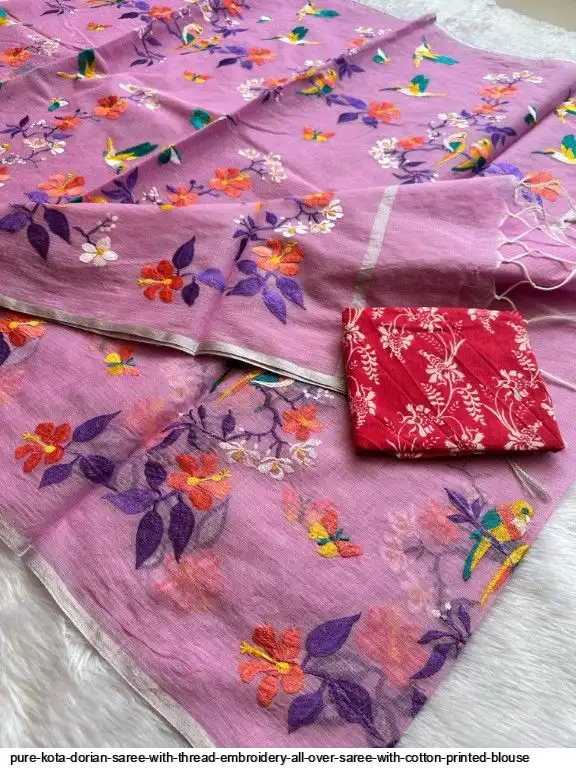 Pure Kota Dorian Saree With Thread Embroidery All Over Saree and Running Blouse