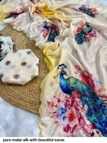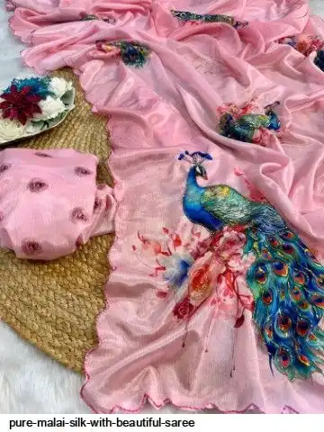 Pure malai silk saree with beautiful digital prints peacocks & flower with handwork & zari foil print work in all over sarees & outing thread border in all over saree ,paired with malai silk fabric with pearl