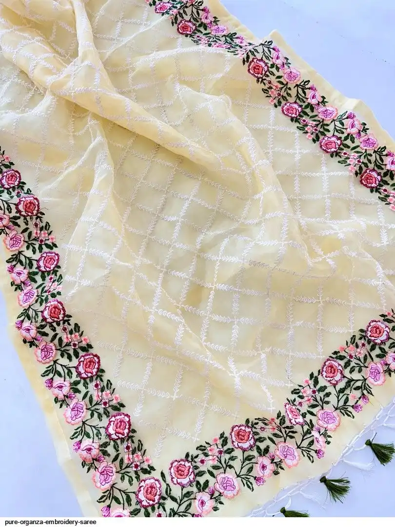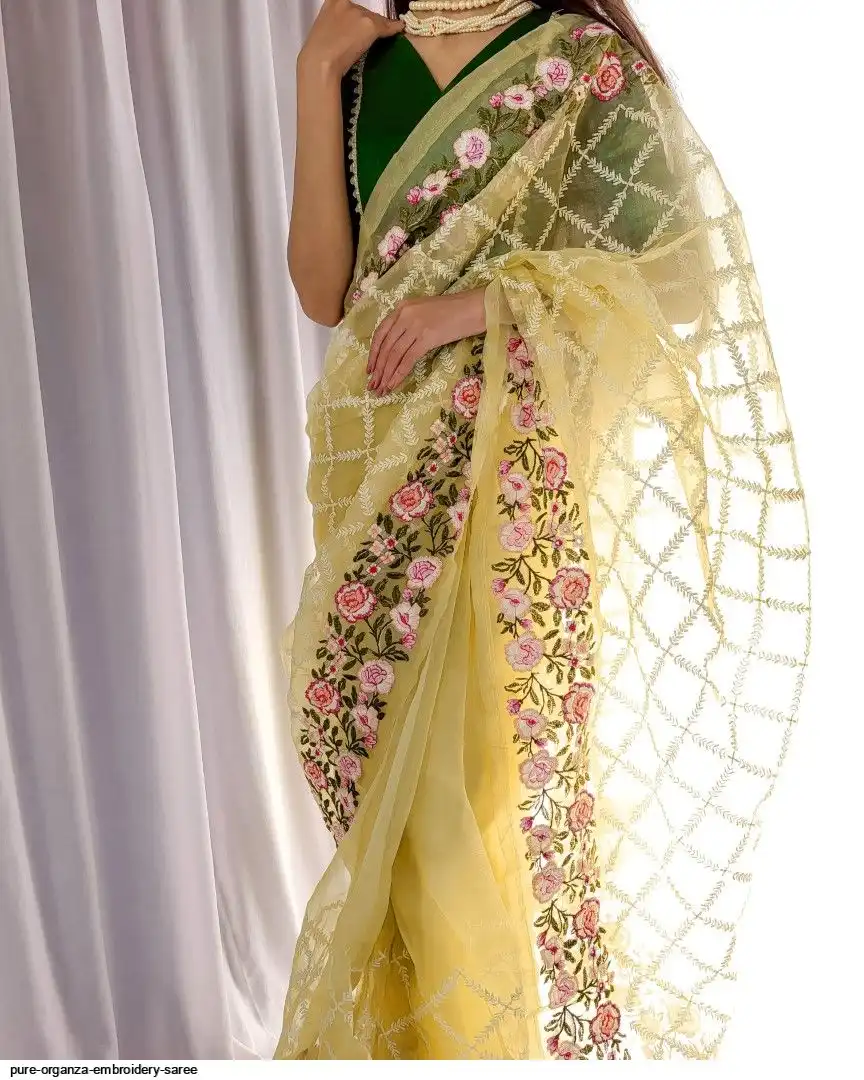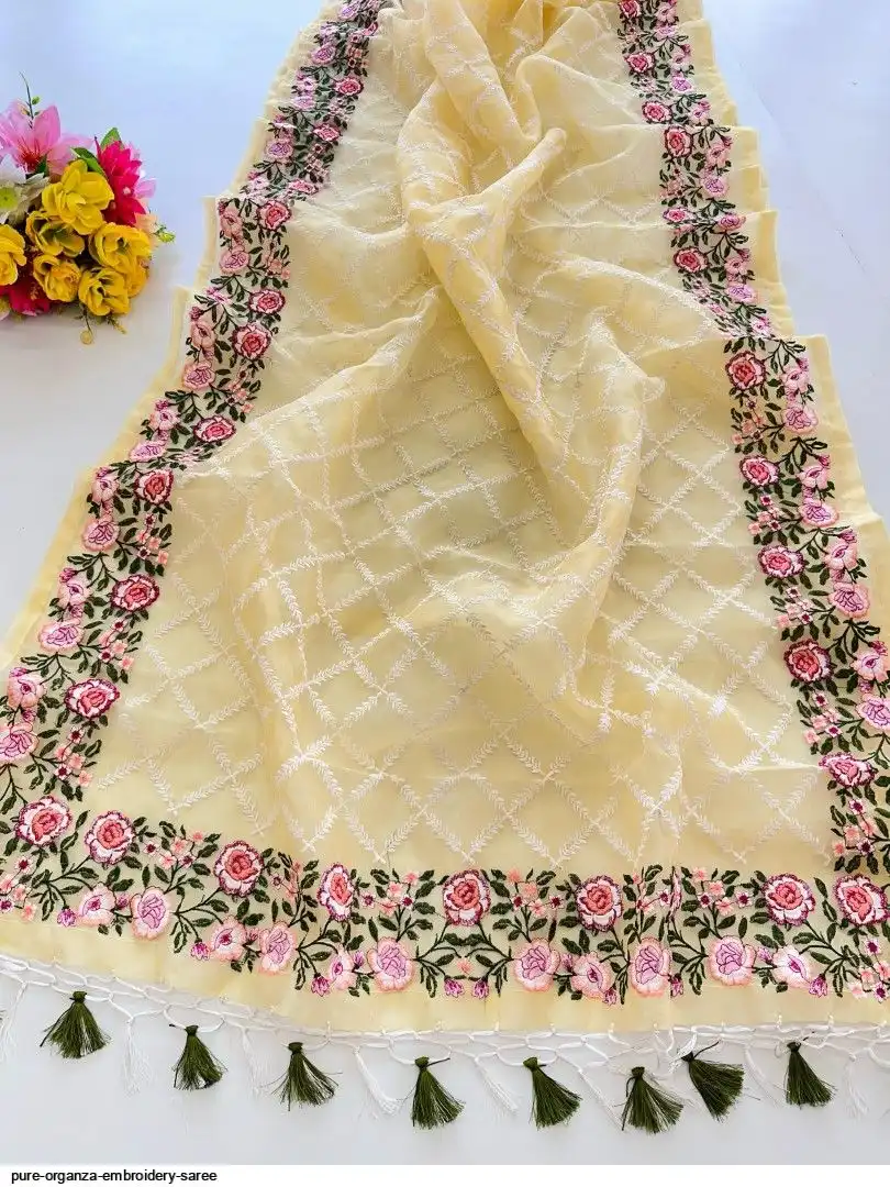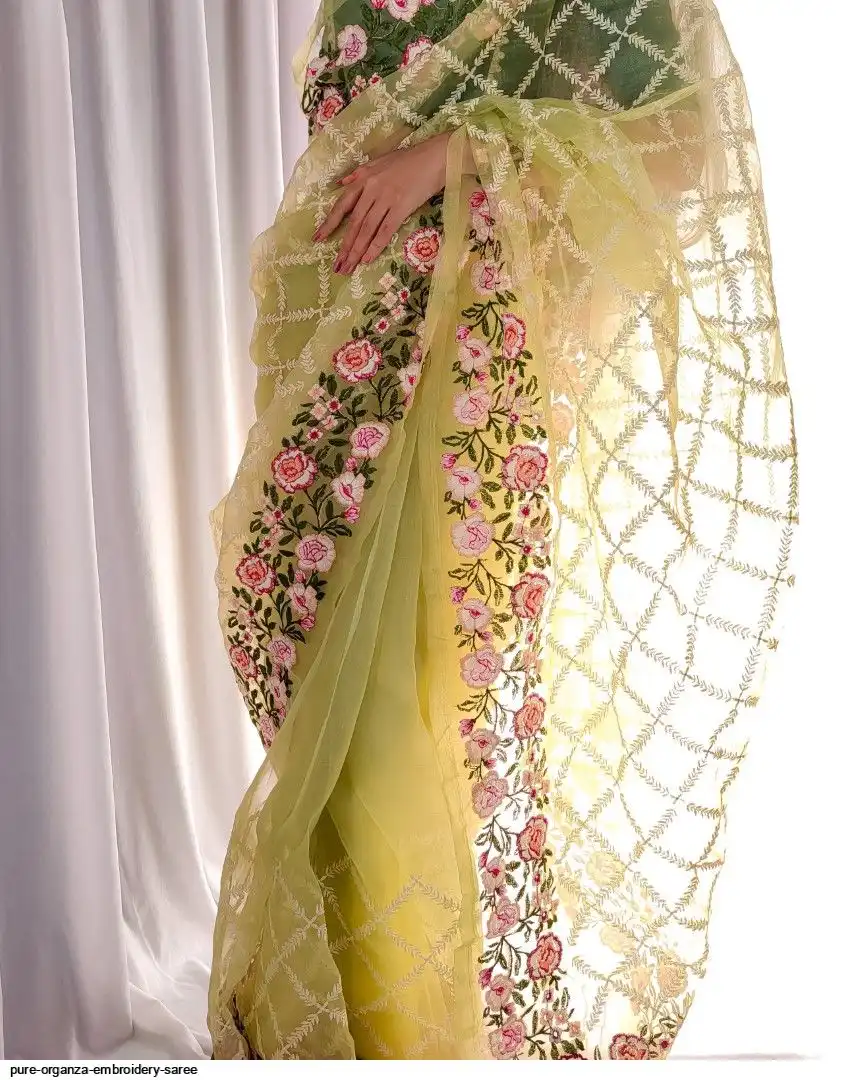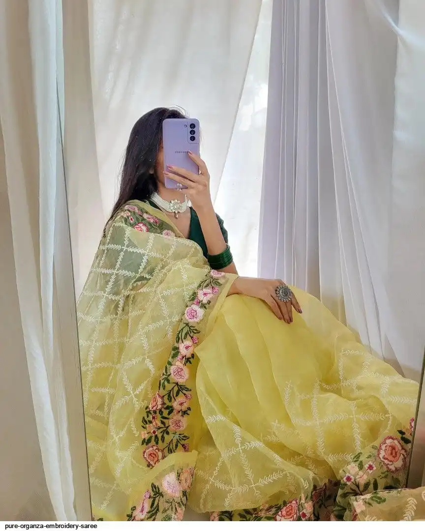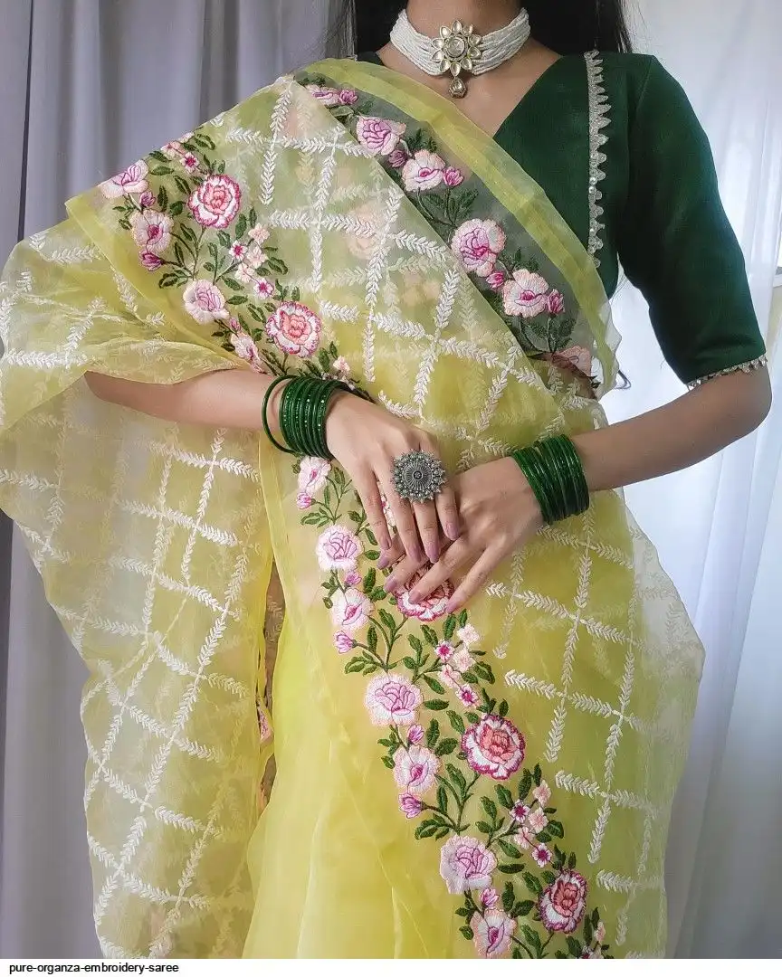 Semi-pure organza saree cover with beautiful embroidery all over saree attach with latkan and plain bottel green silk blouse