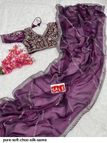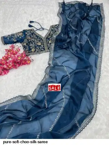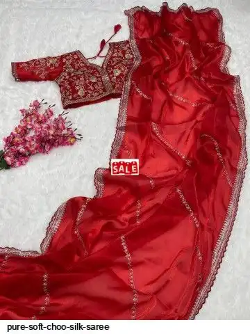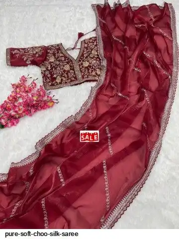 SAREE : PURE SOFT ZIMMY CHOO SILK FABRIC ON BEAUTIFUL C-PALLU EMBROIDERY SEQUENCES AND ZARI WORK WITH CUT WORK BORDER IN SAREE