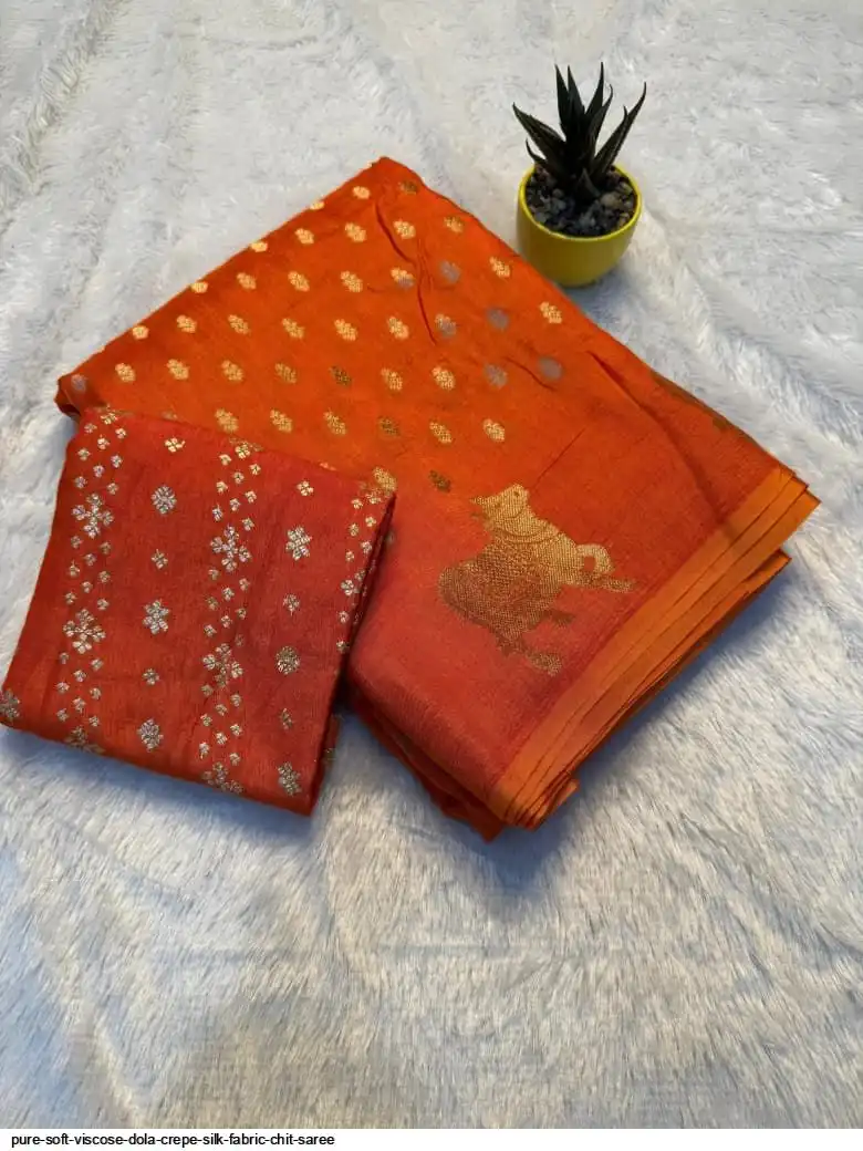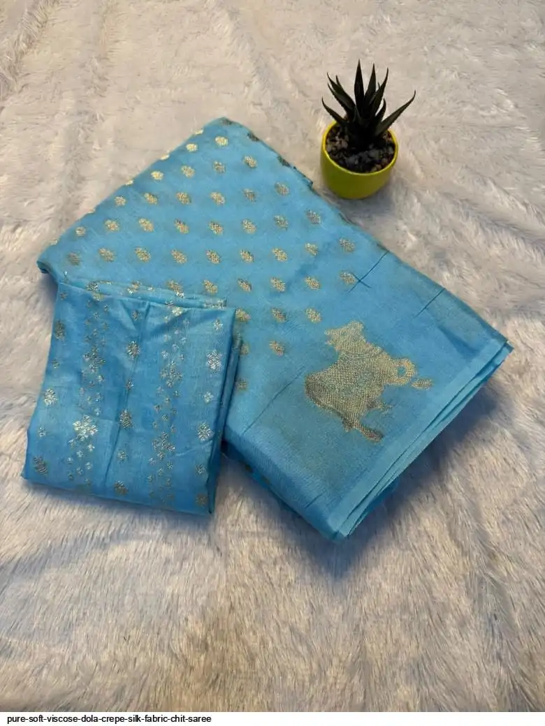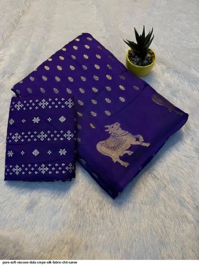 Pure soft Viscose dola Crepe silk fabric chit pallu saree with cow zari border pattern and with viscose dola blouse