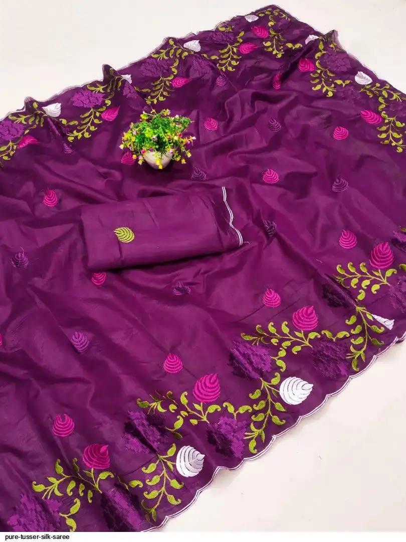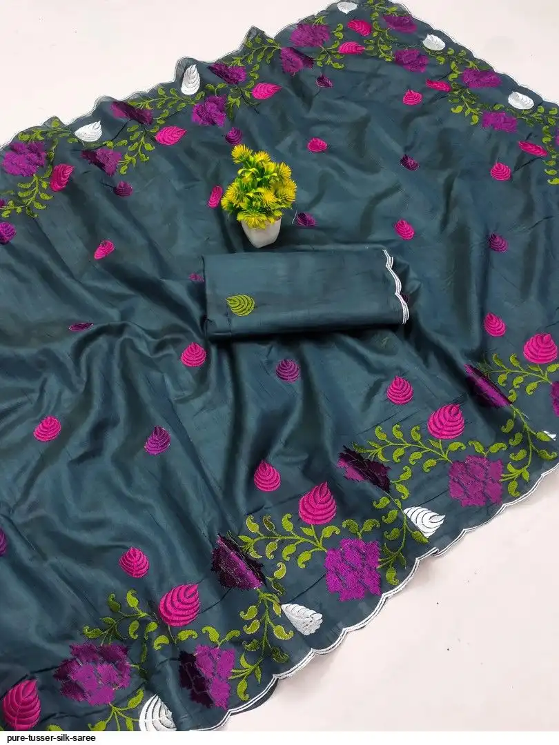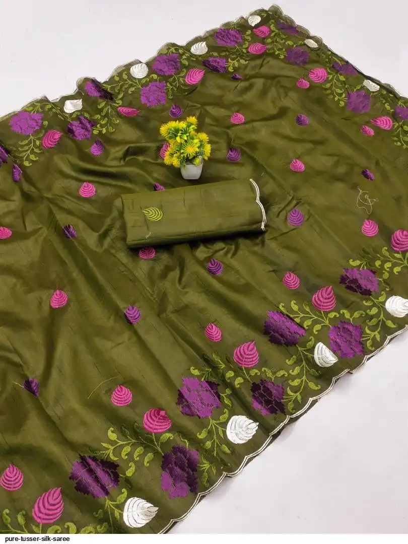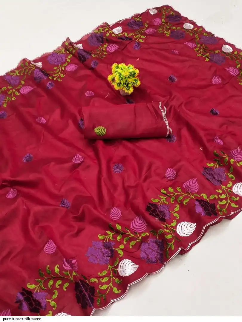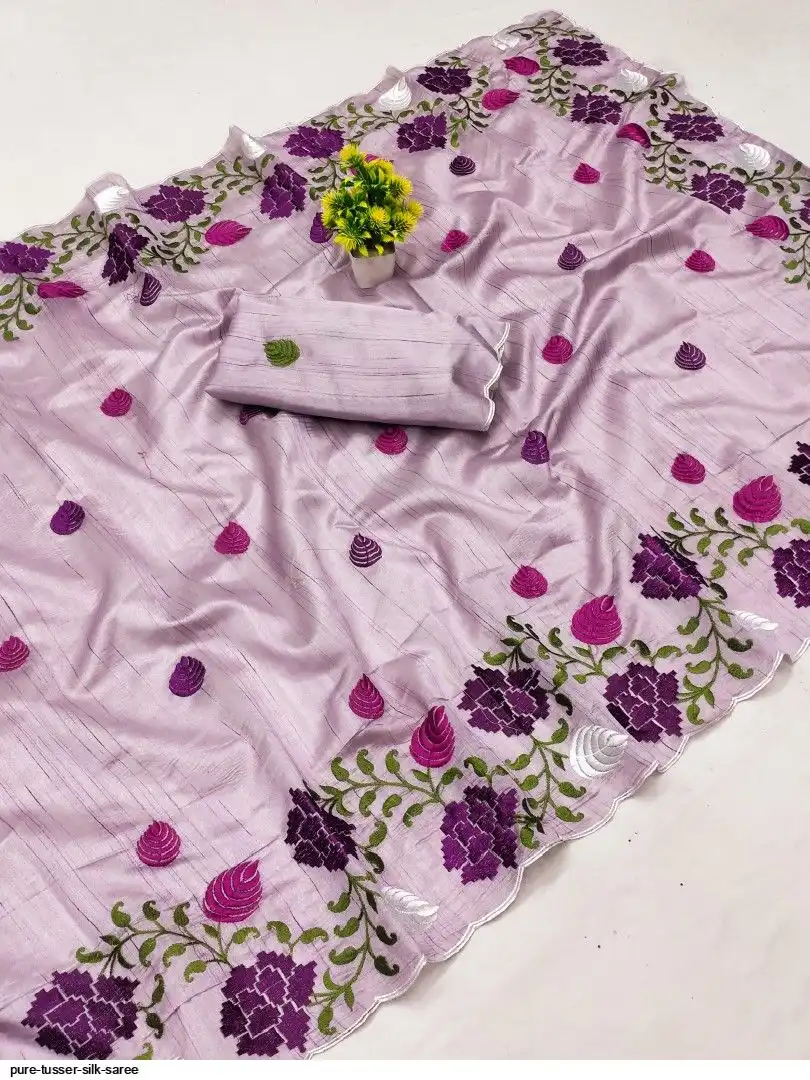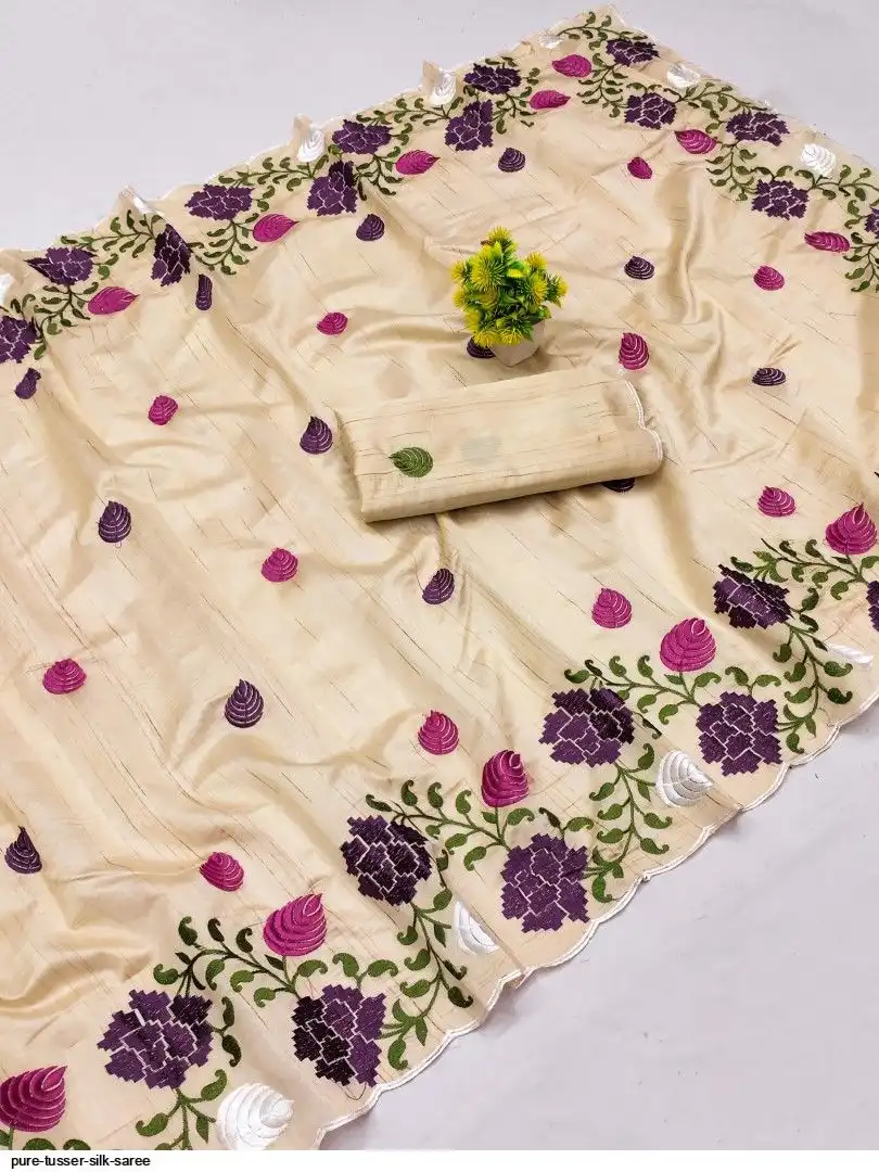 Pure Tusser Silk Saree With Fancy Embroidery Work & Embroidery Cut Work Border and Pallu & Fancy Embroidery Work Blouse