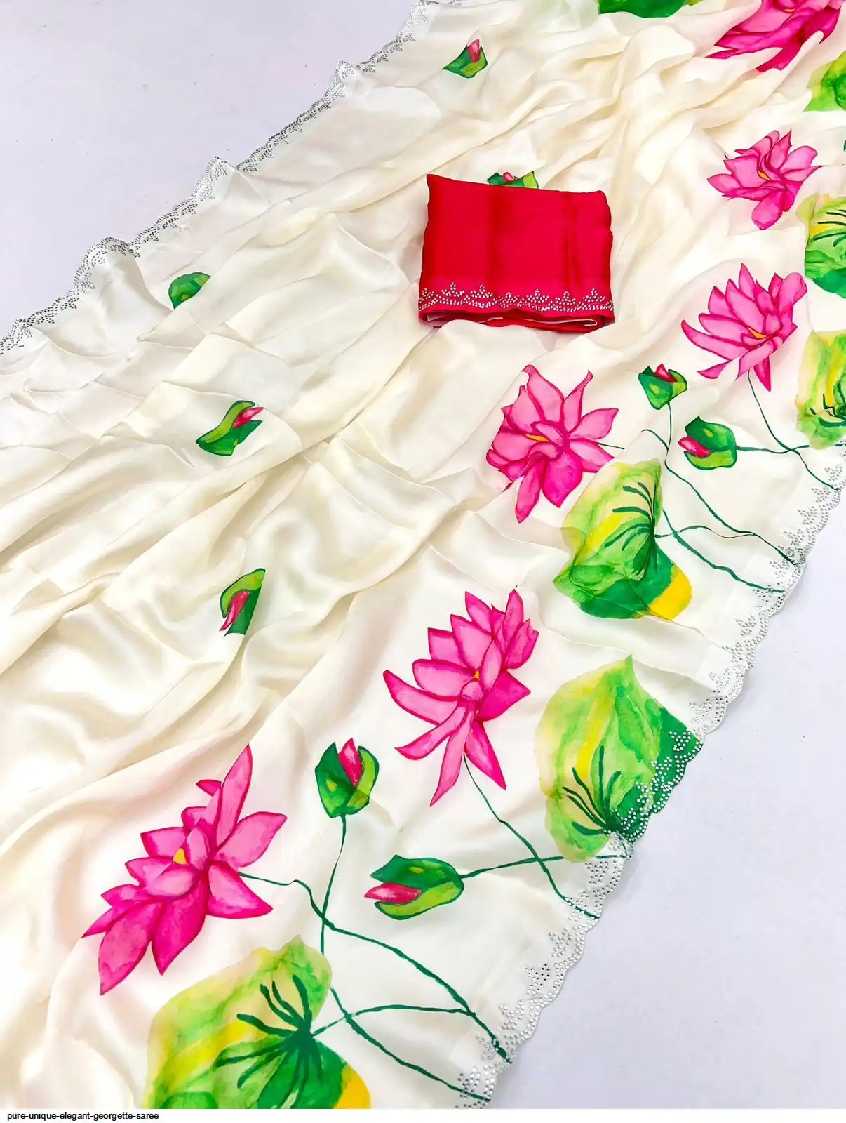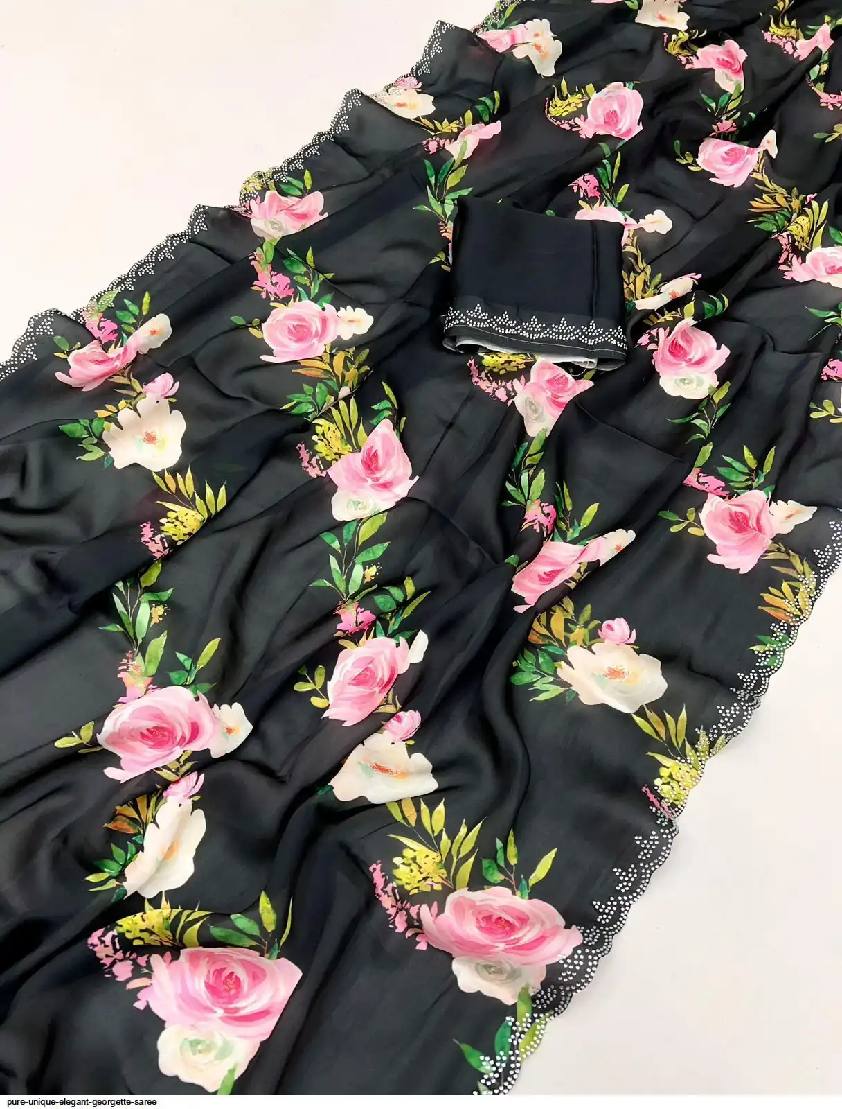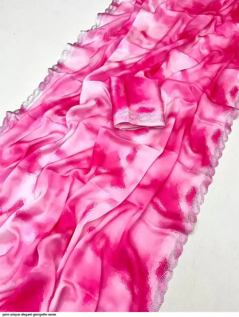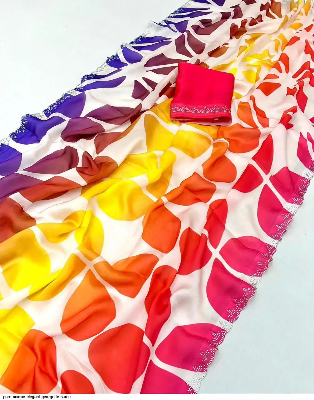 Fabric - Heavy Sattin Georgette Fabric And Beautiful Colorful Geometrical & Floral Digital Print Design With Fancy Siroski Cutwork Bordar And Runing Blouse