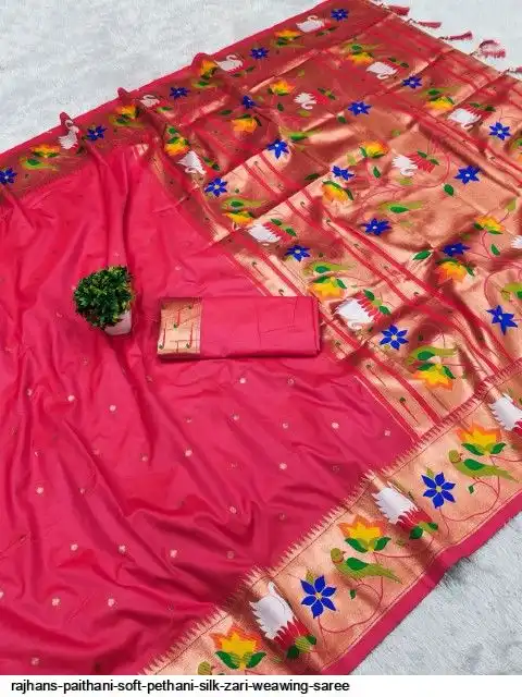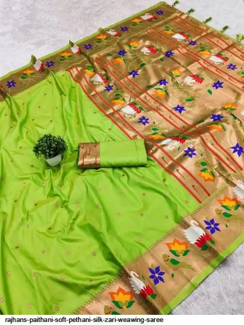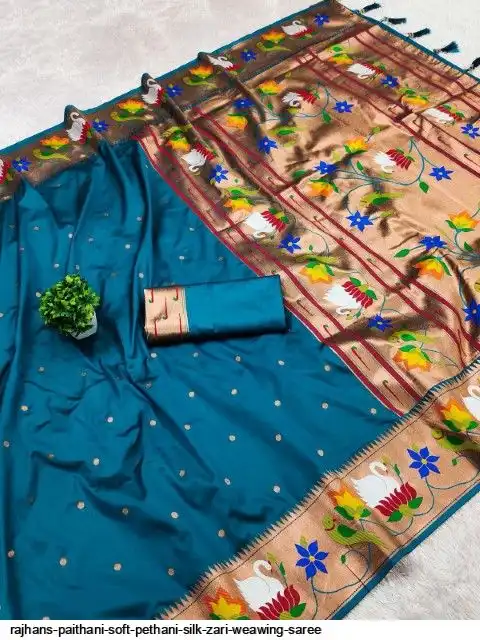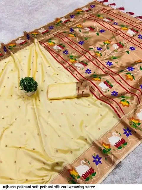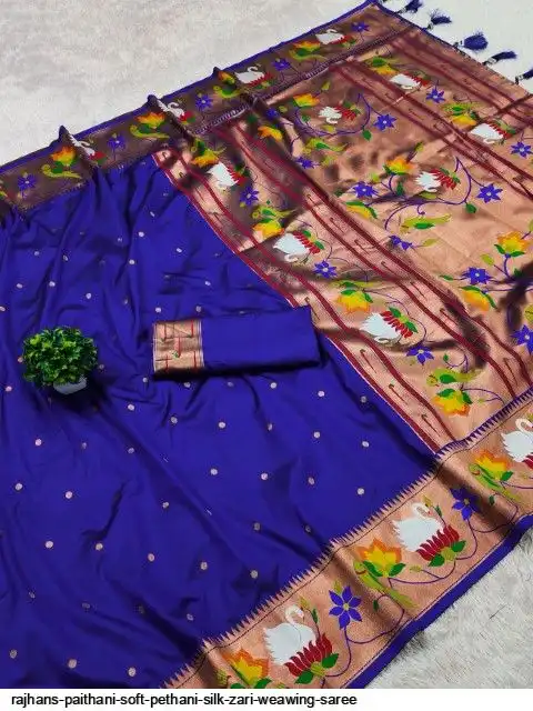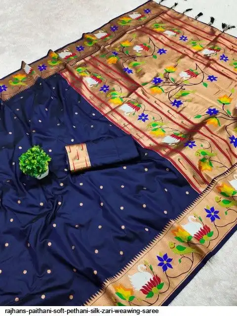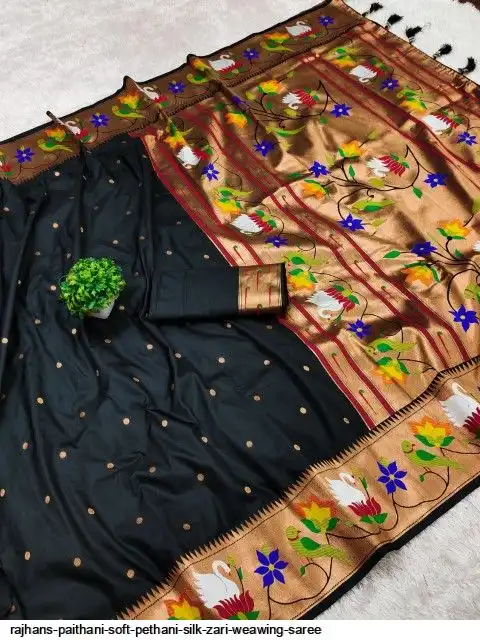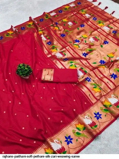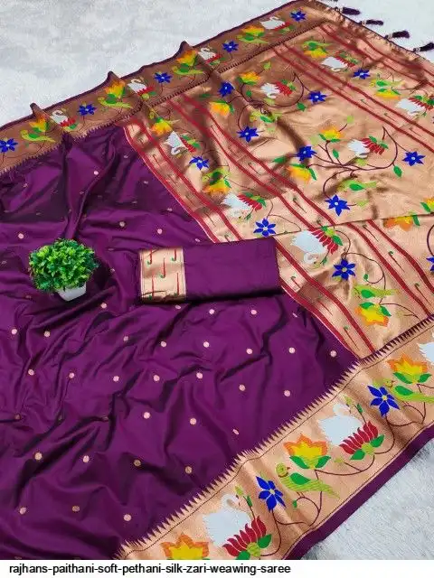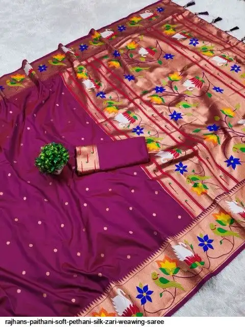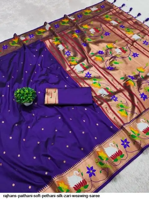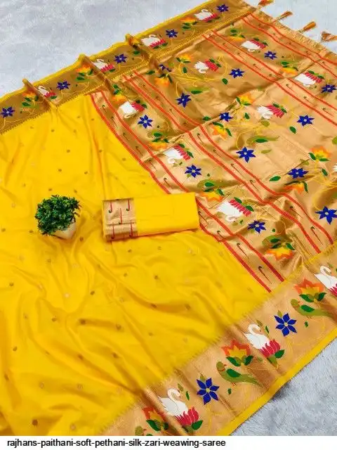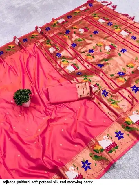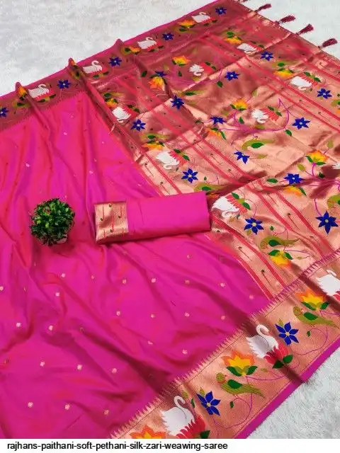 Saree :- Soft Pethani silk saree with zari weawing Motifs design and Meenakari weawing Rich pallu with Meenakari weawing swan border & Tessels attached at Pallu end.