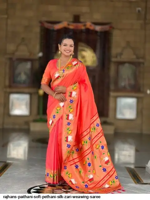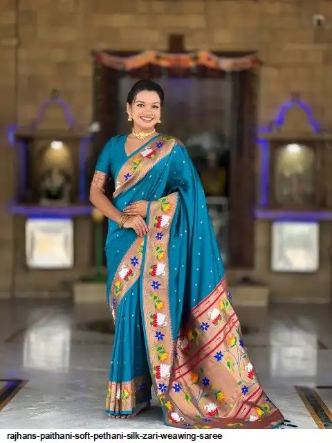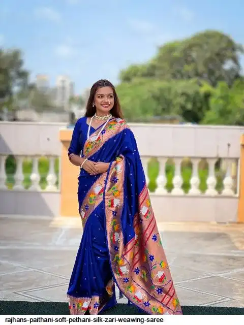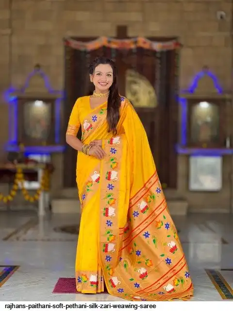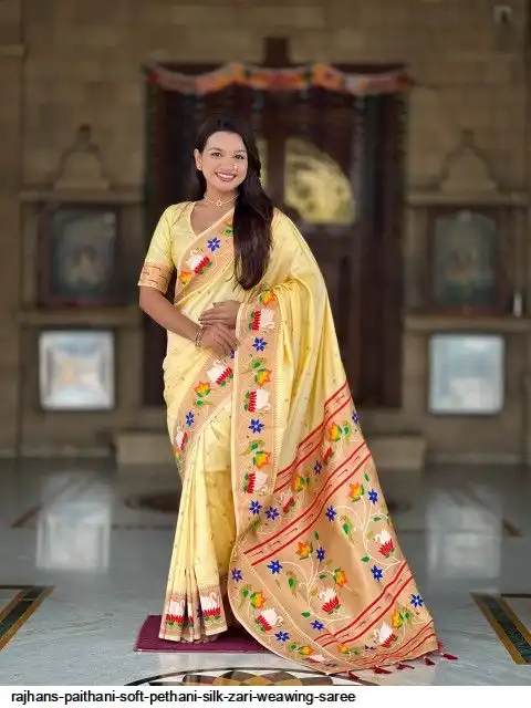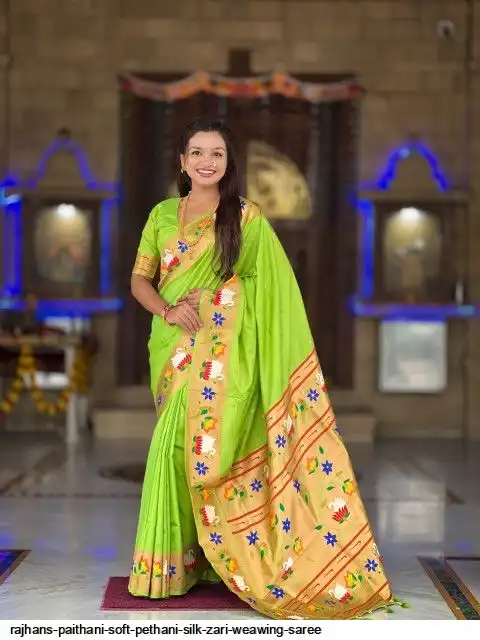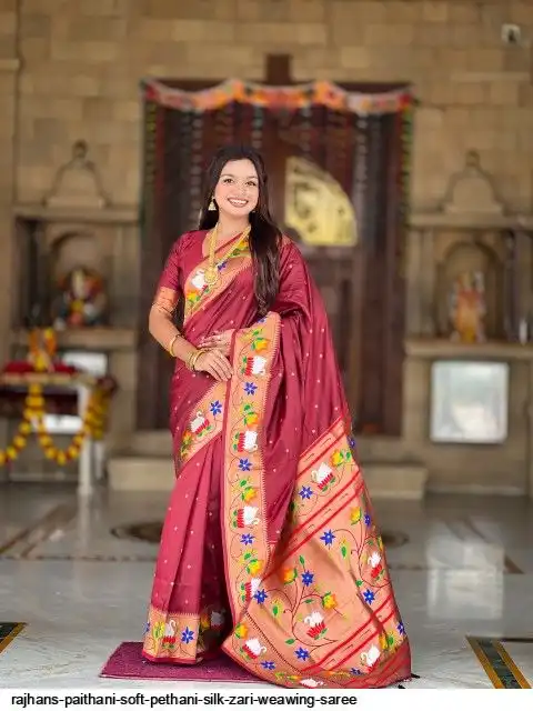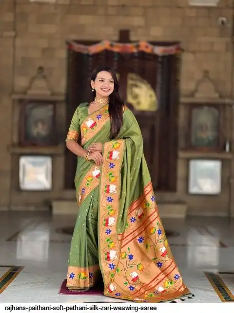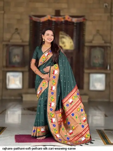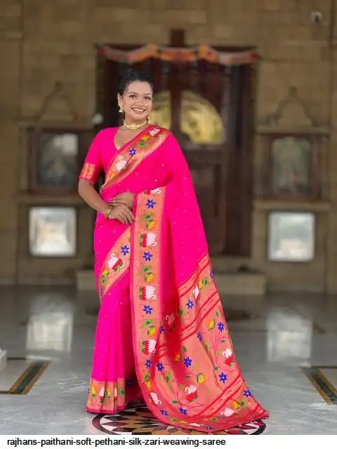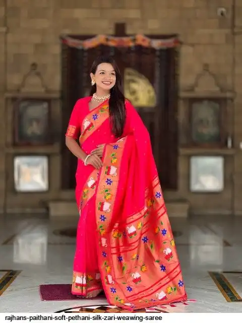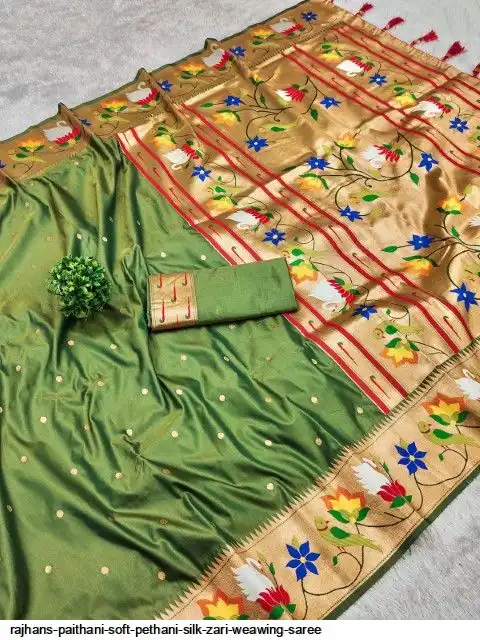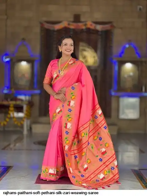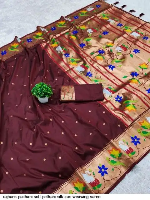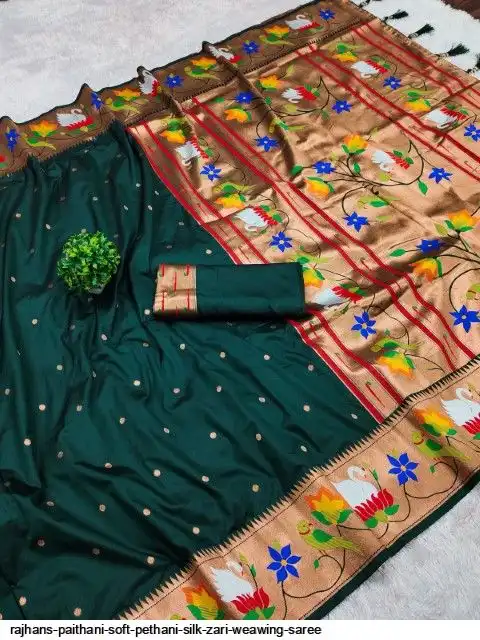 Saree :- Soft Pethani silk saree with zari weawing Motifs design and Meenakari weawing Rich pallu with Meenakari weawing swan border & Tessels attached at Pallu end.