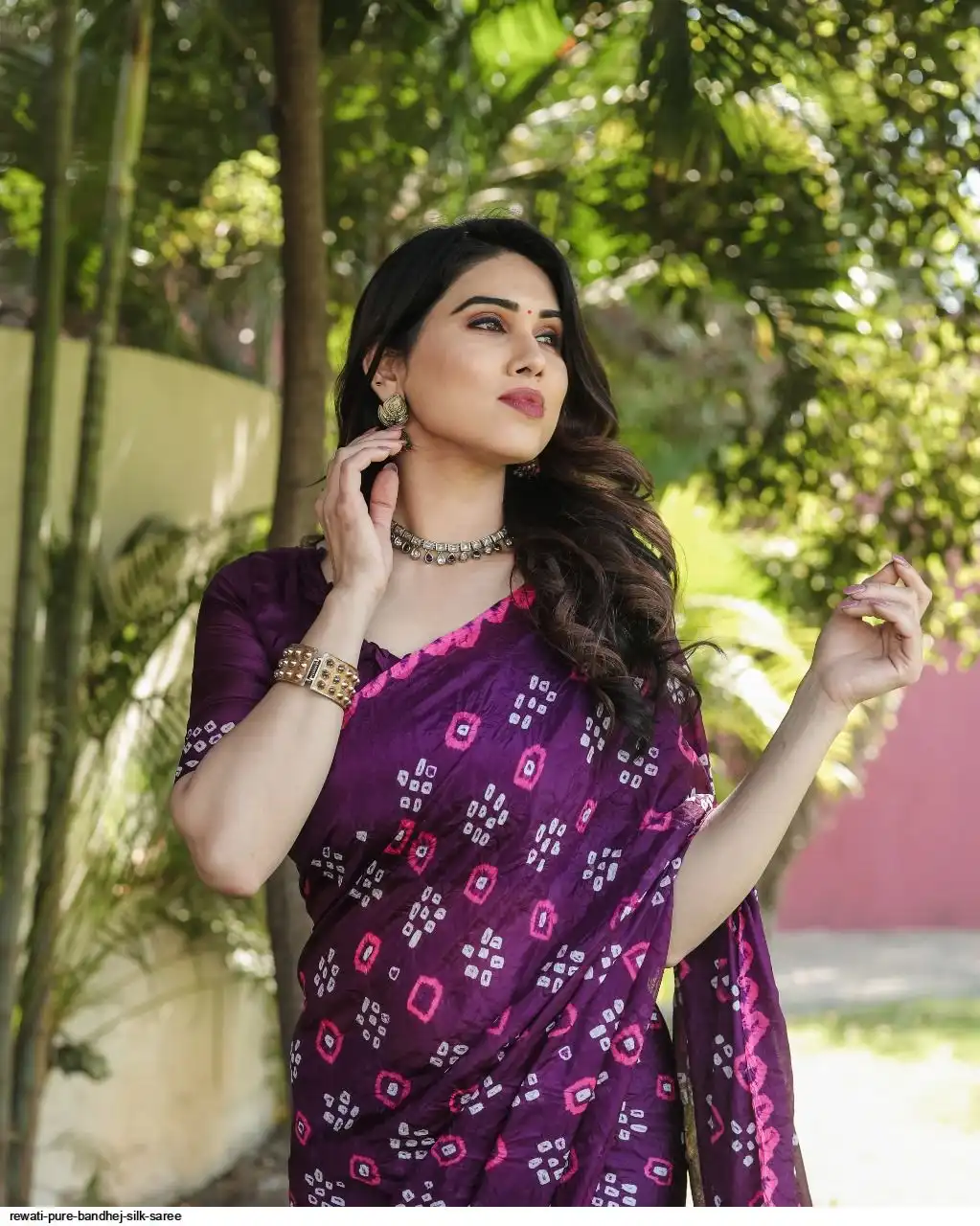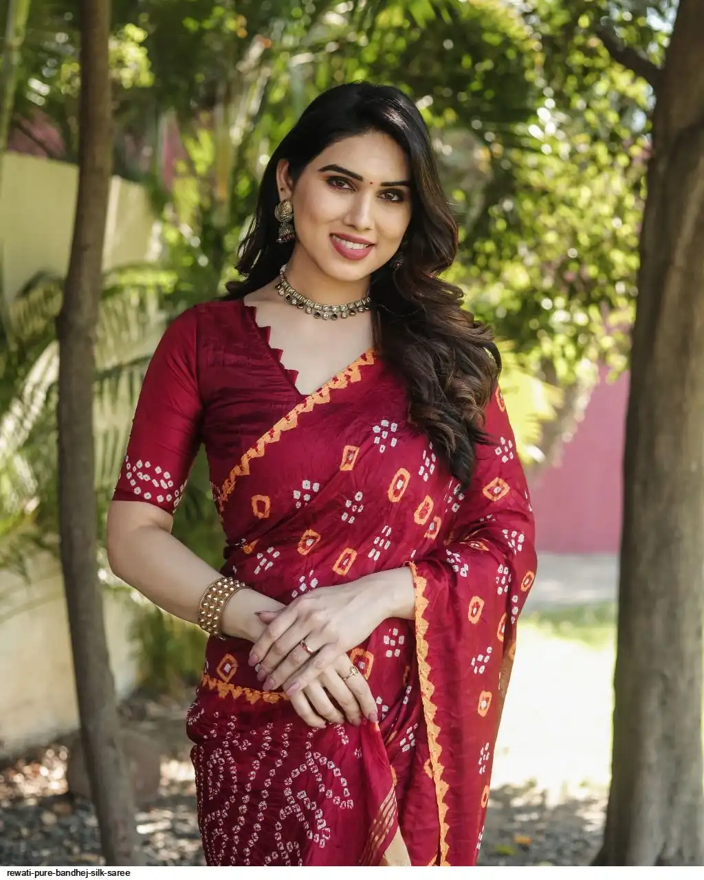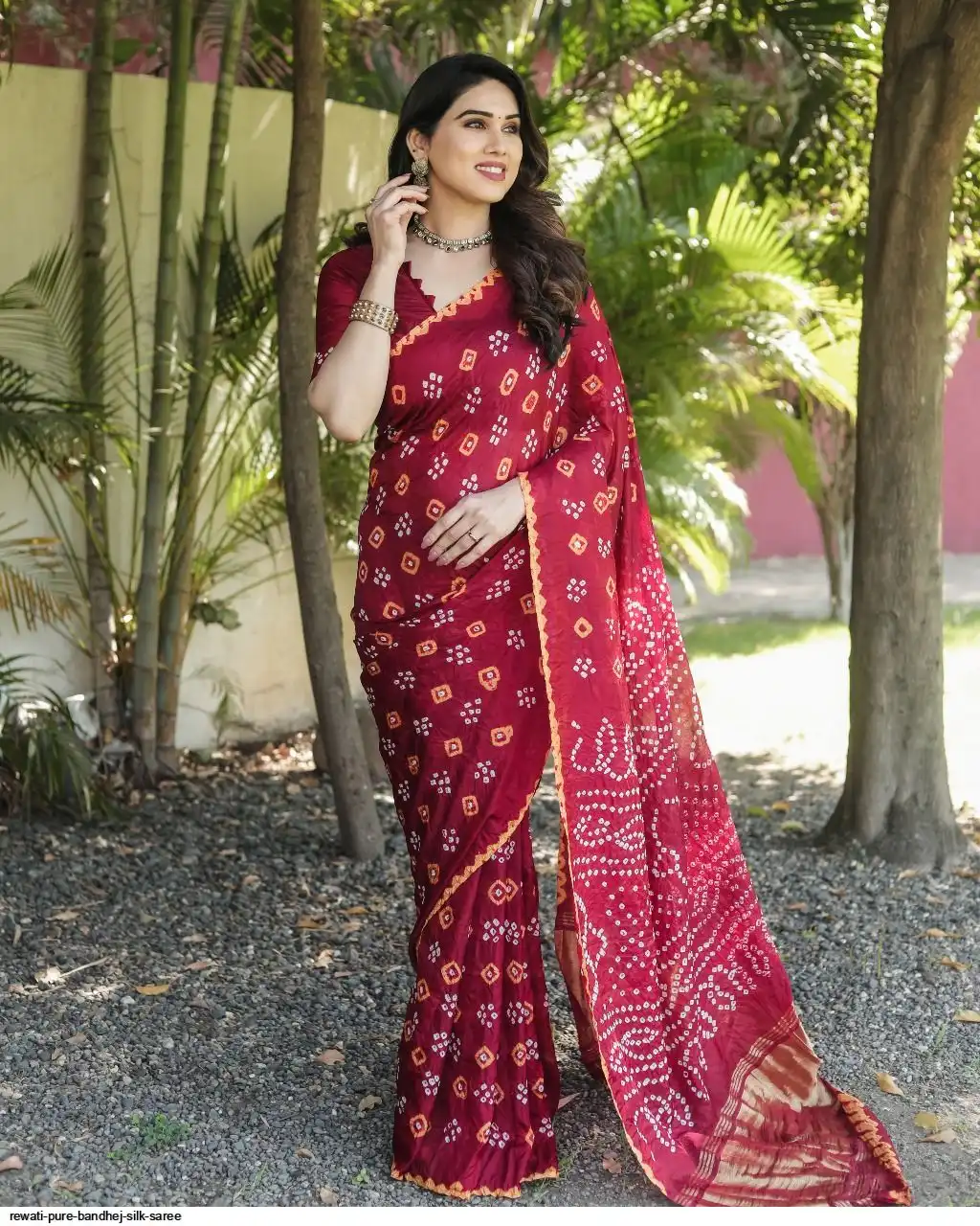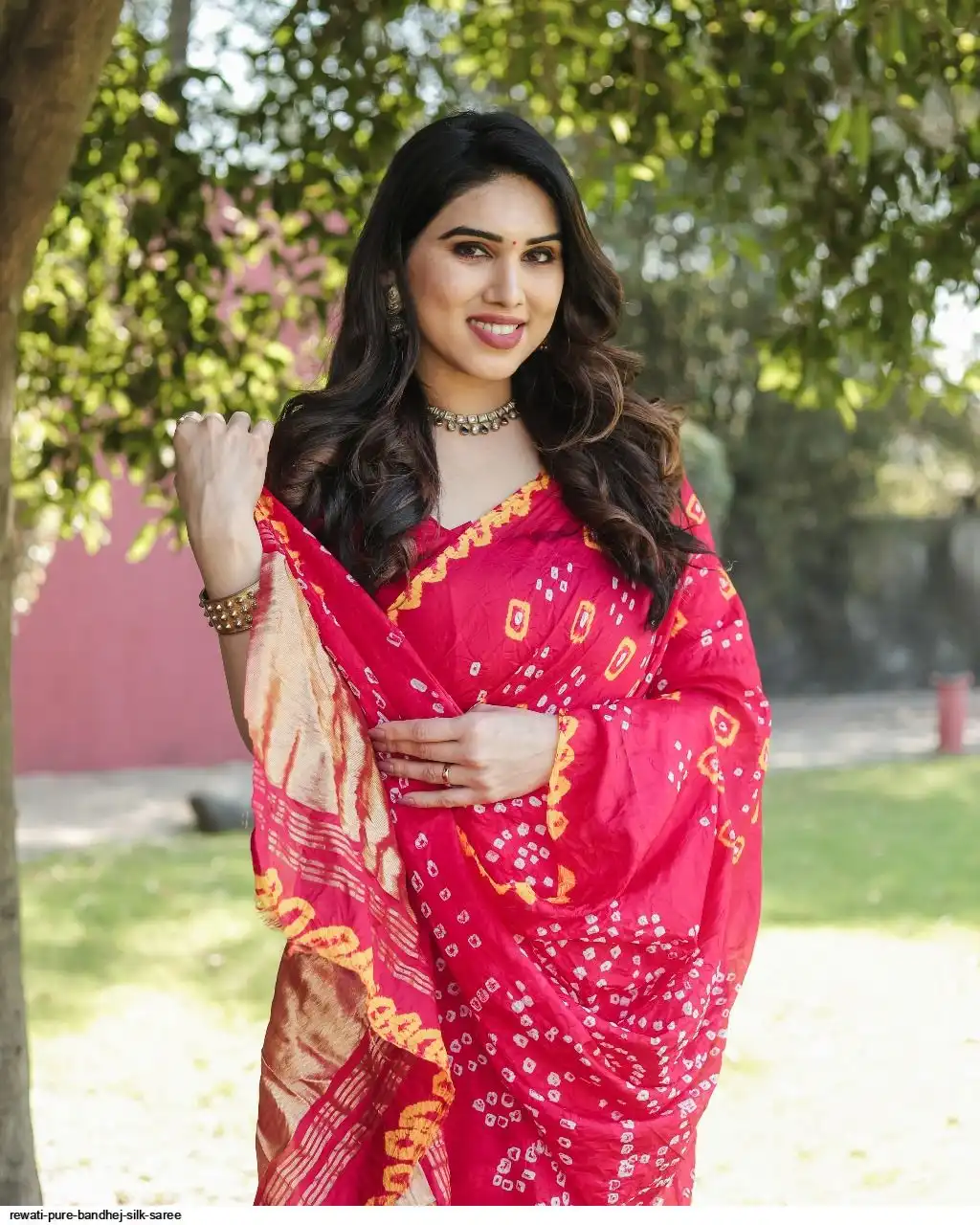 Pure Bandhej silk saree made by *original Bandhej with Bandhej Border with Zari Weaving Rich Tissue Pallu * saree with beautiful Bandhej design and having a Bandhej Rich Pallu.
