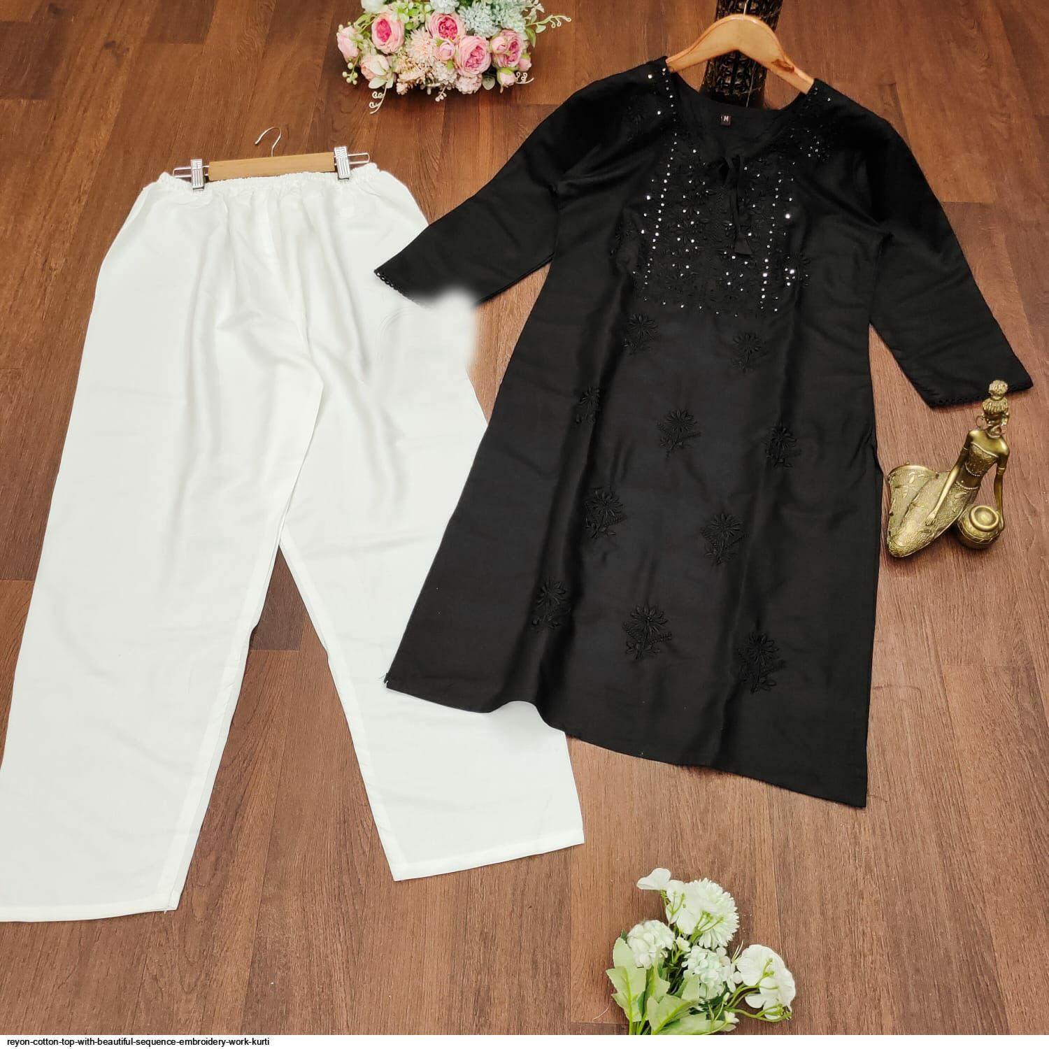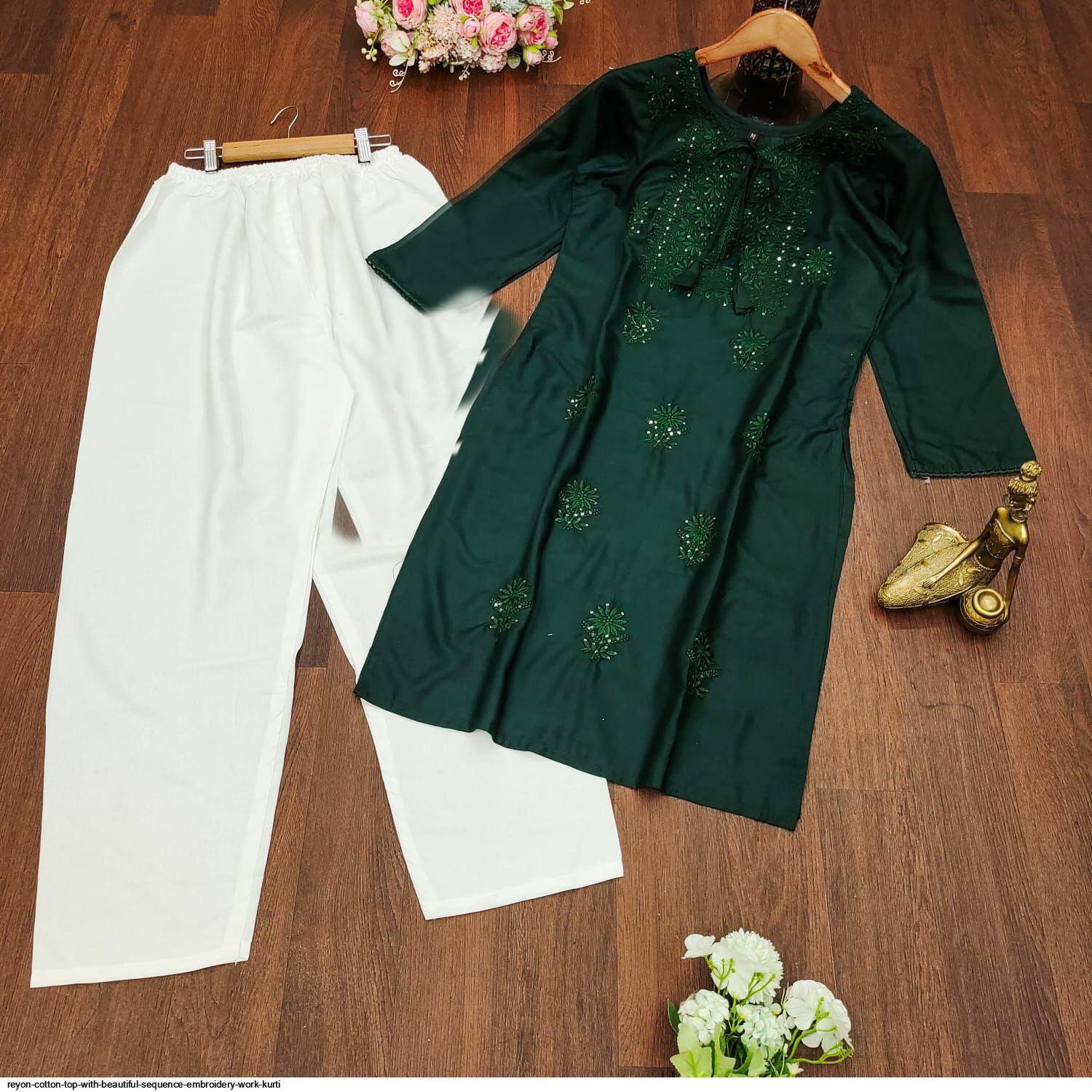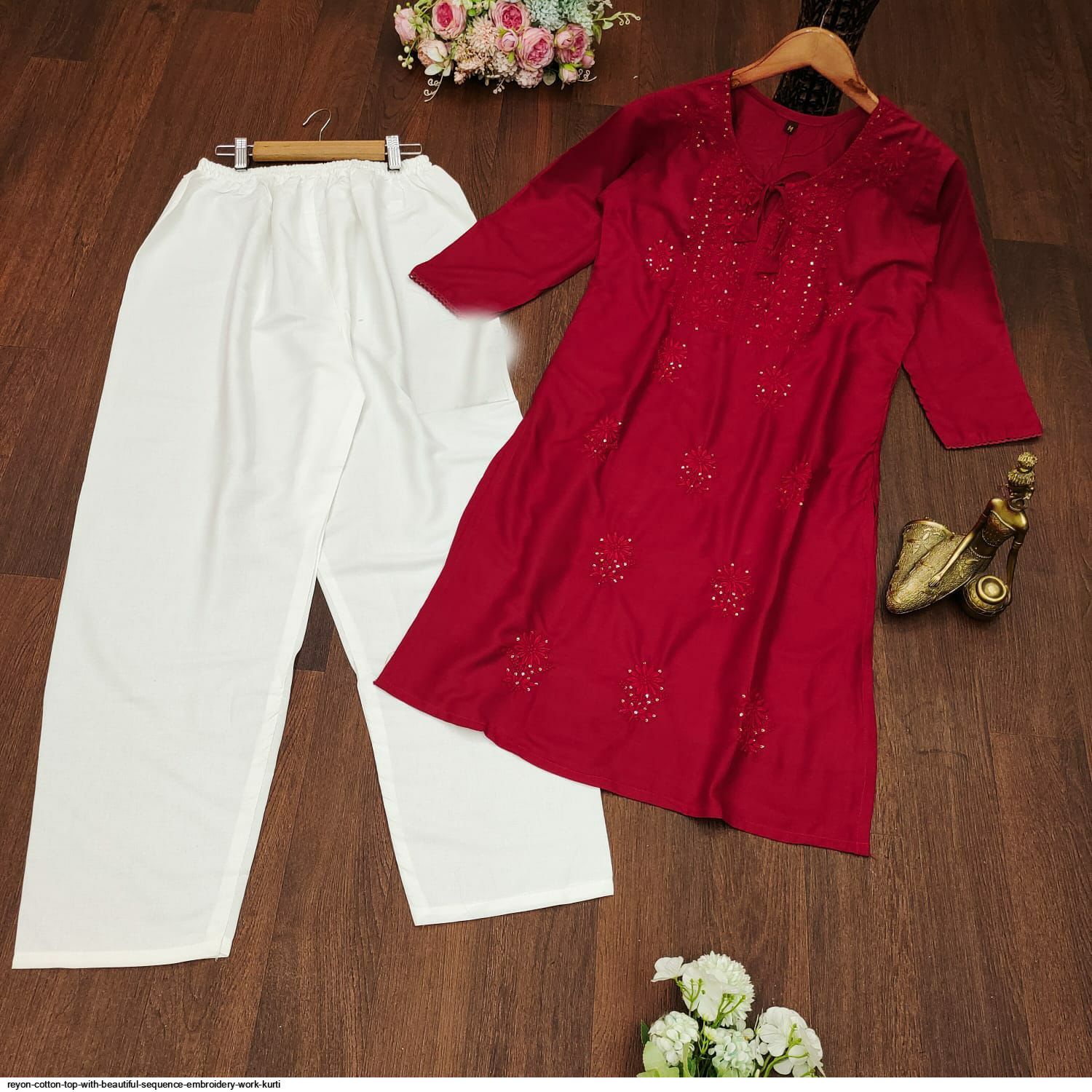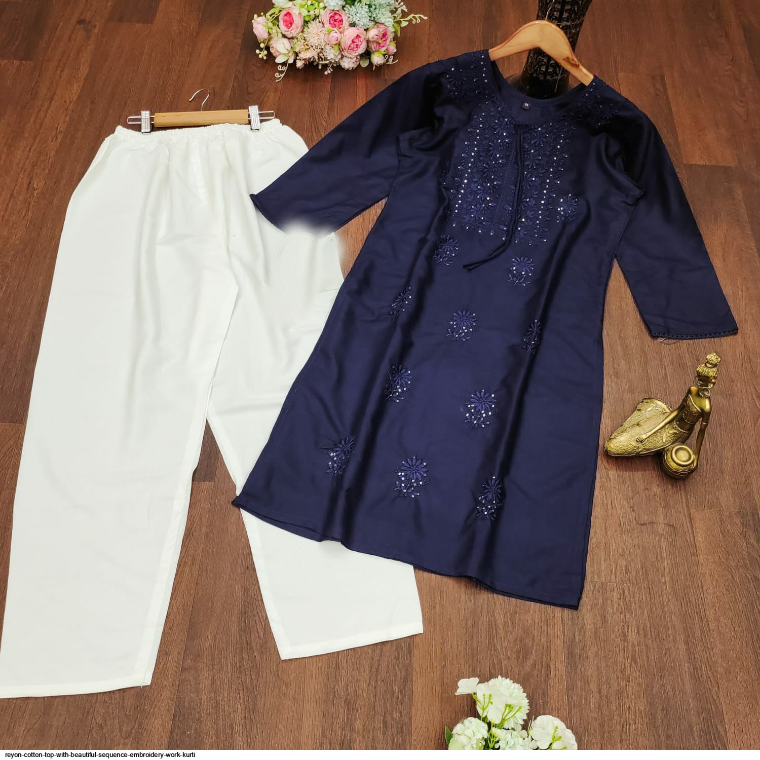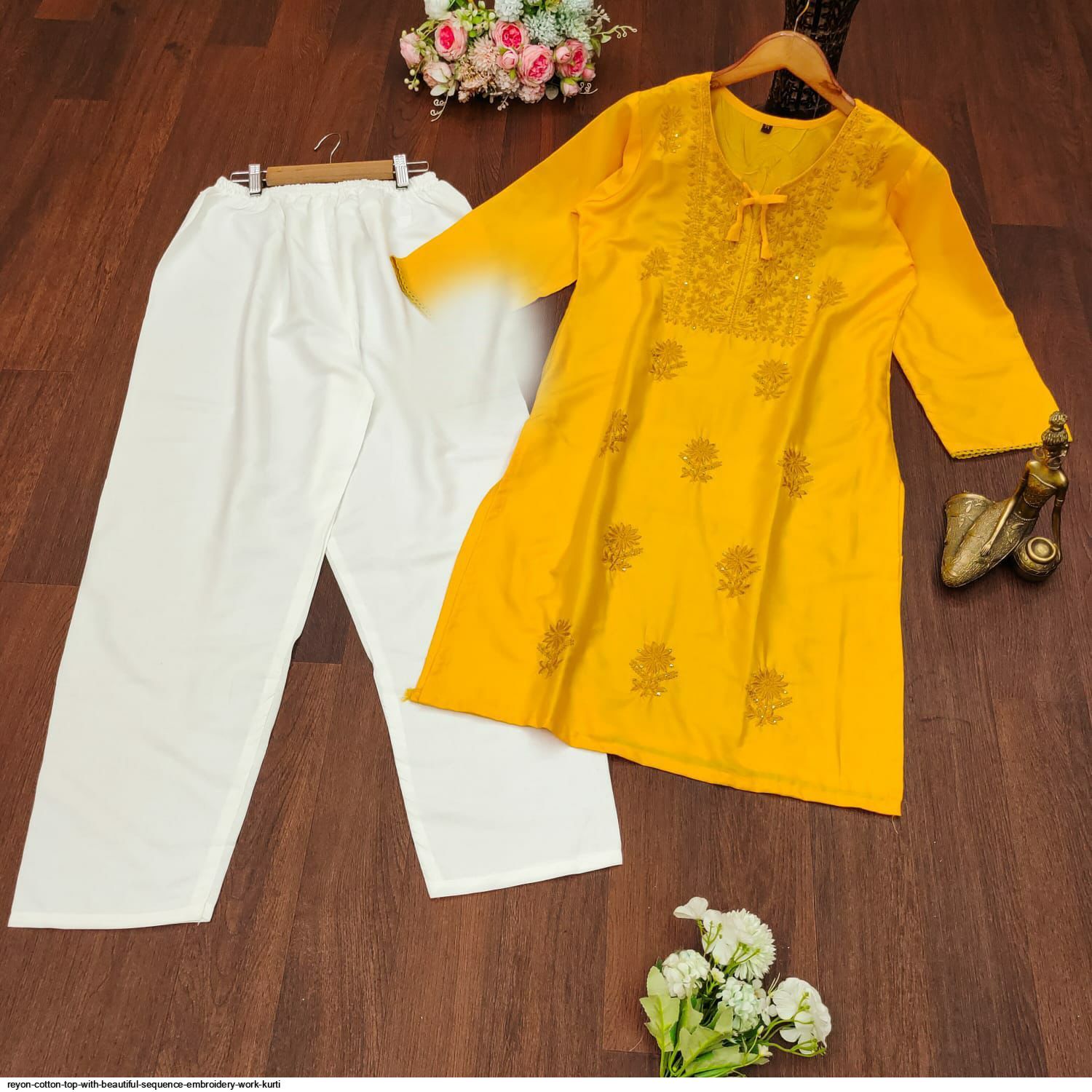 Premium Reyon cotton Top with beautiful sequence embroidery work on yoke & Reyon pent