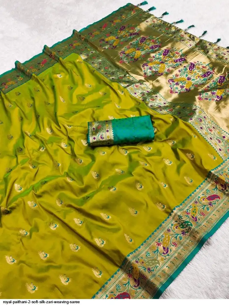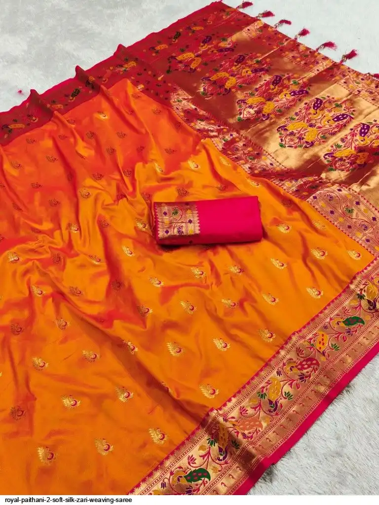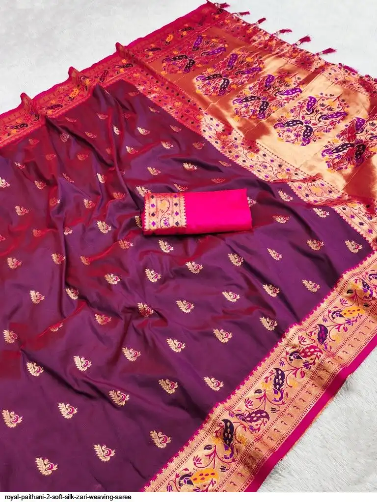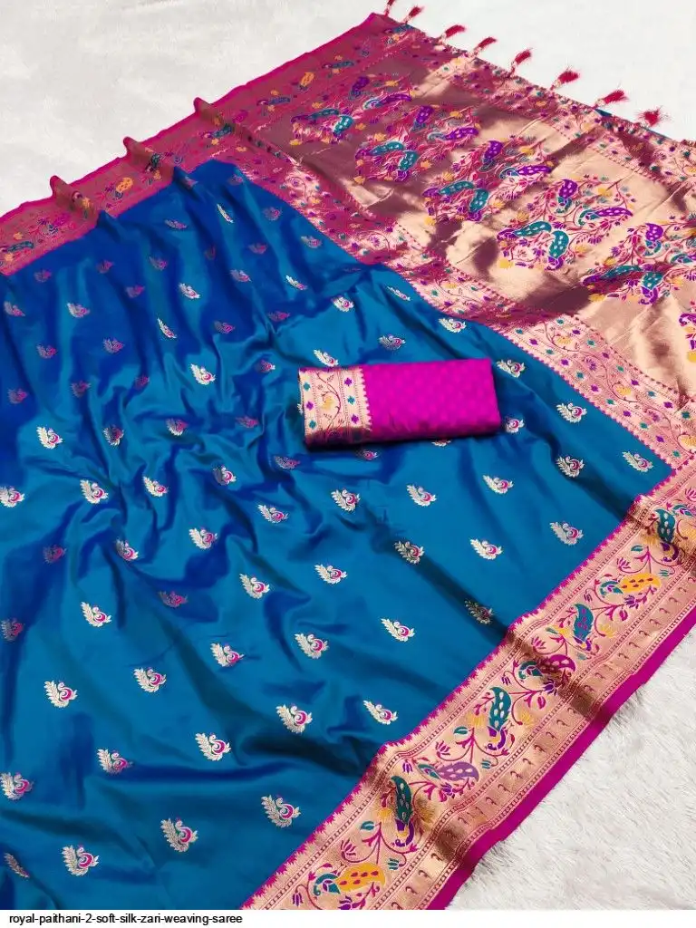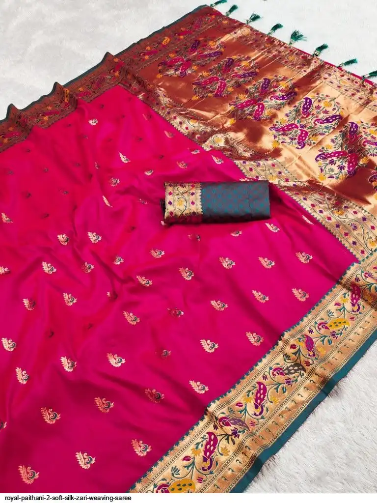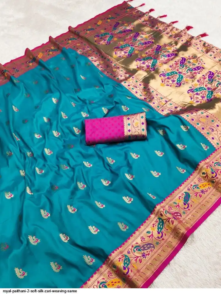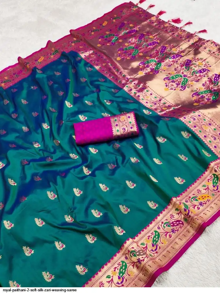 Saree :- Soft Pethani silk saree with zari weawing Meenakari motifs design and Meenakari weawing Rich pallu with Meenakari weawing peacock border & Tessels attached at Pallu end.