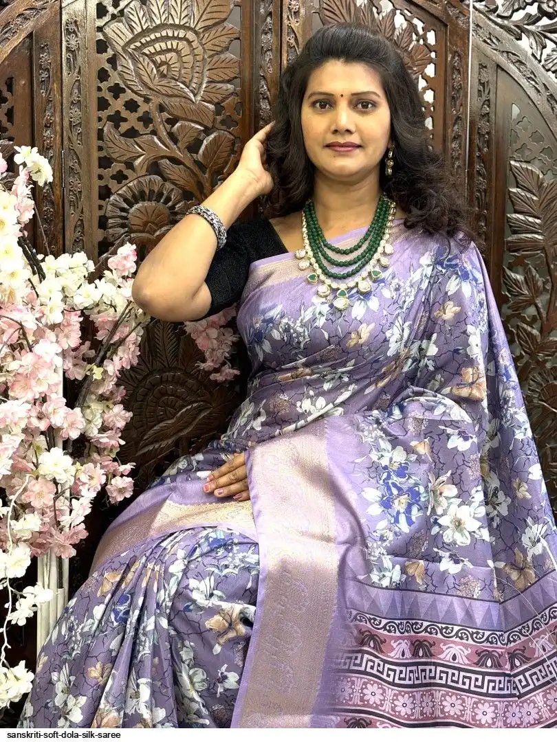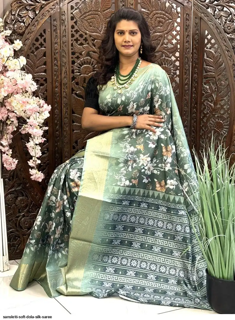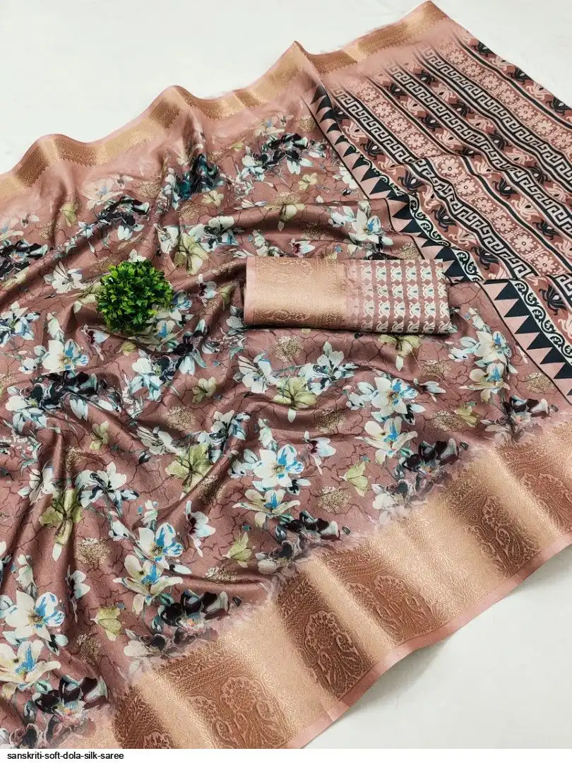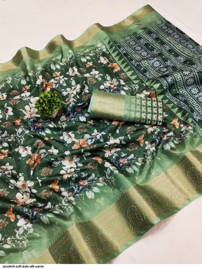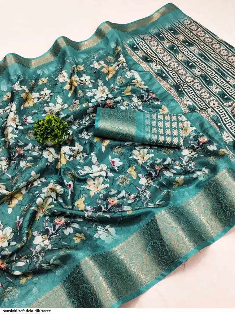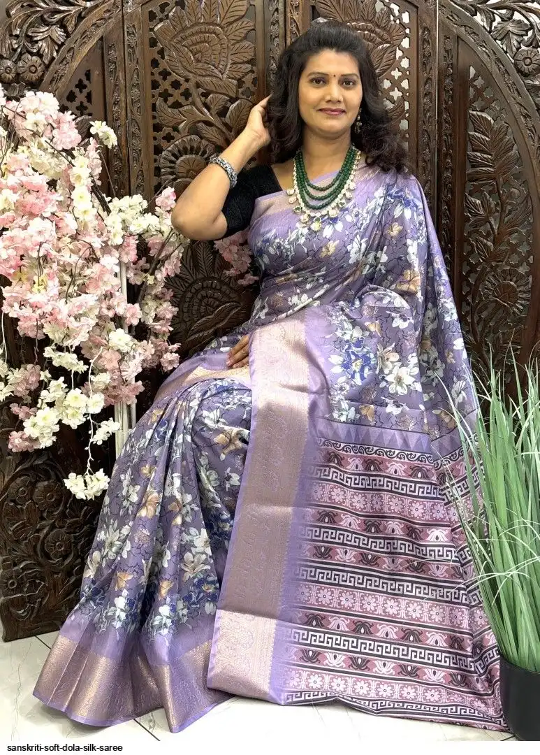 The very premium and rich quality soft Dola silk Flower Digital Printed sarees with Kanjivaram Border and contrast Digital Printed pallu