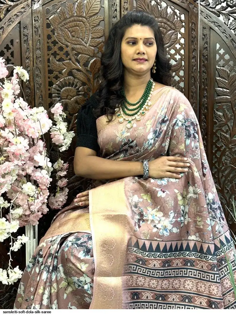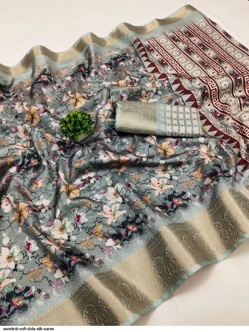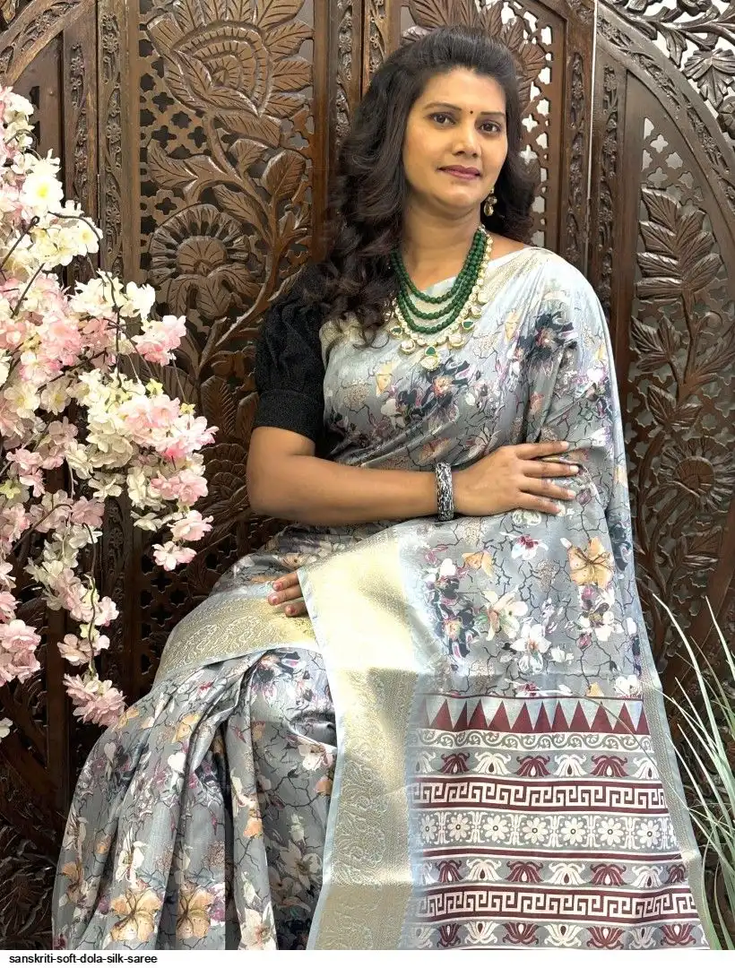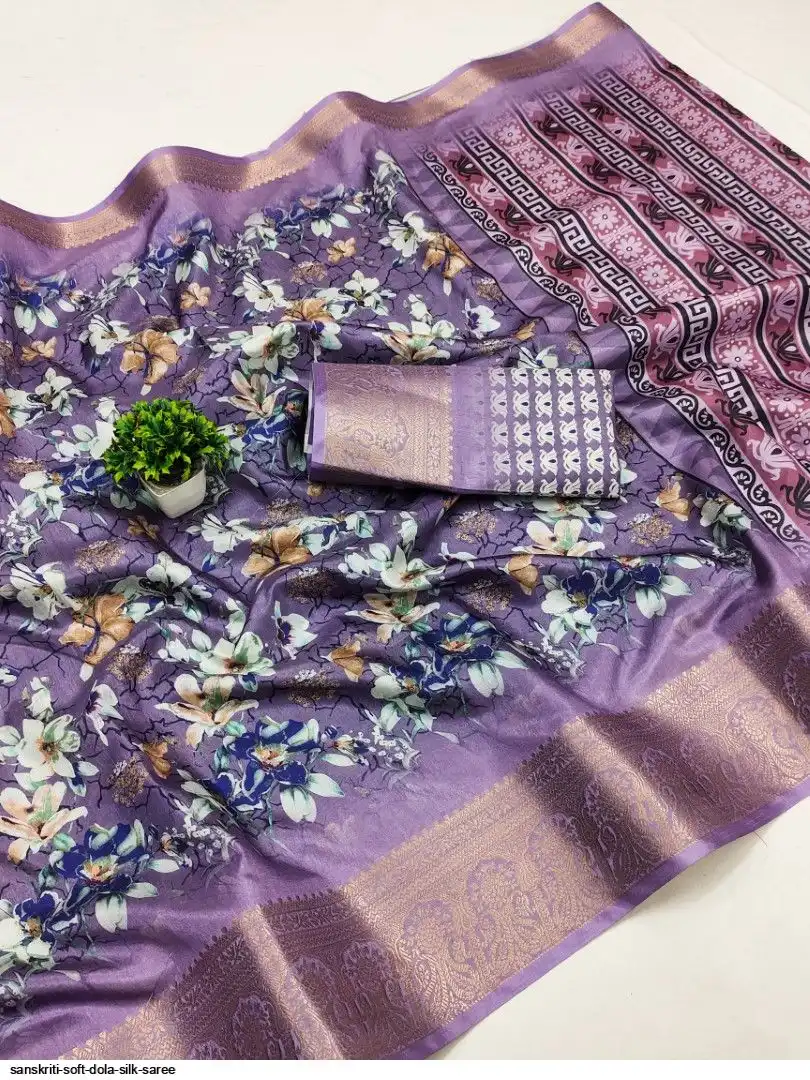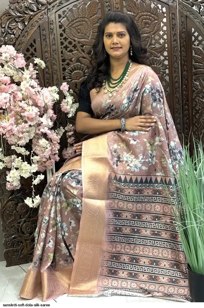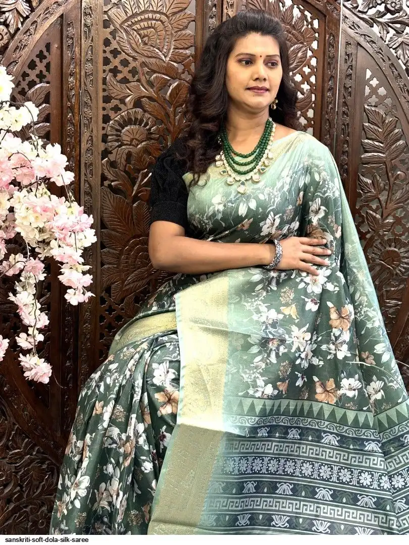 The very premium and rich quality soft Dola silk Flower Digital Printed sarees with Kanjivaram Border and contrast Digital Printed pallu