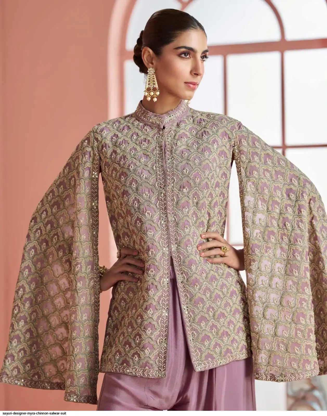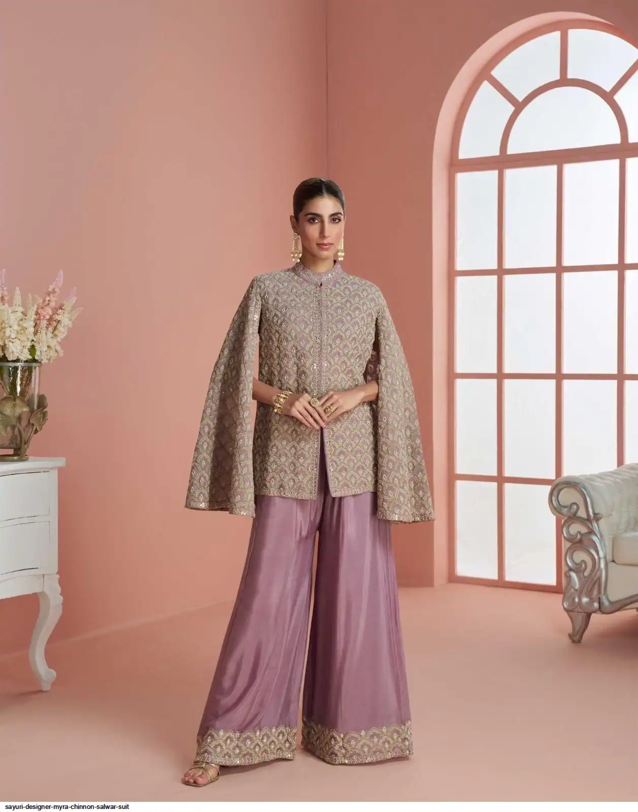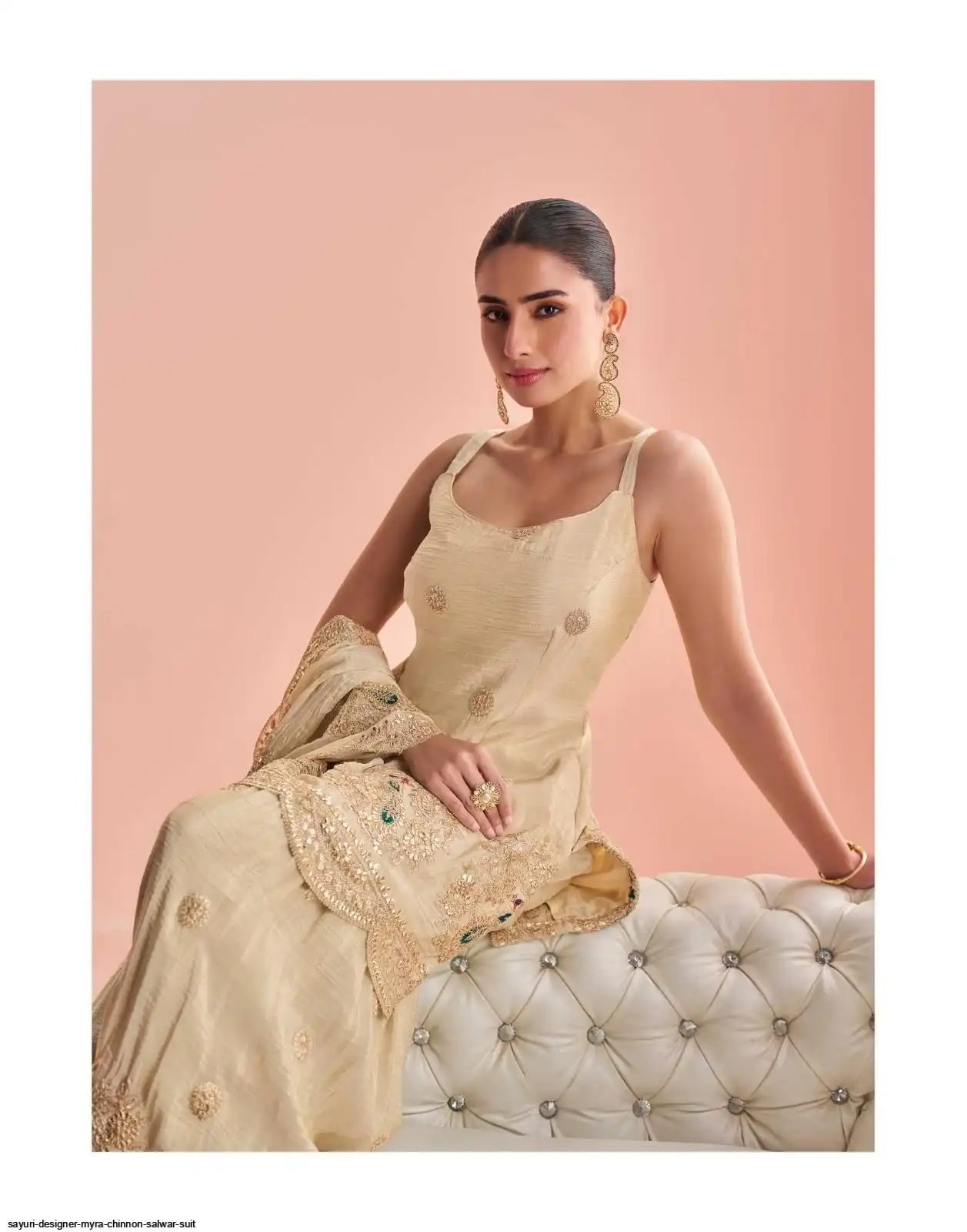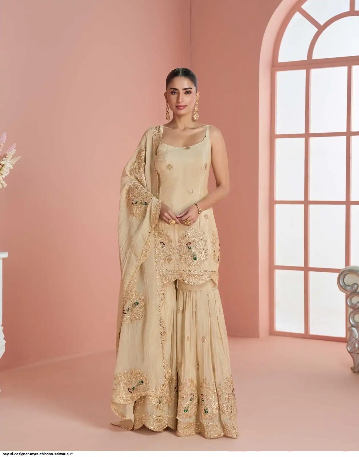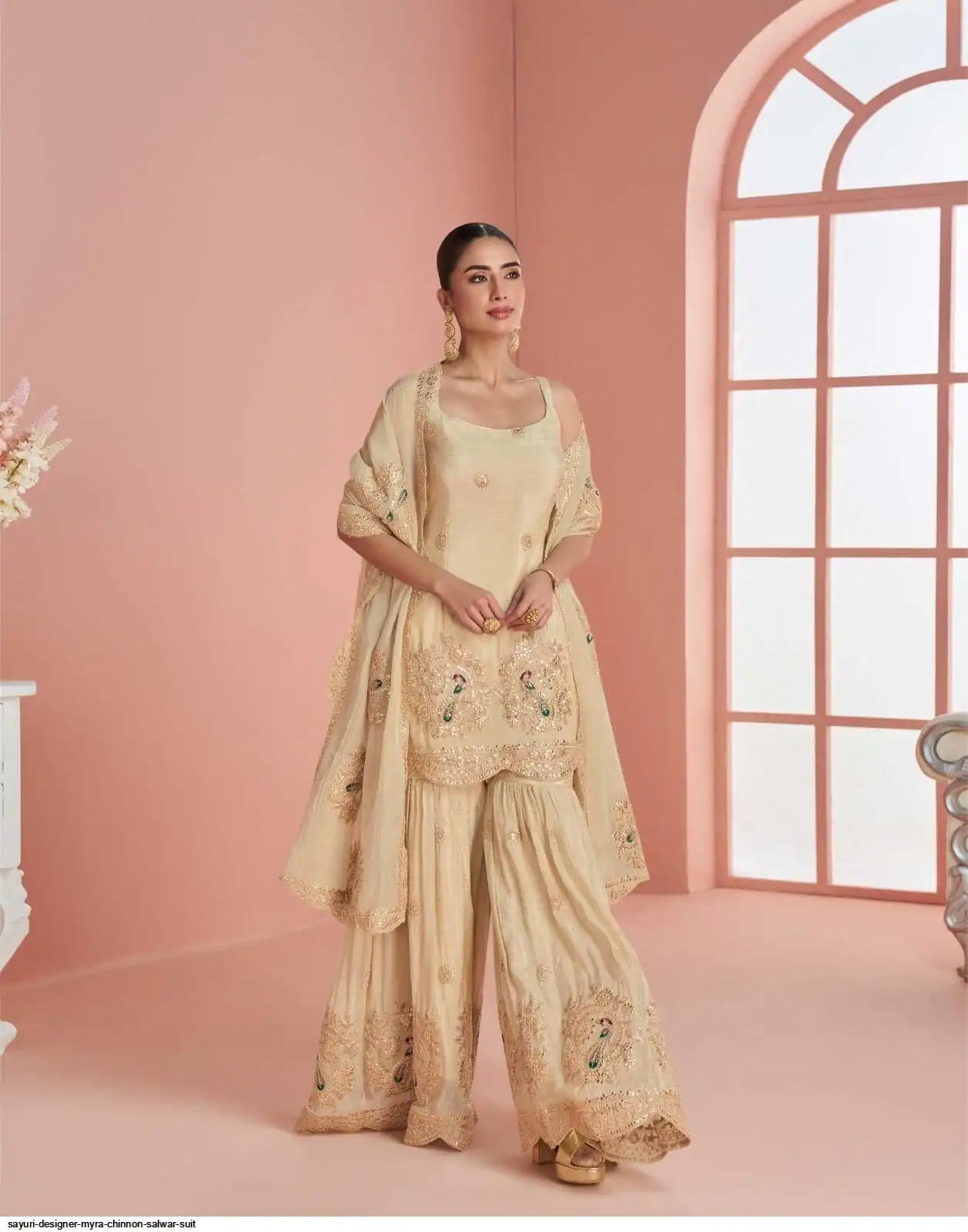 FABRIC - PREMIUM REAL CHINNON SILK / PREMIUM REAL SIMAR SILK ( WEDDING LOOK HEAVY EMBROIDERED TOP WITH GHARARA/PLAZZO AND DUPATTA )