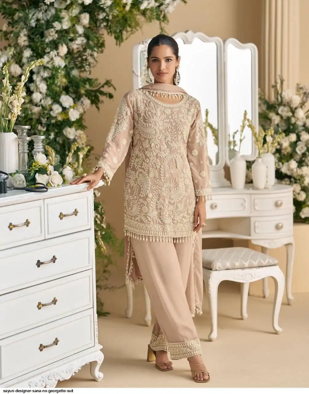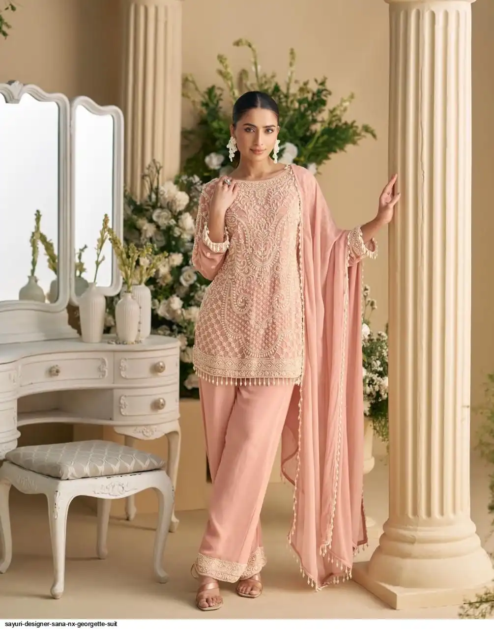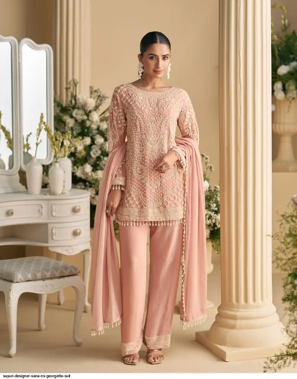 FABRIC - REAL PREMIUM GEORGETTE/PREMIUM NET( HEAVY EMBROIDERED BEADS WORK TOP WITH PLAZZO PANT AND DUPATTA )