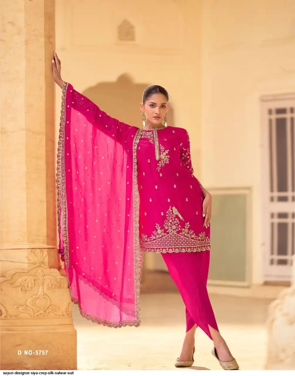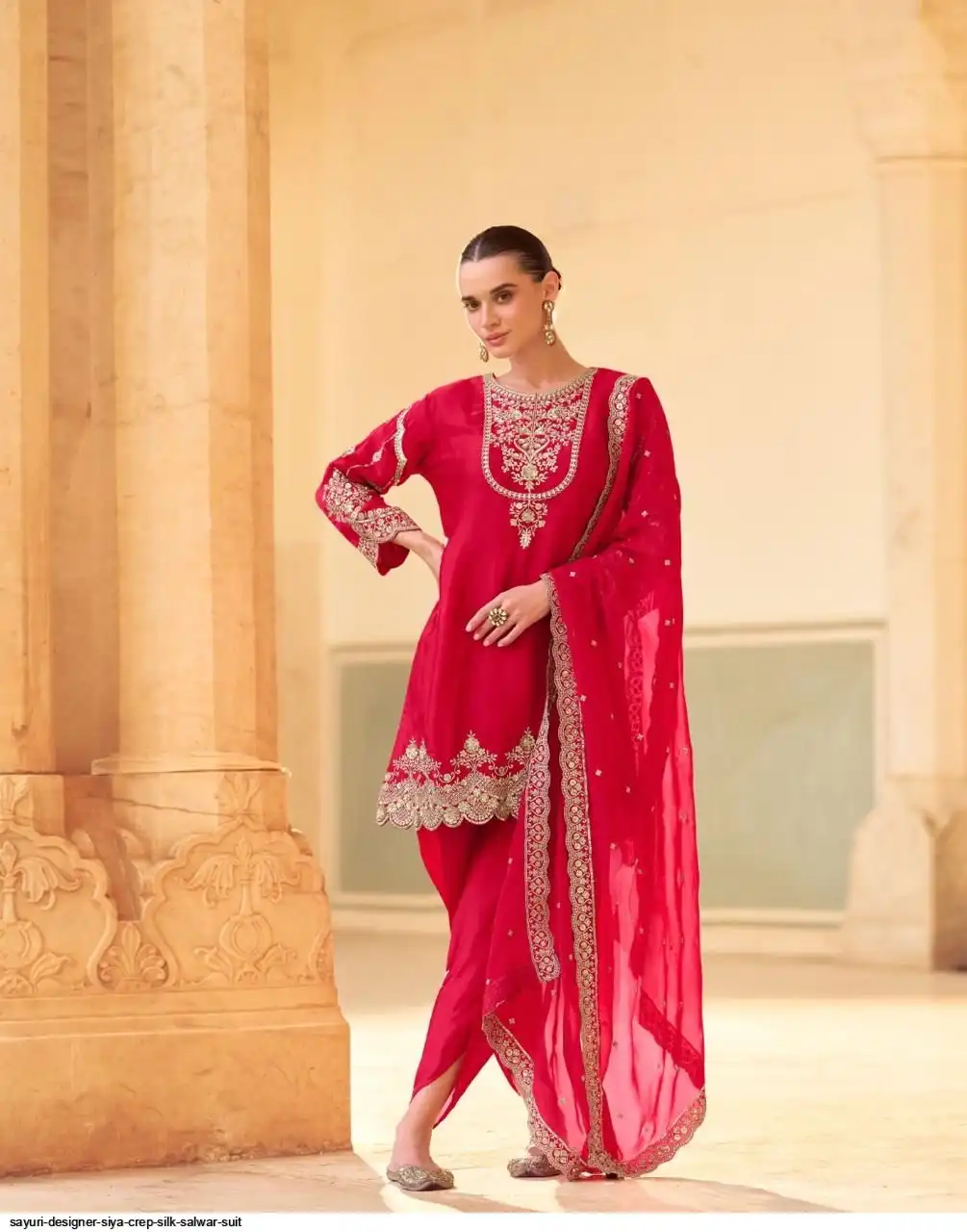 FABRIC - PREMIUM SOFT CREP SILK / PREMIUM ORGANZA SILK ( HEAVY LOOK PREMIUM SOFT CREP SILK EMBROIDERED TOP WITH DHOTI AND EMBROIDERED ORGANZA DUPATTA )