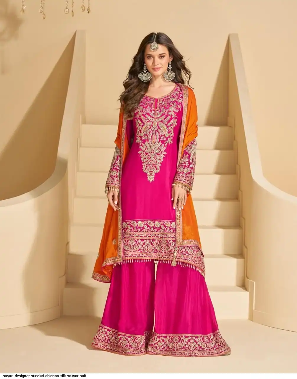 FABRIC - REAL PREMIUM CHINNON SILK( FULL HEAVY LOOK EMBROIDERED EMBELLISHED MIRROR WORK TOP WITH PLAZZO SHARARA AND EMBROIDERED DUPATTA )