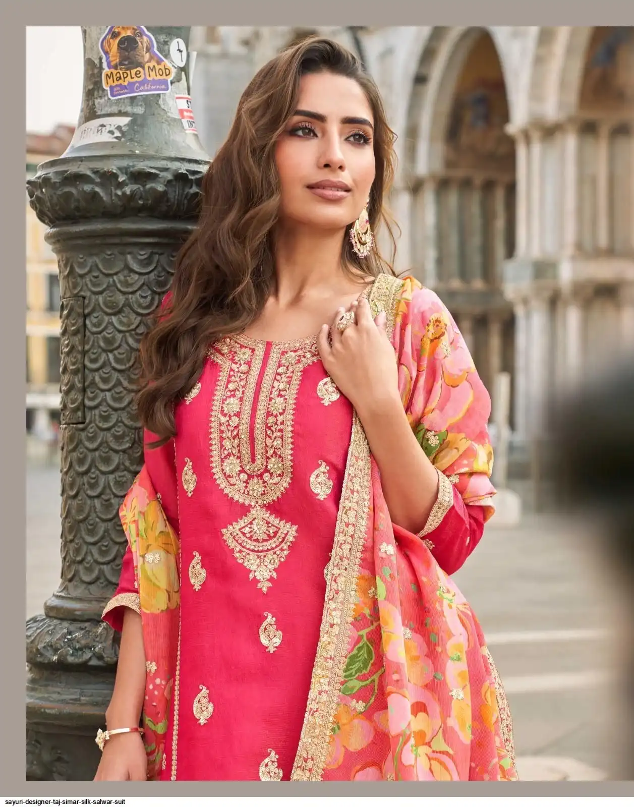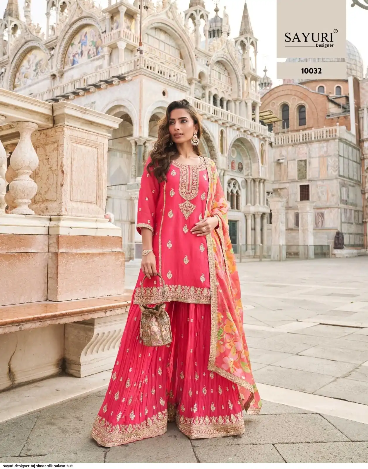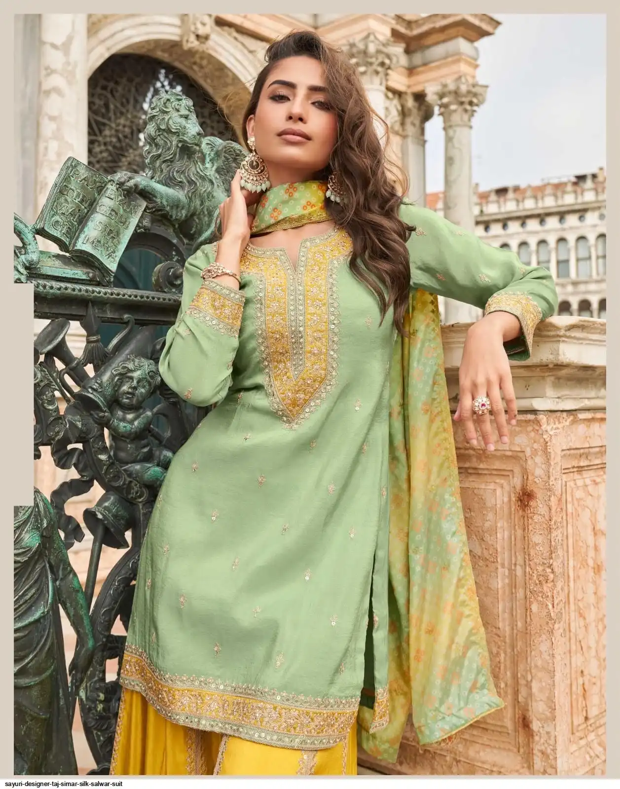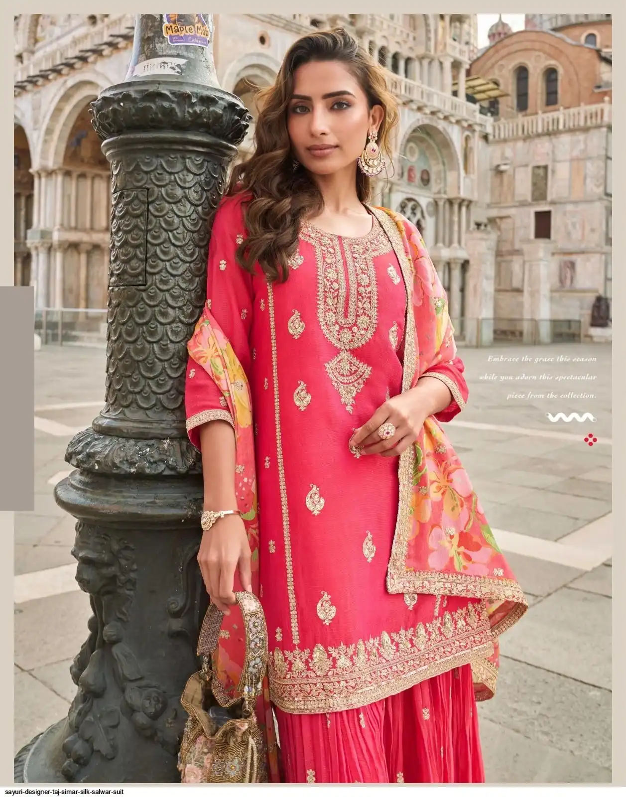 FABRIC - PREMIUM REAL SIMAR SILK / VISCOS JACQUARD SILK / REAL CHINON SILK ( HEAVY FESTIVE LOOK TOP WITH FRONT AND BACK EMBROIDERED SHARARA WITH DIGITAL EMBROIDERED DUPATTA )