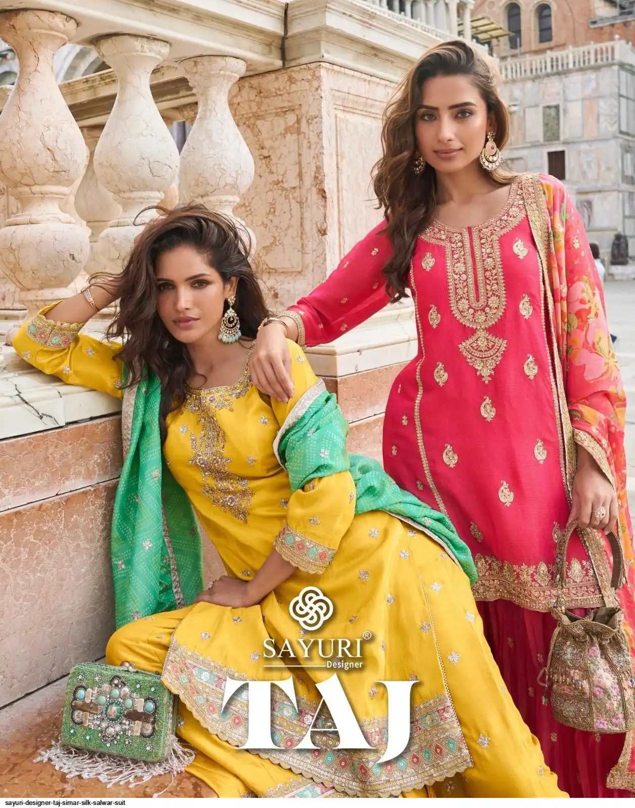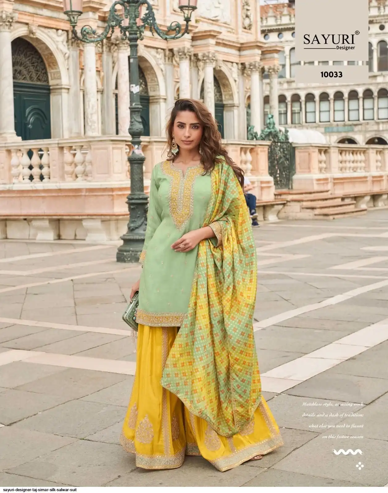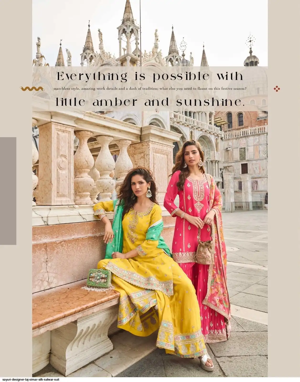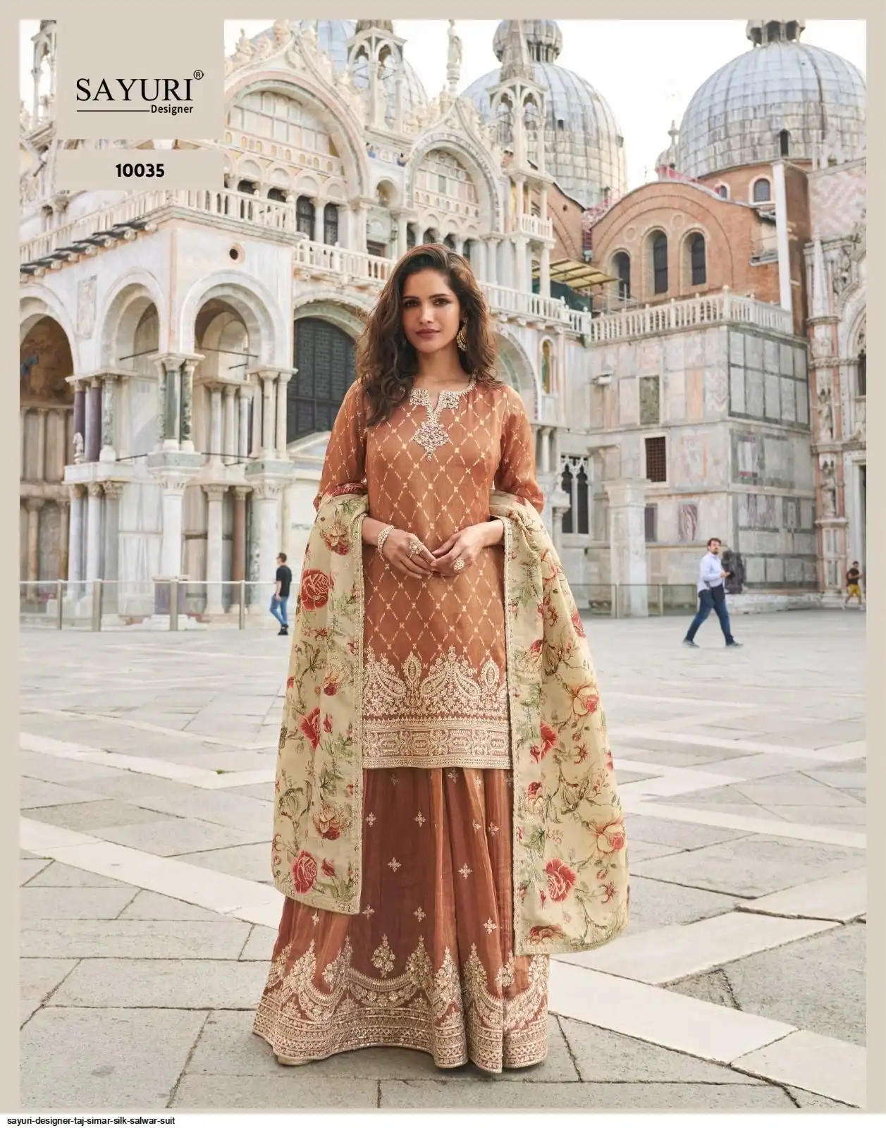 FABRIC - PREMIUM REAL SIMAR SILK / VISCOS JACQUARD SILK / REAL CHINON SILK ( HEAVY FESTIVE LOOK TOP WITH FRONT AND BACK EMBROIDERED SHARARA WITH DIGITAL EMBROIDERED DUPATTA )