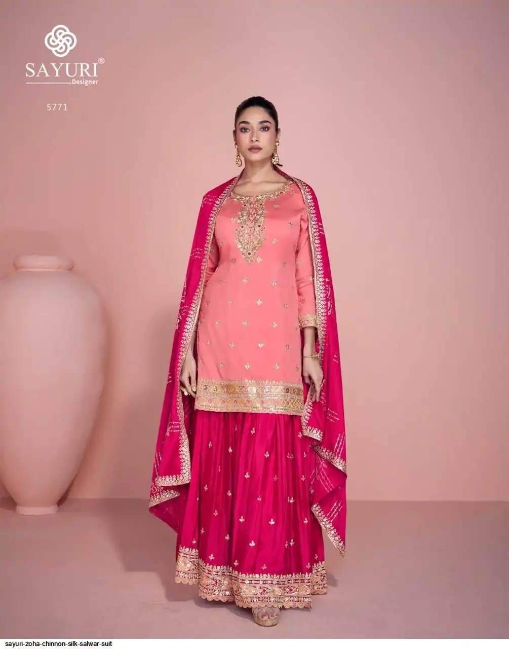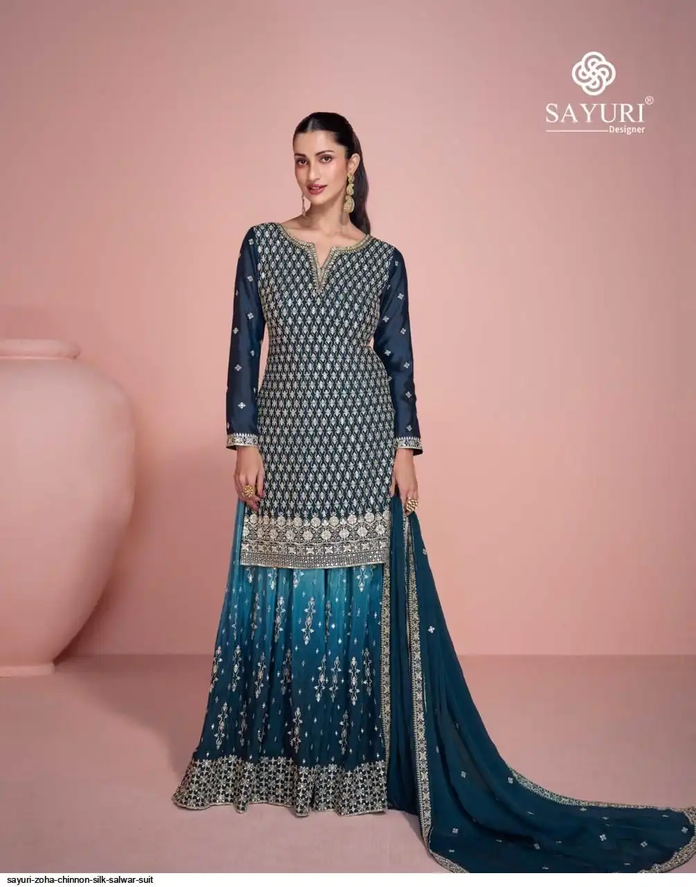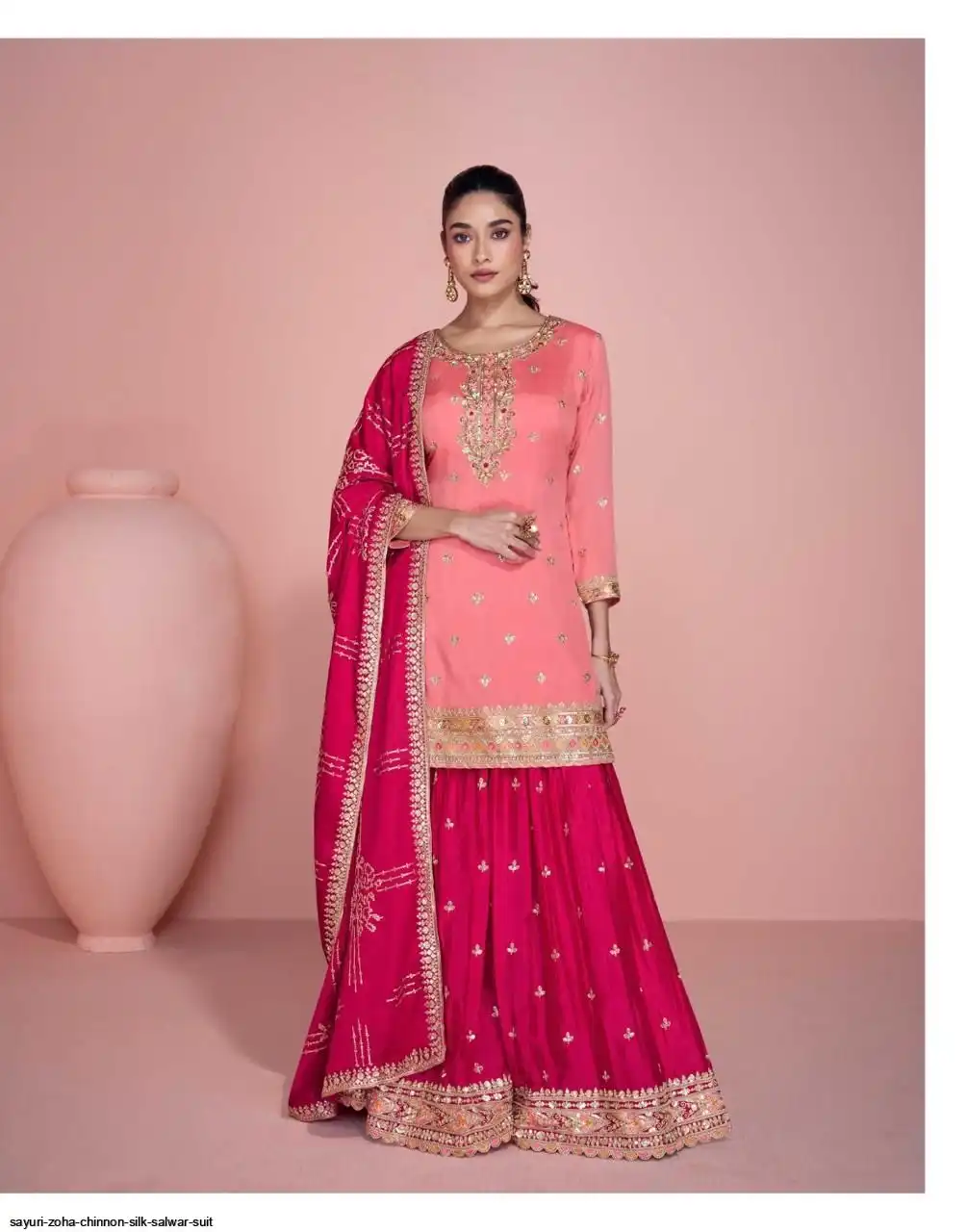 FABRIC - PREMIUM REAL CHINON SILK / REMIUM SILK ( HEAVY LOOK EMBROIDERED CHİNON SILK TOP WITH FRONT AND BACK EMBROIDERD SHARARA WITH EMBROIDERED DUPATTA )