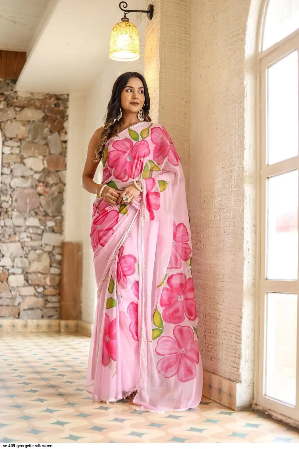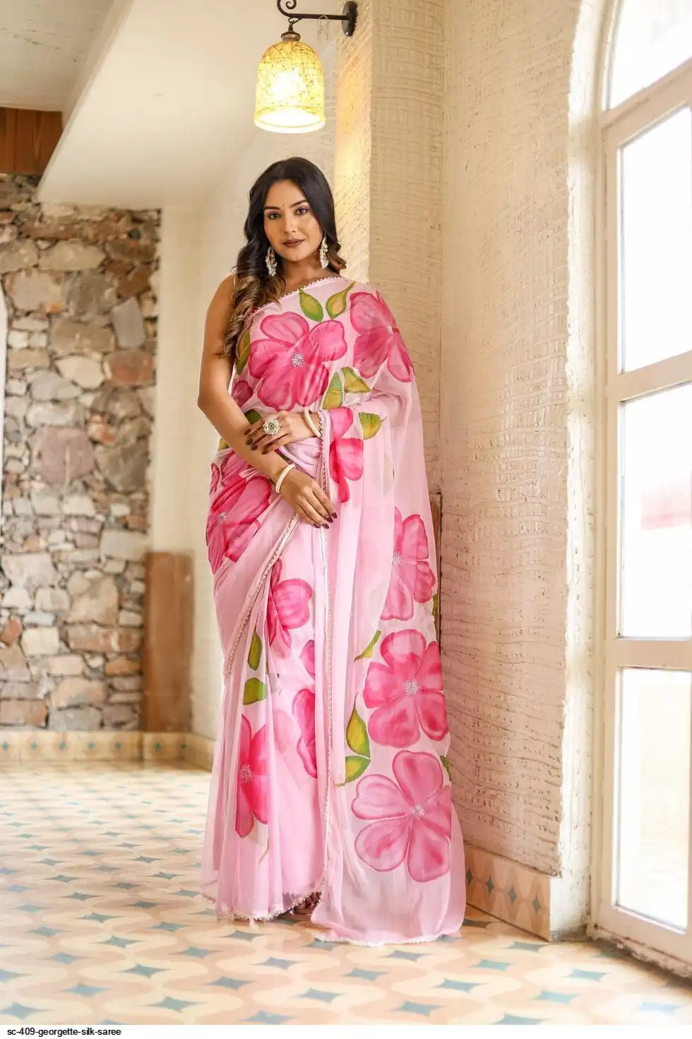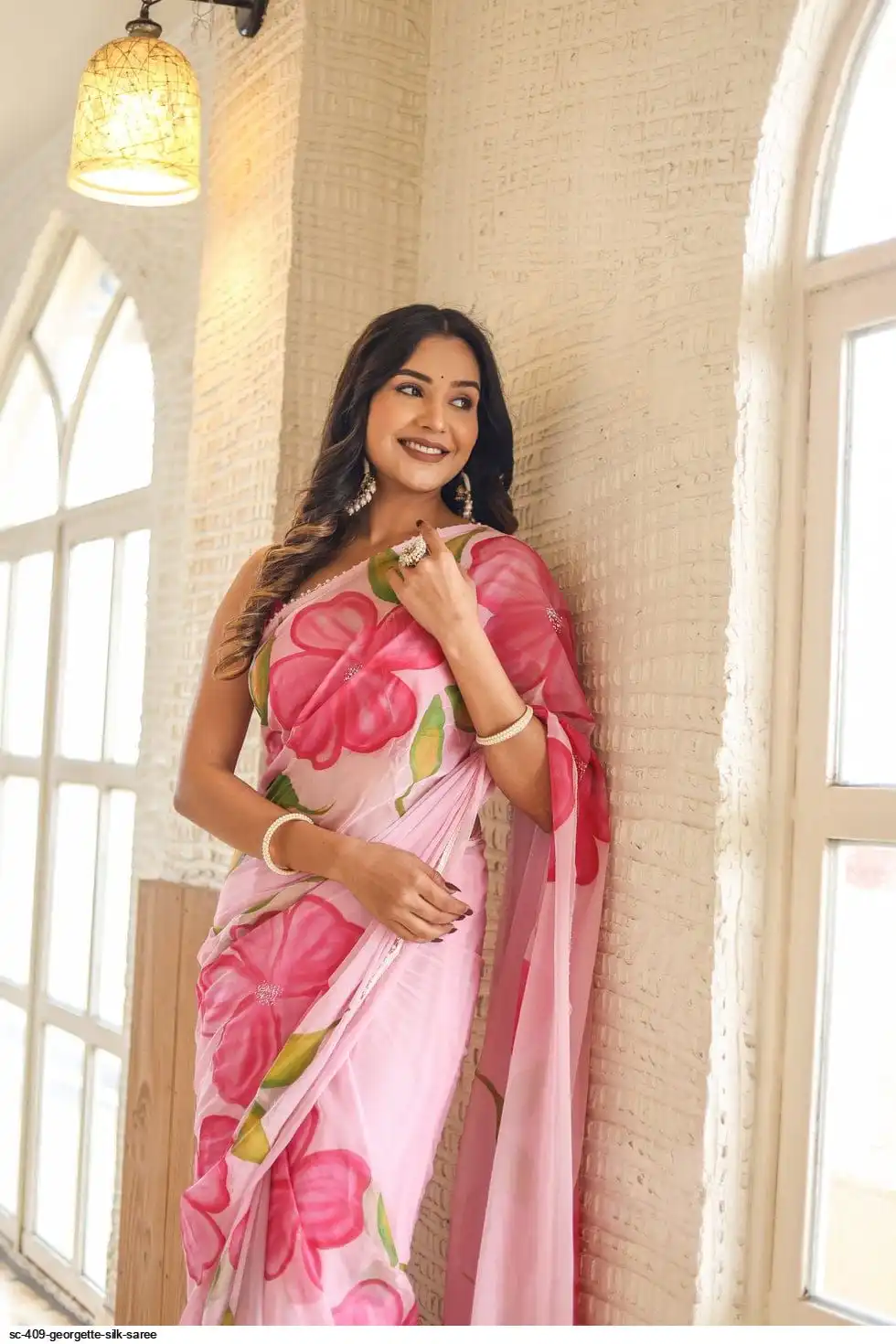 श्रीji Creation is now coming up with New Design pure soft Georgette silk with beautiful pink colour flower design on all over the body and pallu Ready To Wear saree beautiful colour combination All over the body