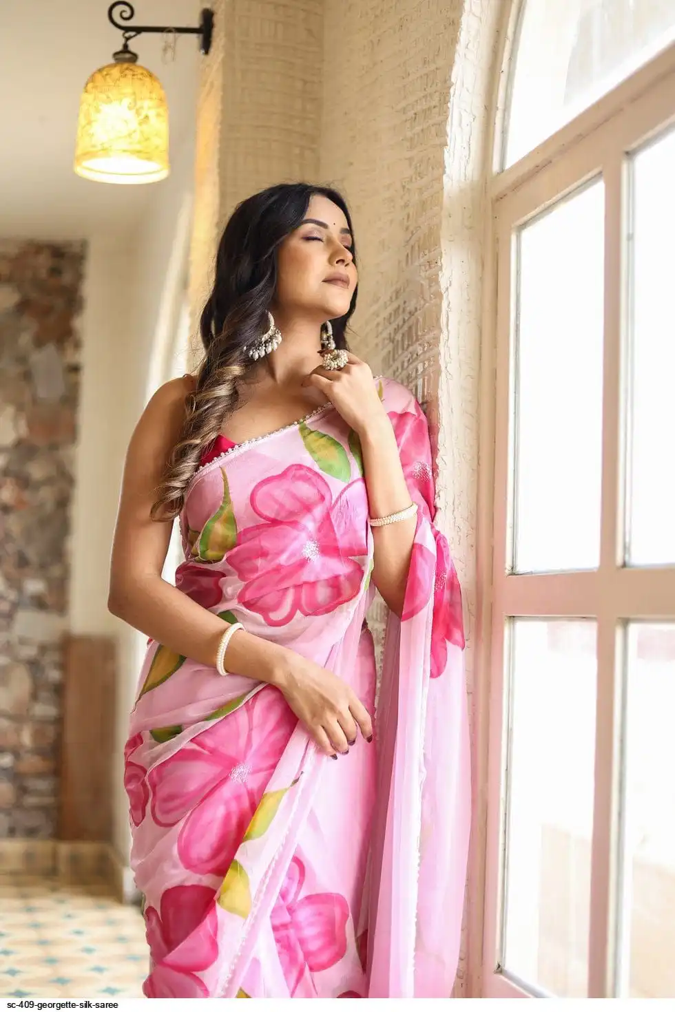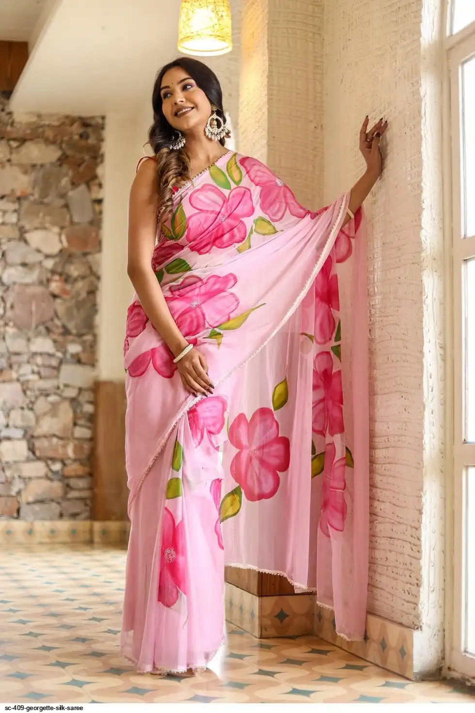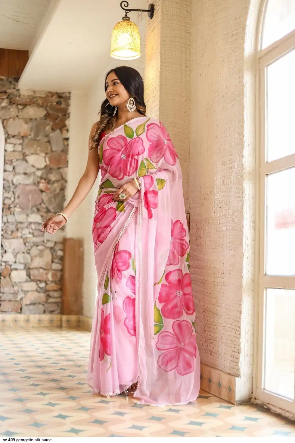 श्रीji Creation is now coming up with New Design pure soft Georgette silk with beautiful pink colour flower design on all over the body and pallu Ready To Wear saree beautiful colour combination All over the body