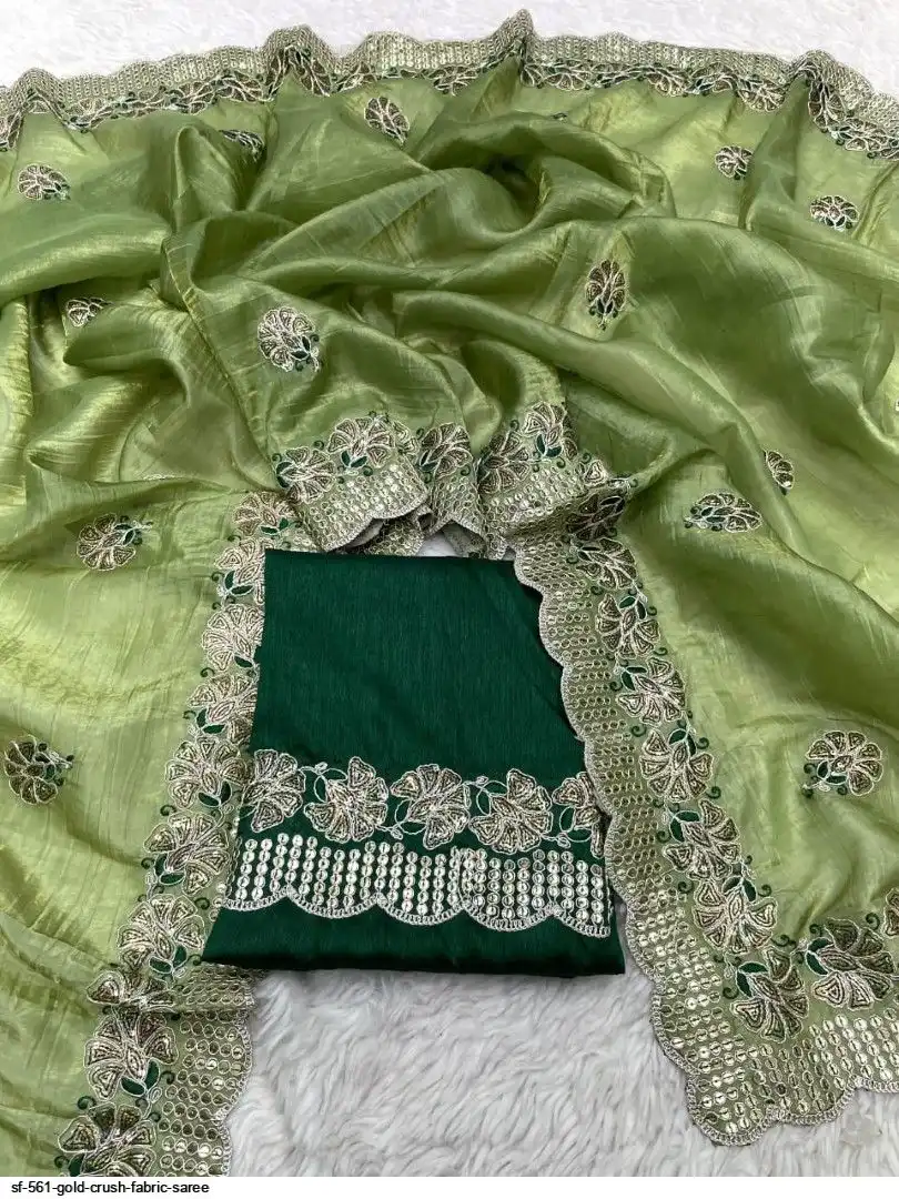 *Fabric : Gold Crush Fabric With Coding Sequence Embroidery Work (C-Pallu) Border And Butta In All Over Saree with work Broder nd aarco