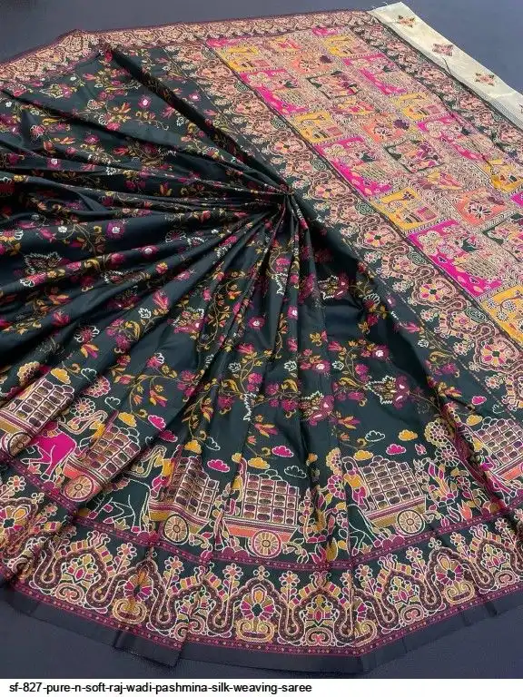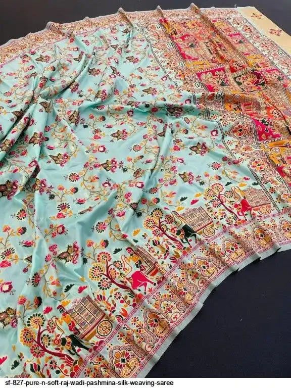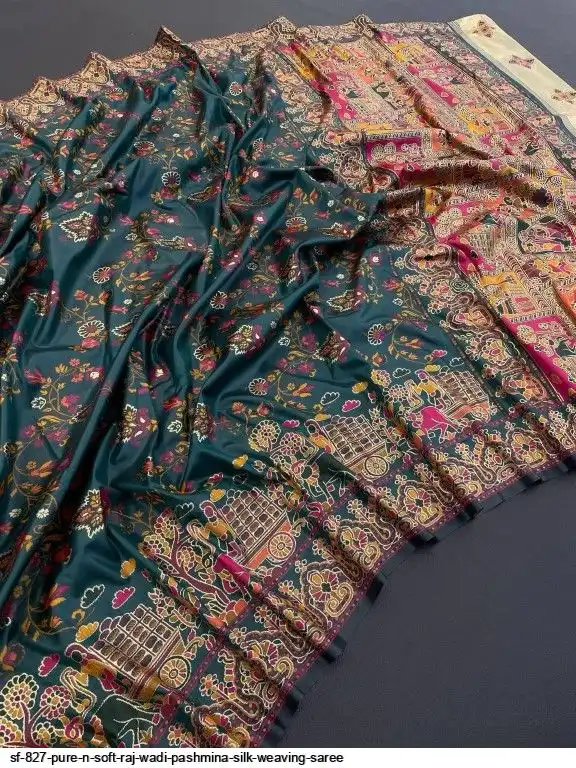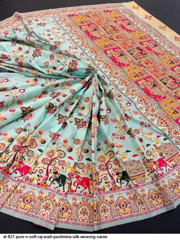 Pure n Soft Raj wadi Pashmina Silk Weaving Saree With Kashmiri Thread Wooven Pallu Having With Heavy Raj wadi N Zari Weaving Border With Running Butti Blouse