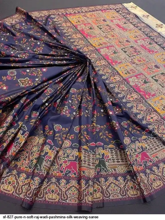Pure n Soft Raj wadi Pashmina Silk Weaving Saree With Kashmiri Thread Wooven Pallu Having With Heavy Raj wadi N Zari Weaving Border With Running Butti Blouse