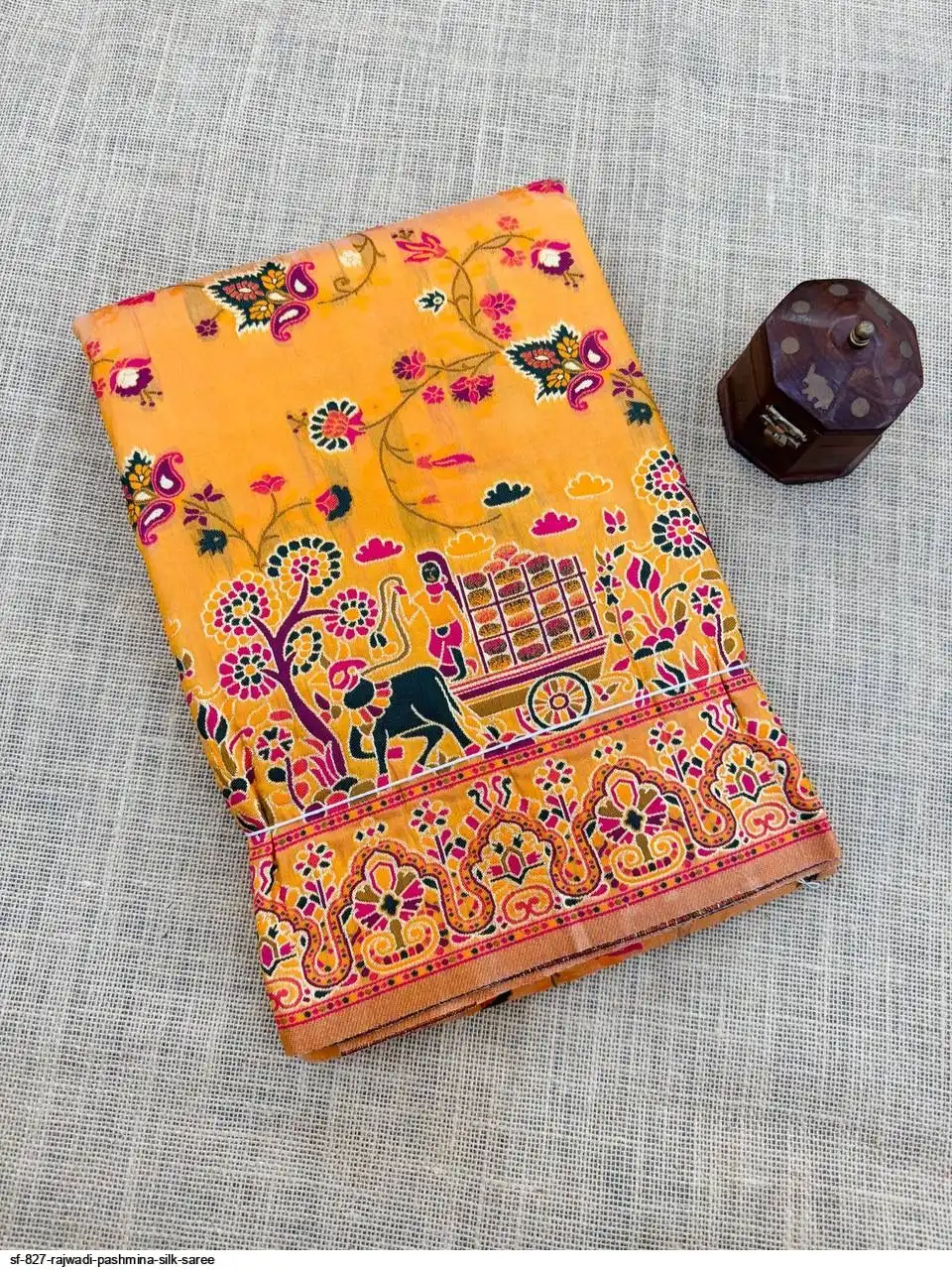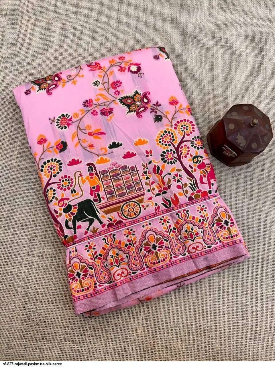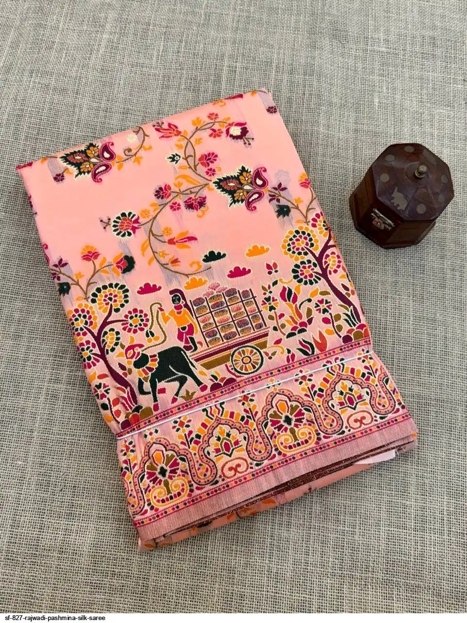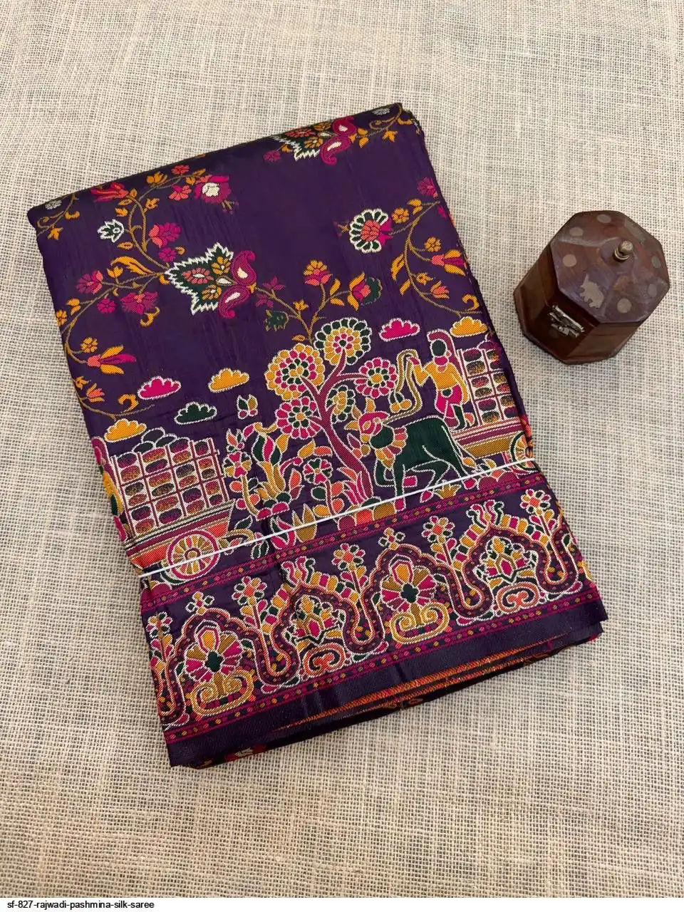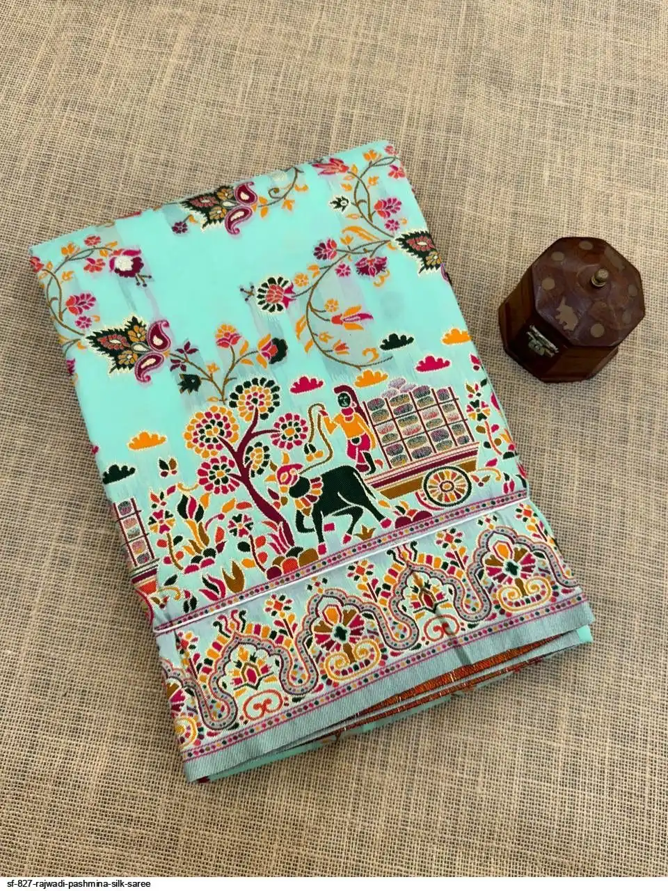 Pure n Soft Rajwadi Pashmina Silk Weaving Saree With Kashmiri Thread Wooven Pallu Having With Heavy Rajwadi N Zari Weaving Border With Running Butti Blouse