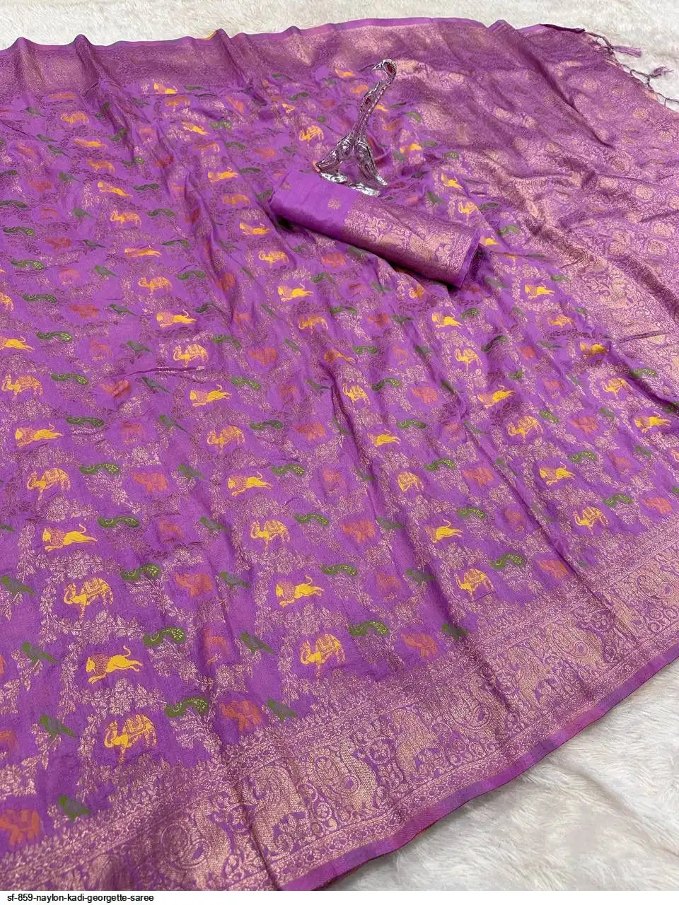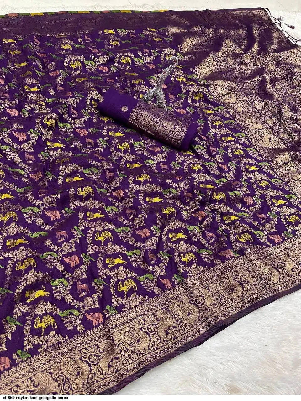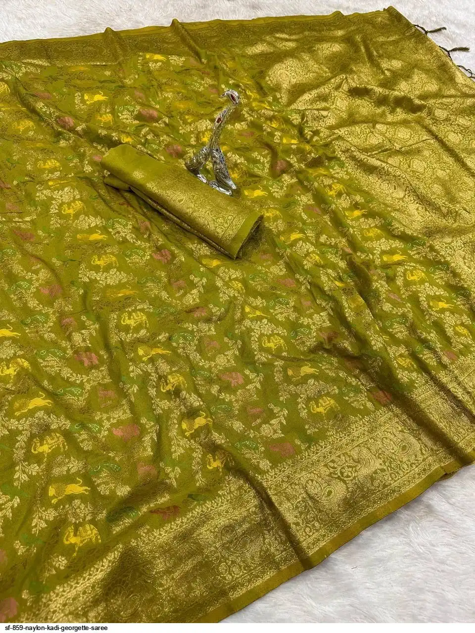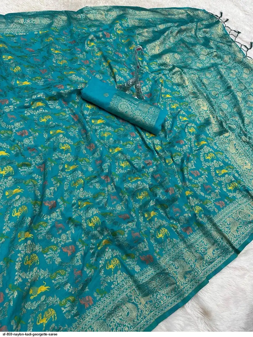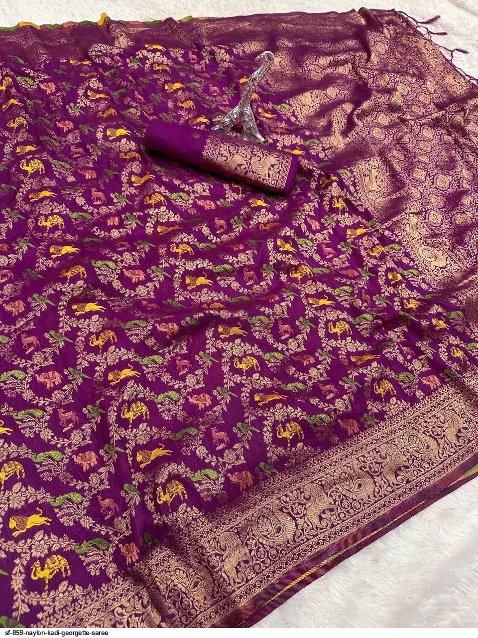 Pure Naylon kadi Creap Georgette jangal theem meenakari jaqurad weveing body ,border with Rich pallu