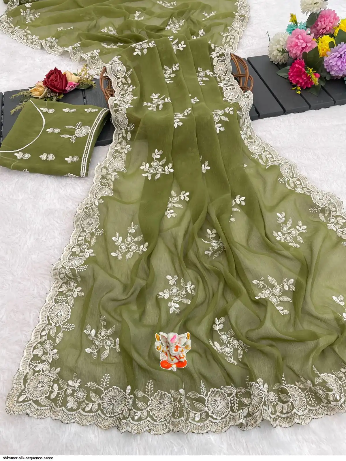 SAREES FABRIC.:- Shimmer silk with sequence embroidery work and beautiful arc cutting border