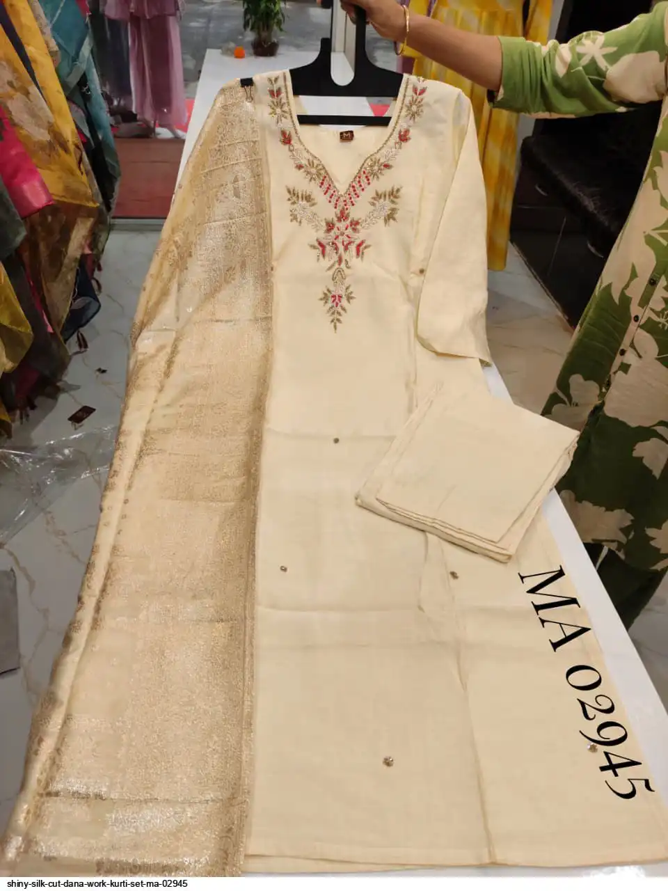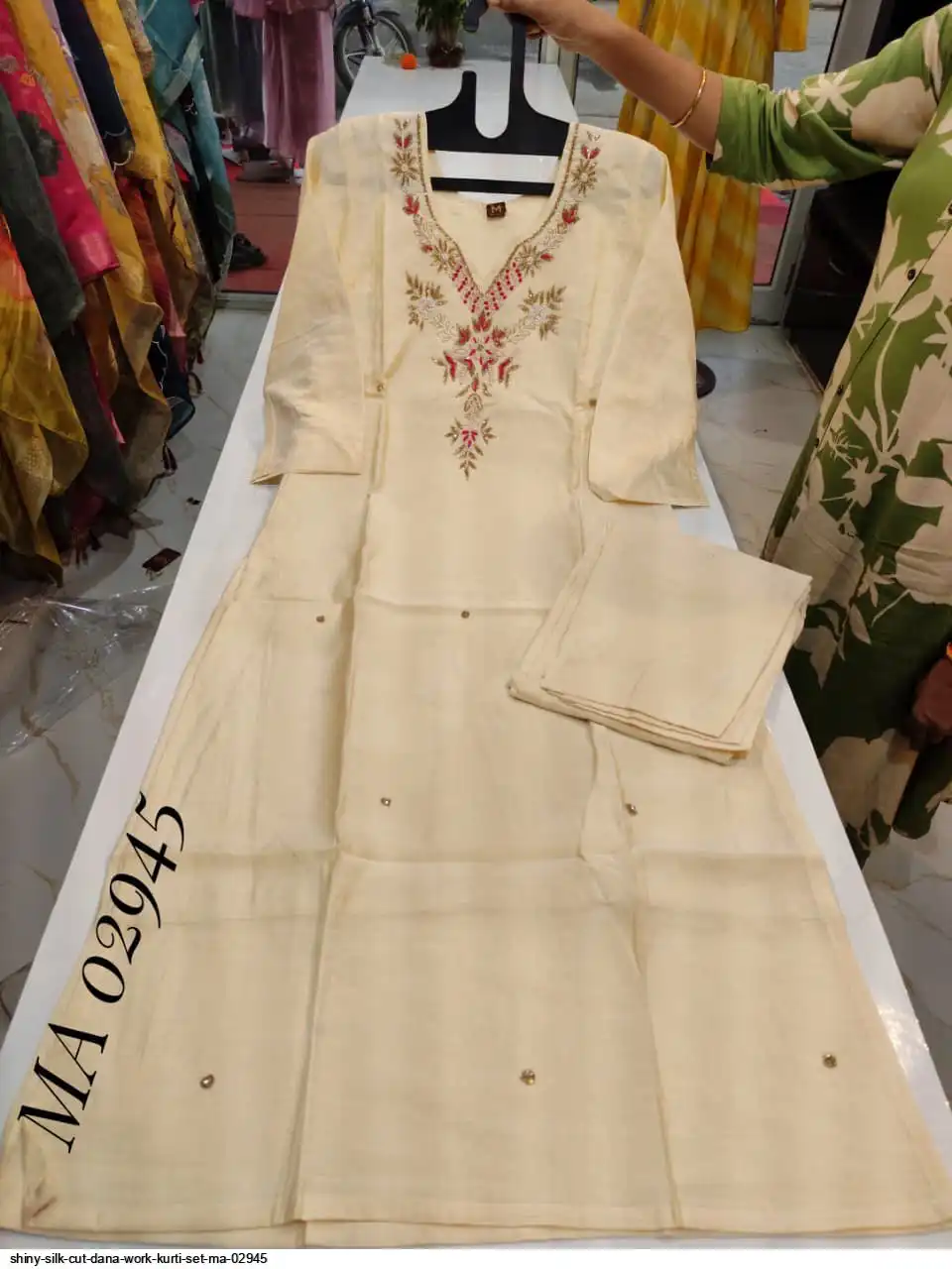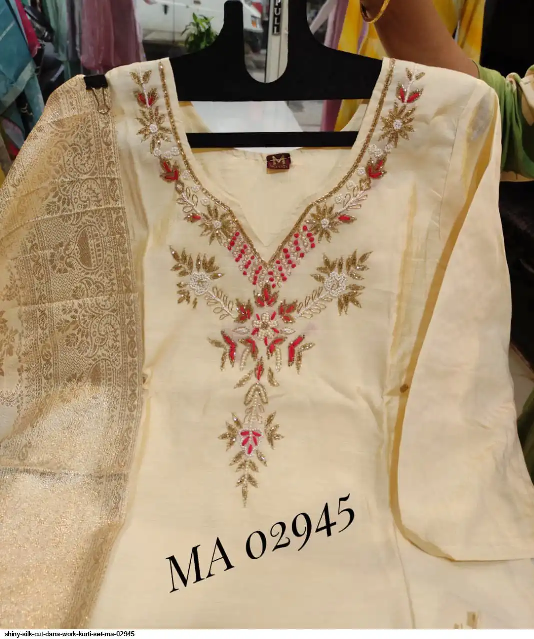 top - shiny silk straight kurti with moti cutdana work on yoke.