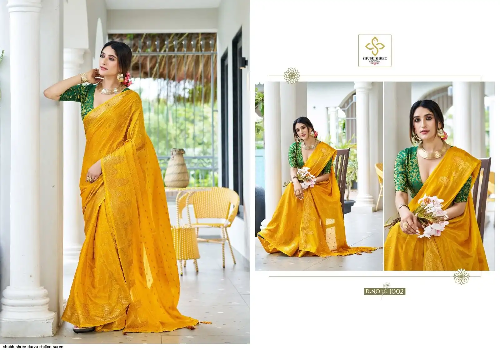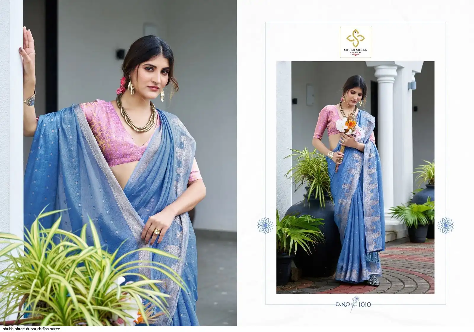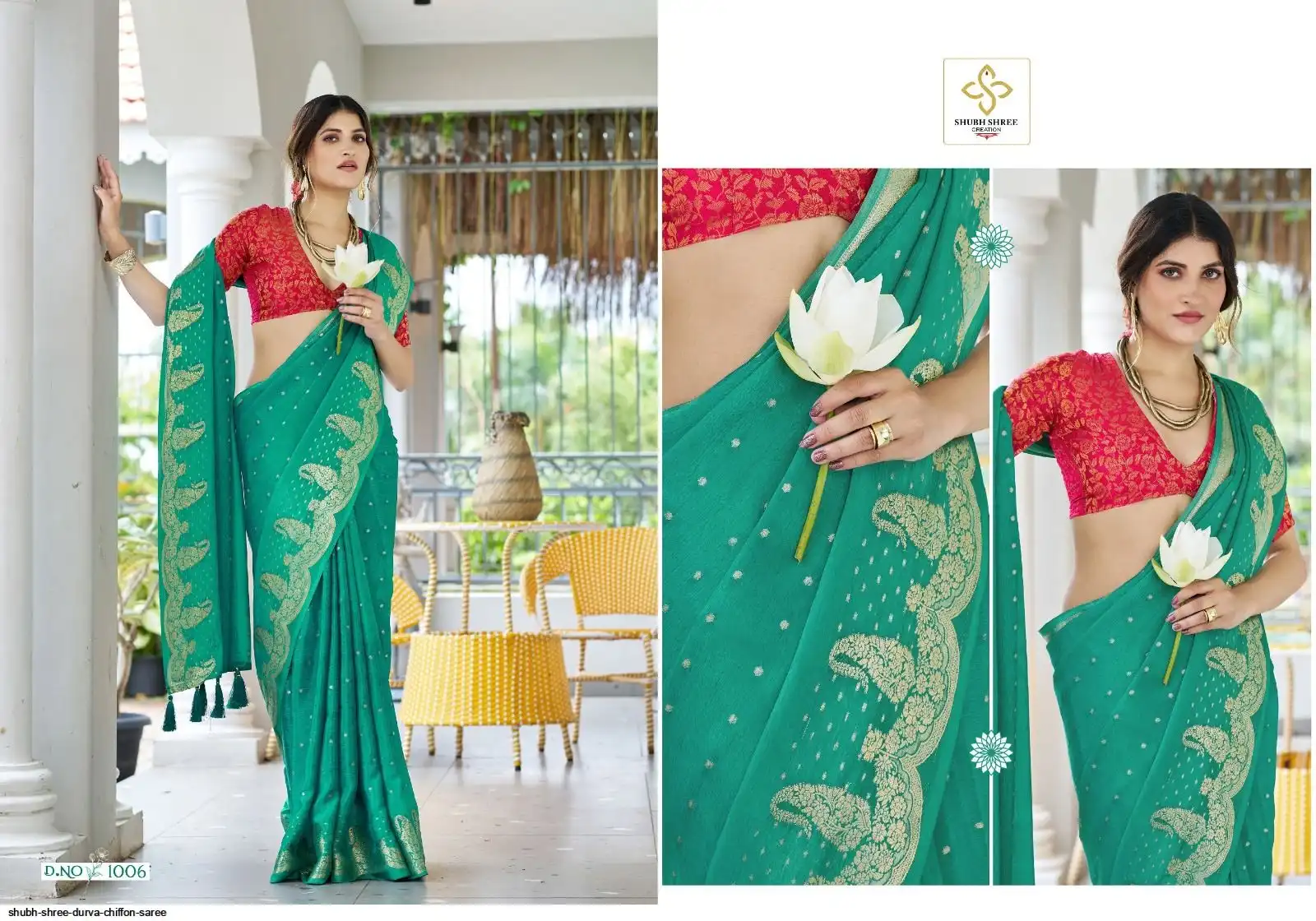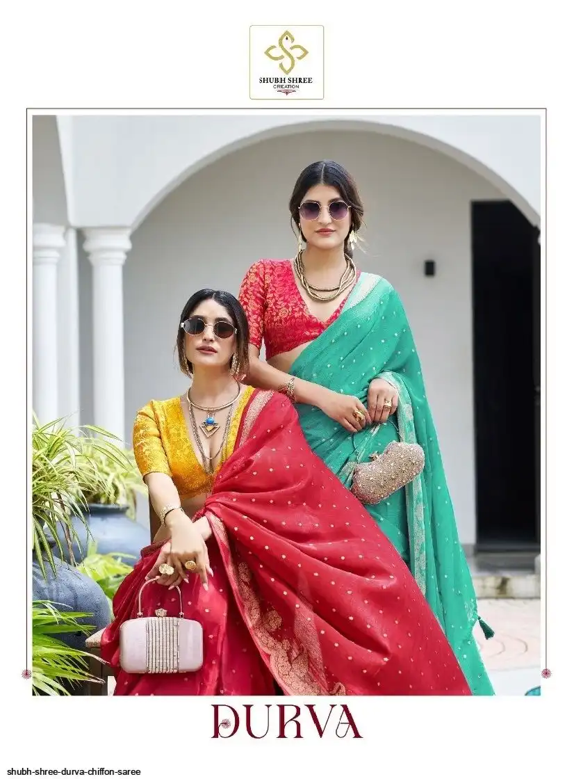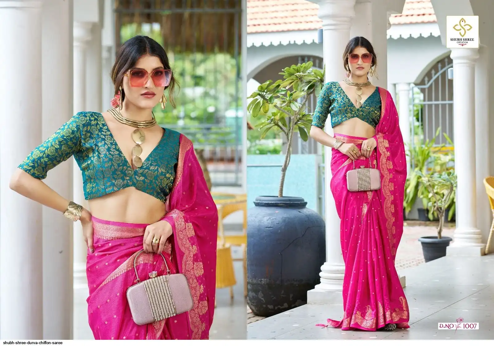 FABRIC - ALFINO CHIFFON JACQUARD BORDER , BUTTY WITH NYLON DYABLE JACQUARD BLOUSE , WITH SPRING TUSSELLS , EXCLUSIVE DYING FRESH BRIGHT COLOUR RANGE